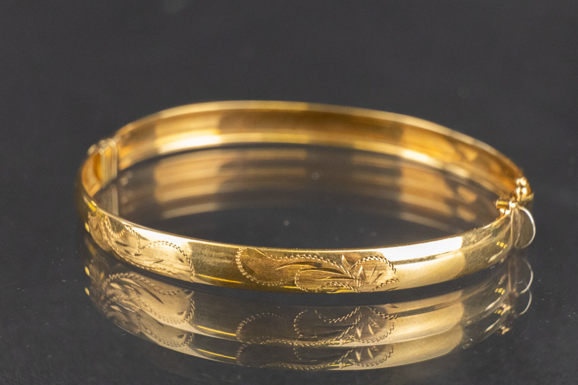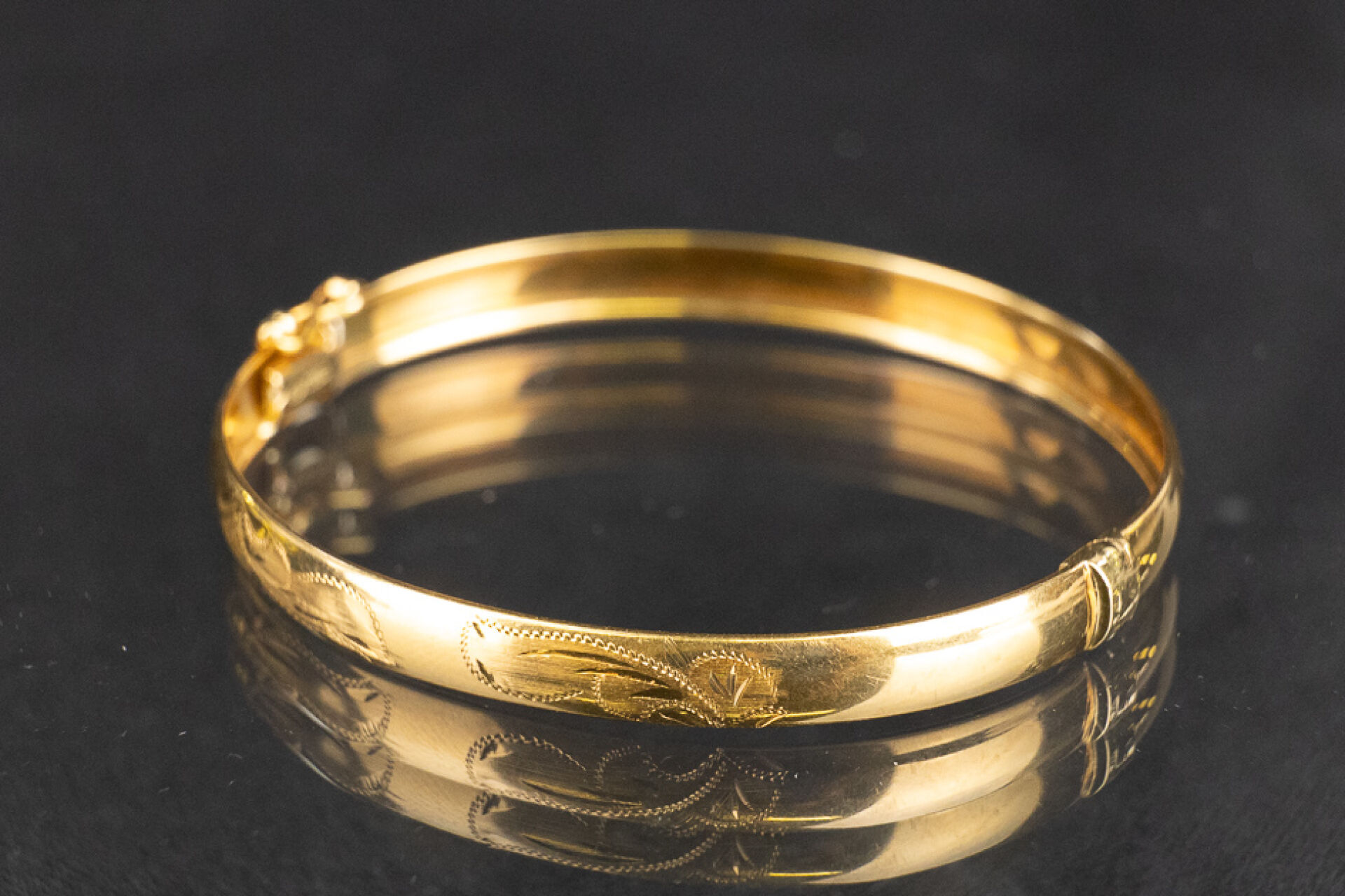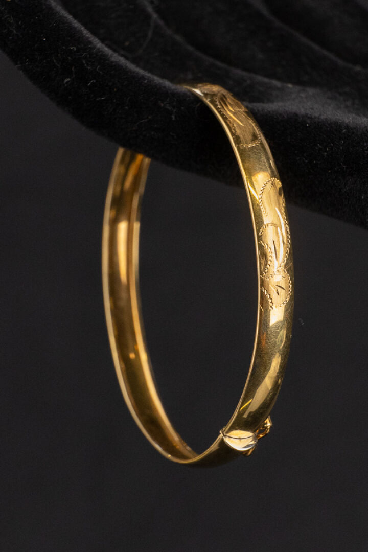 Bracelet jonc en or jaune 18k (750 millièmes), décor filigrané, huit de sécurité. Poids : 9.43 gr