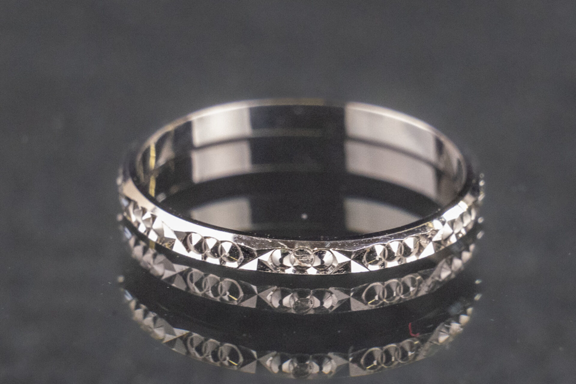 Alliance en or blanc 18k (750 millièmes) à motifs de trois picots alternés. Poids : 1.3 gr