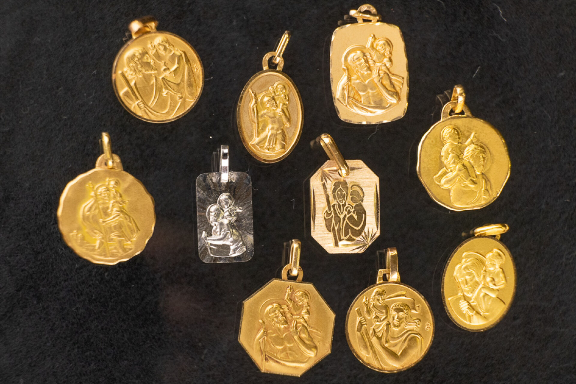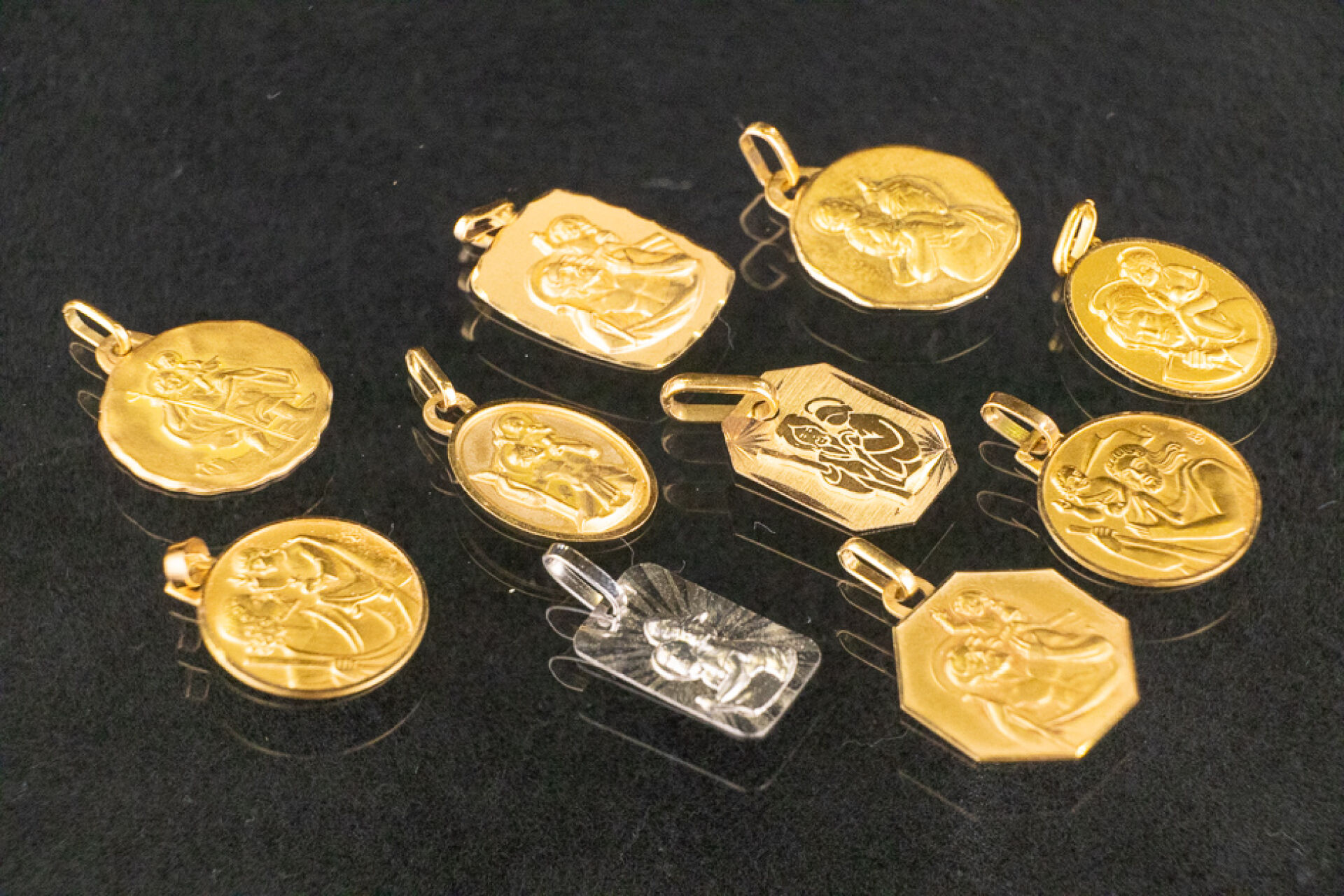 Ensemble de dix médailles de baptême en or jaune et or blanc pour une 18k (750 millièmes) figurant saint Christophe. Poids total ; 14.8 gr