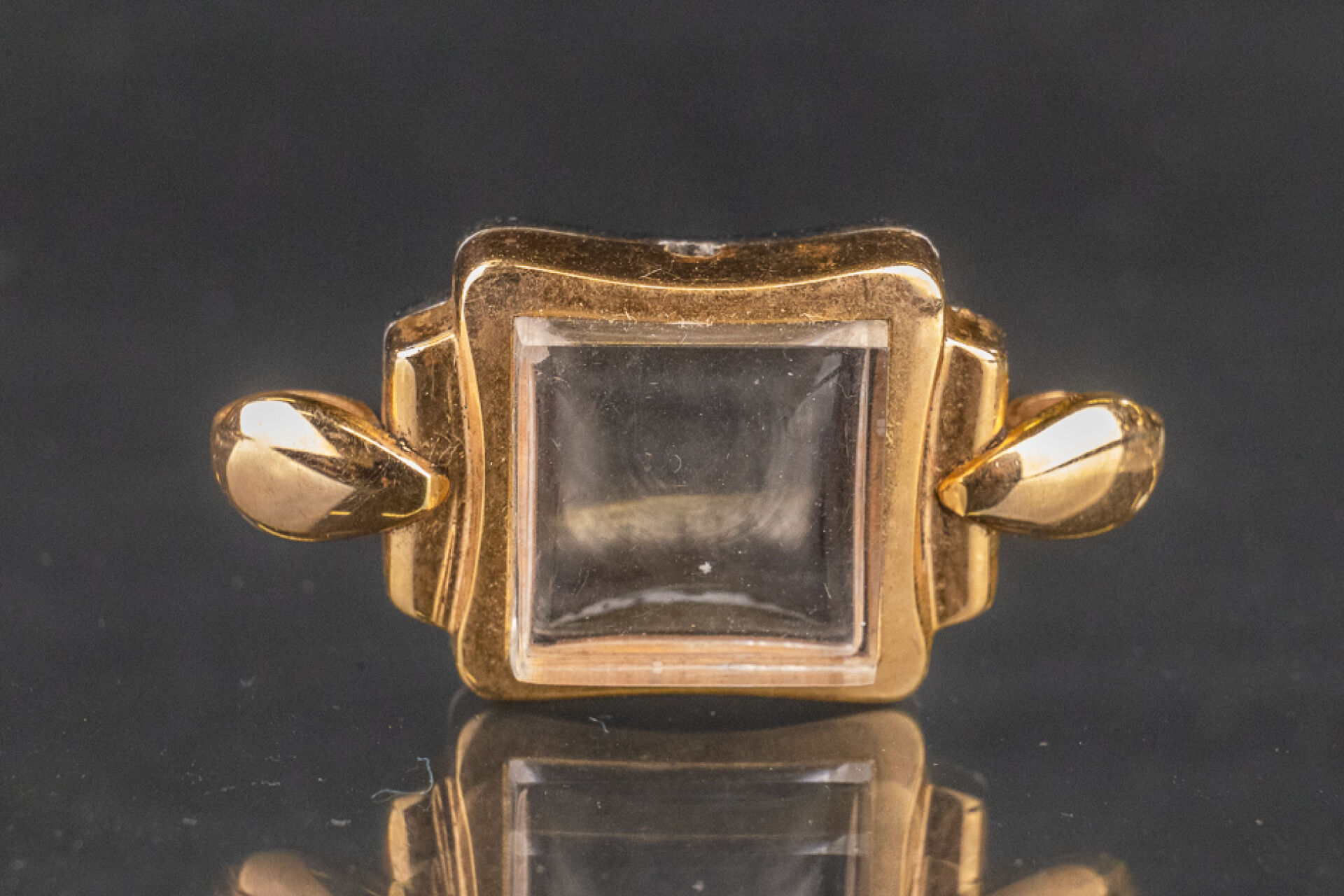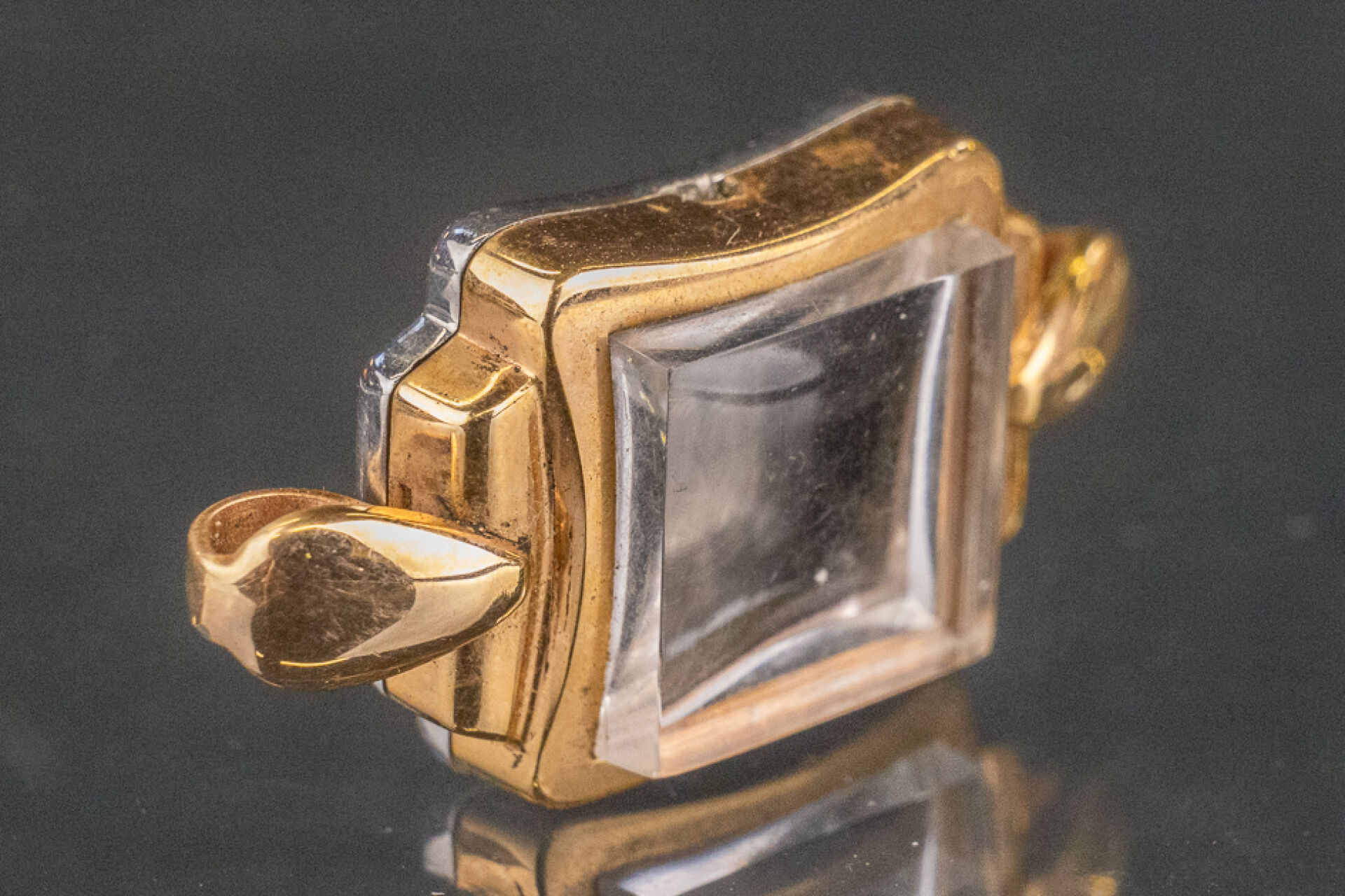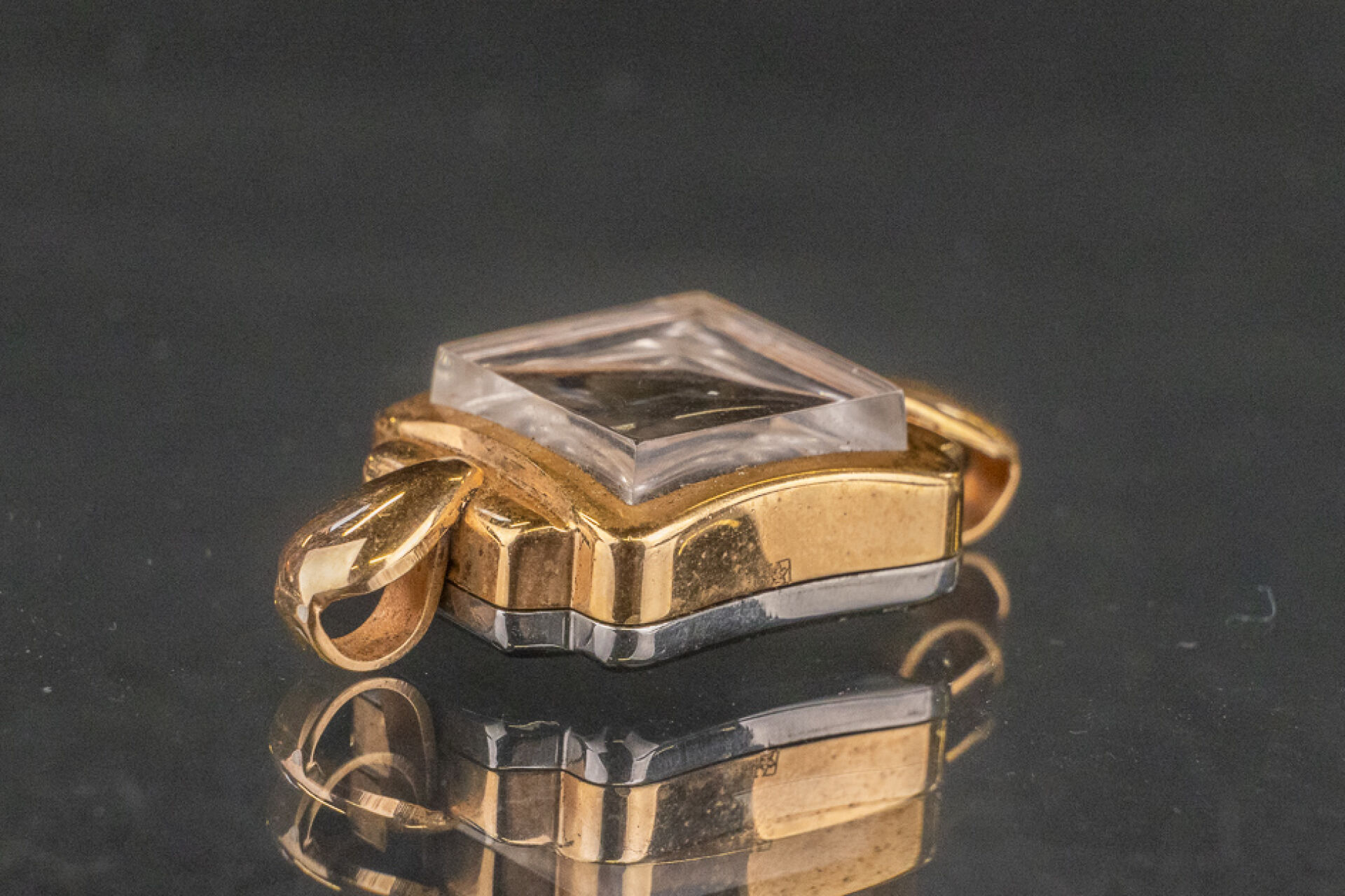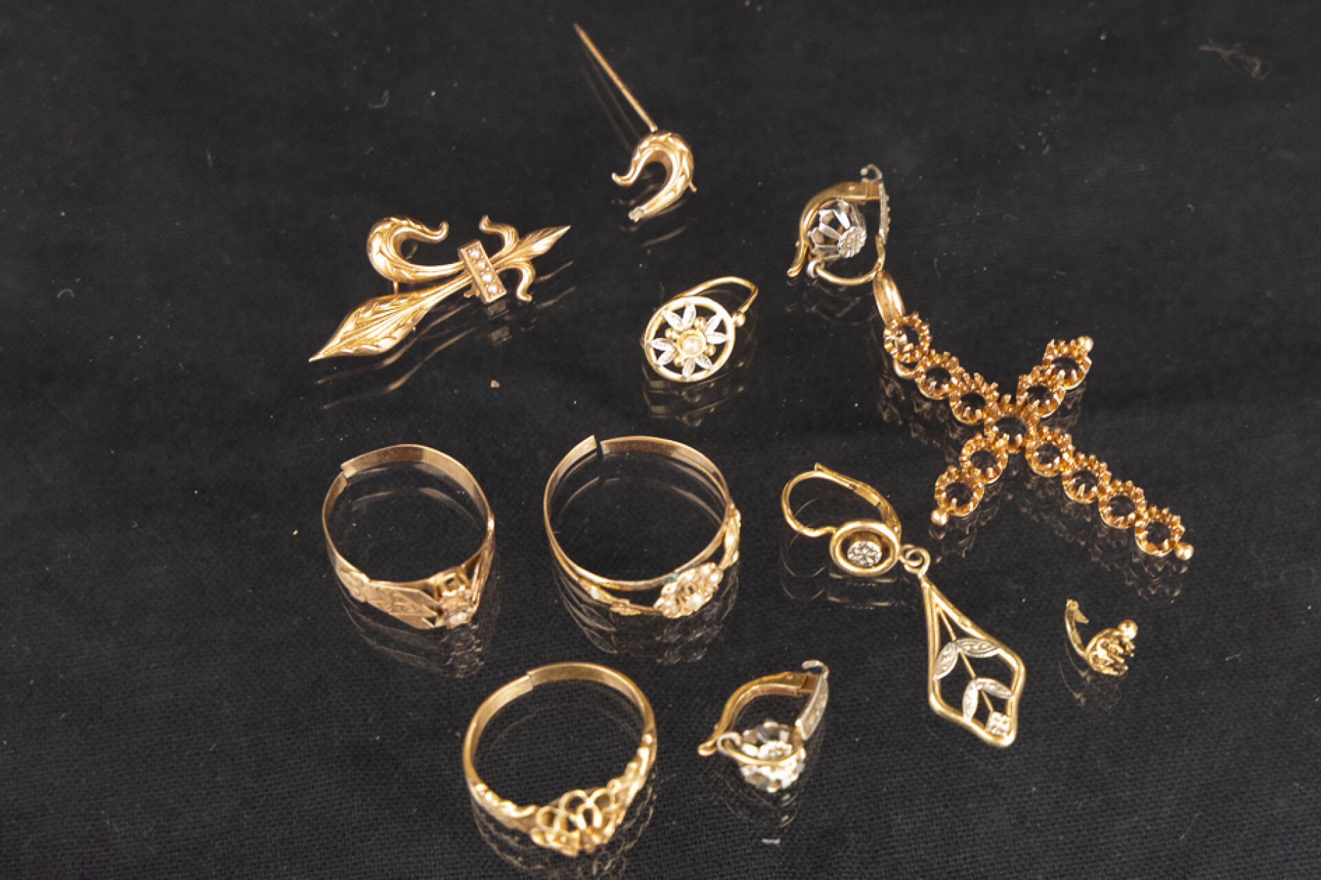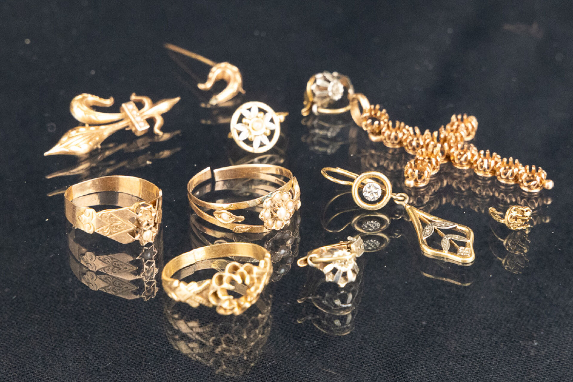 Lot de débris d'or jaune 18k (750 millièmes), comprenant parties de pendentifs, bagues coupées, parties de broche,... Poids brut : 14.52 gr On joint un boitier de montre en métal.