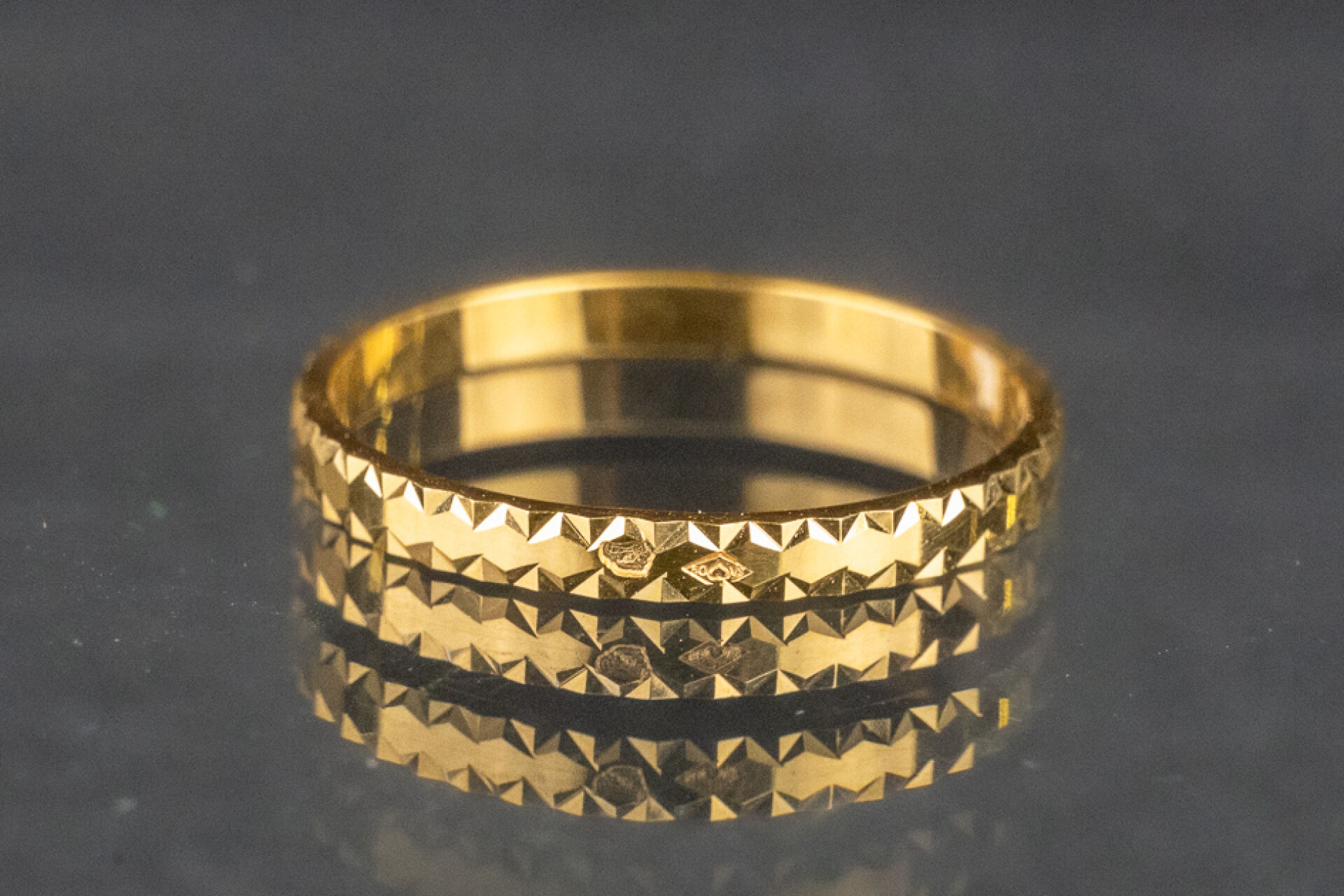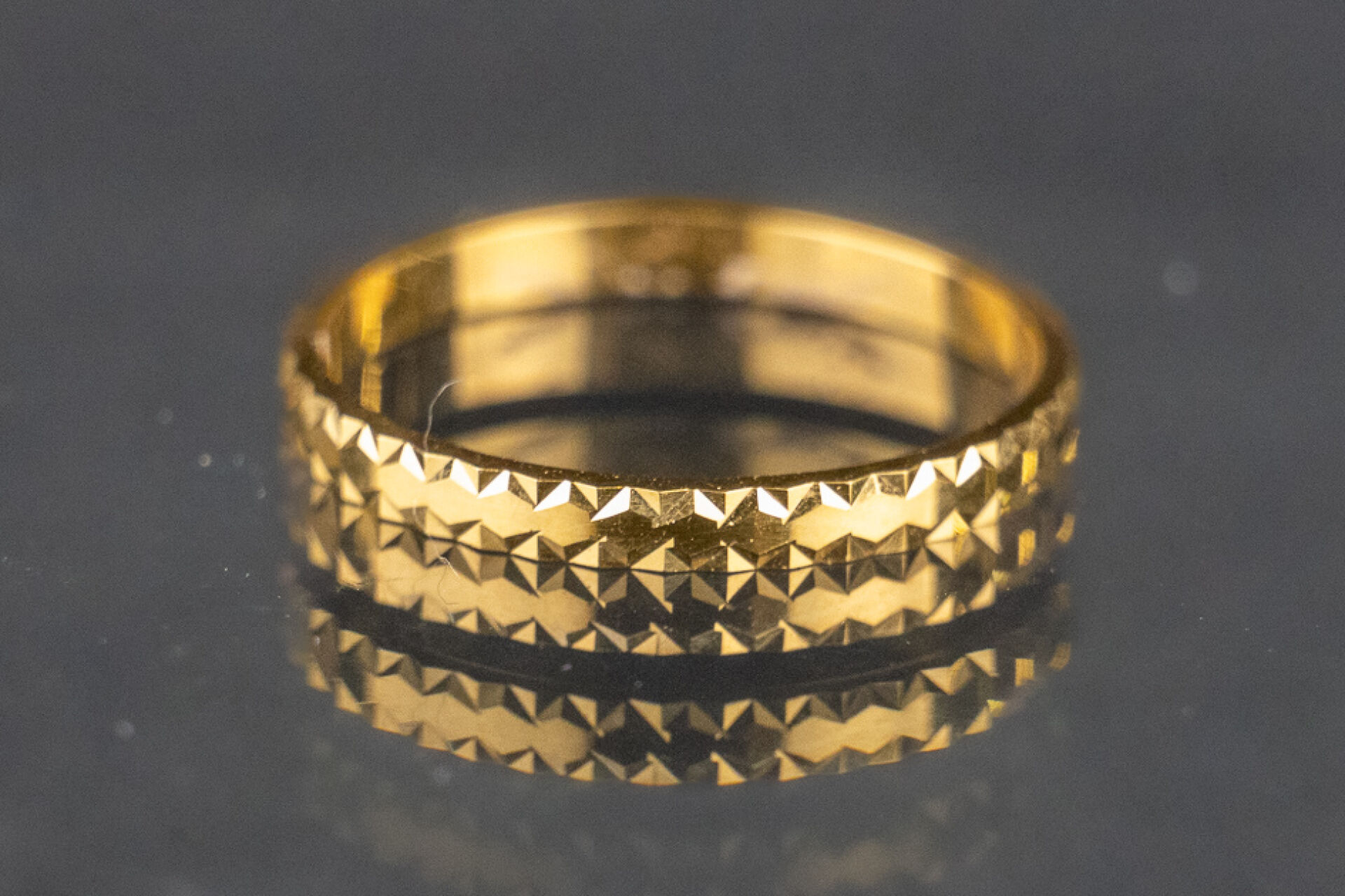 Alliance en or jaune 18k (750 millièmes) les bordures à motifs géométriques. Poids : 1.5 gr