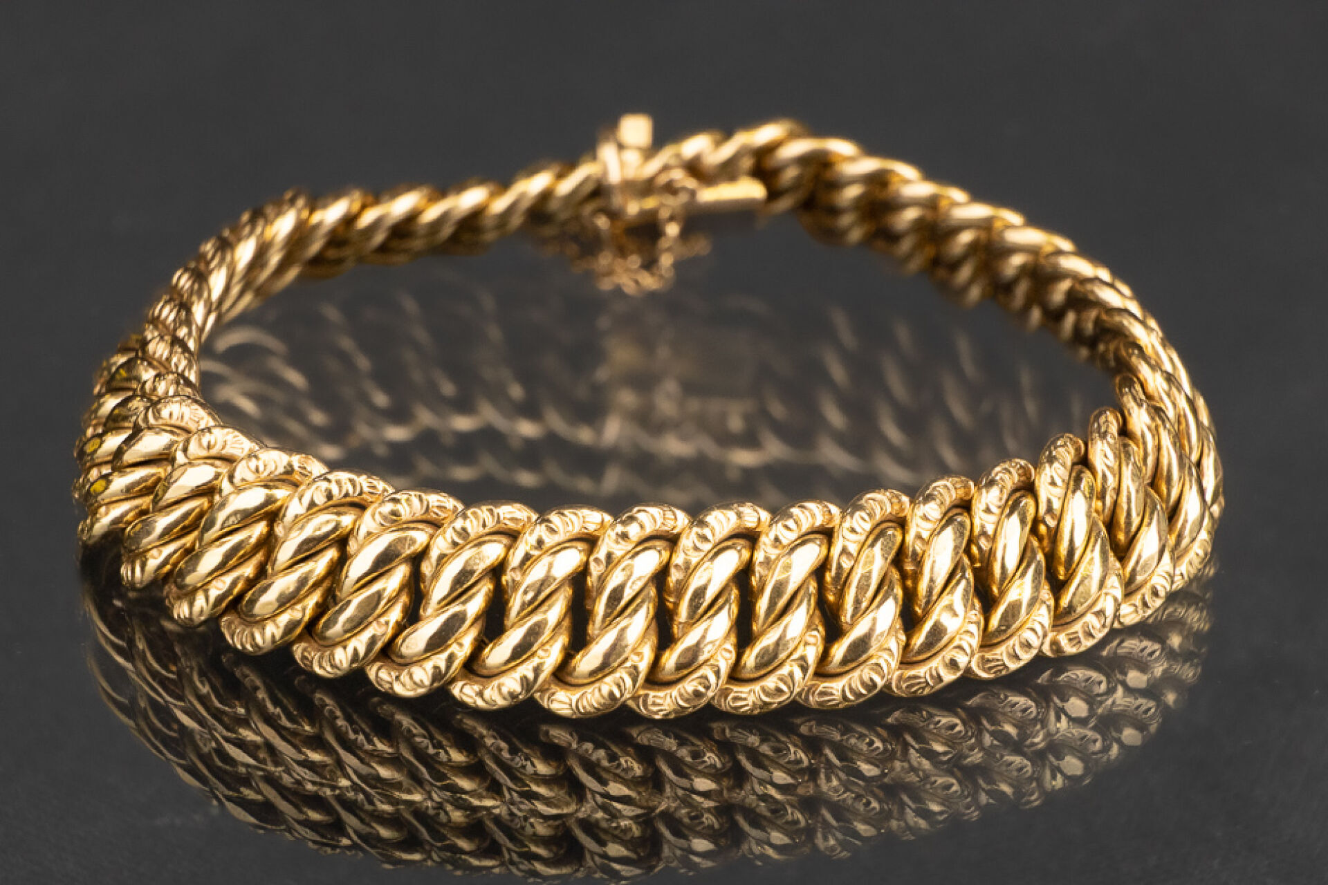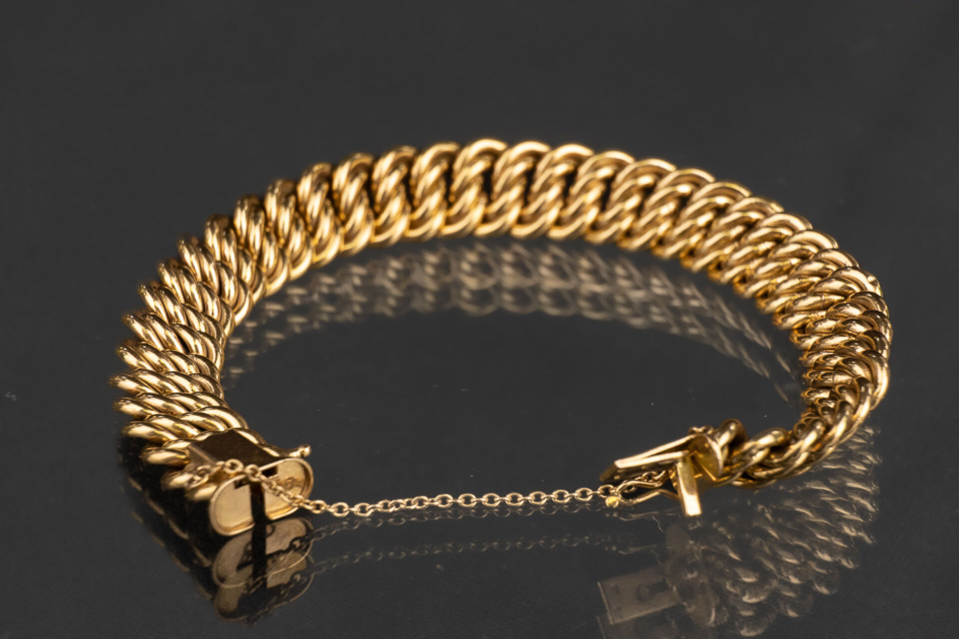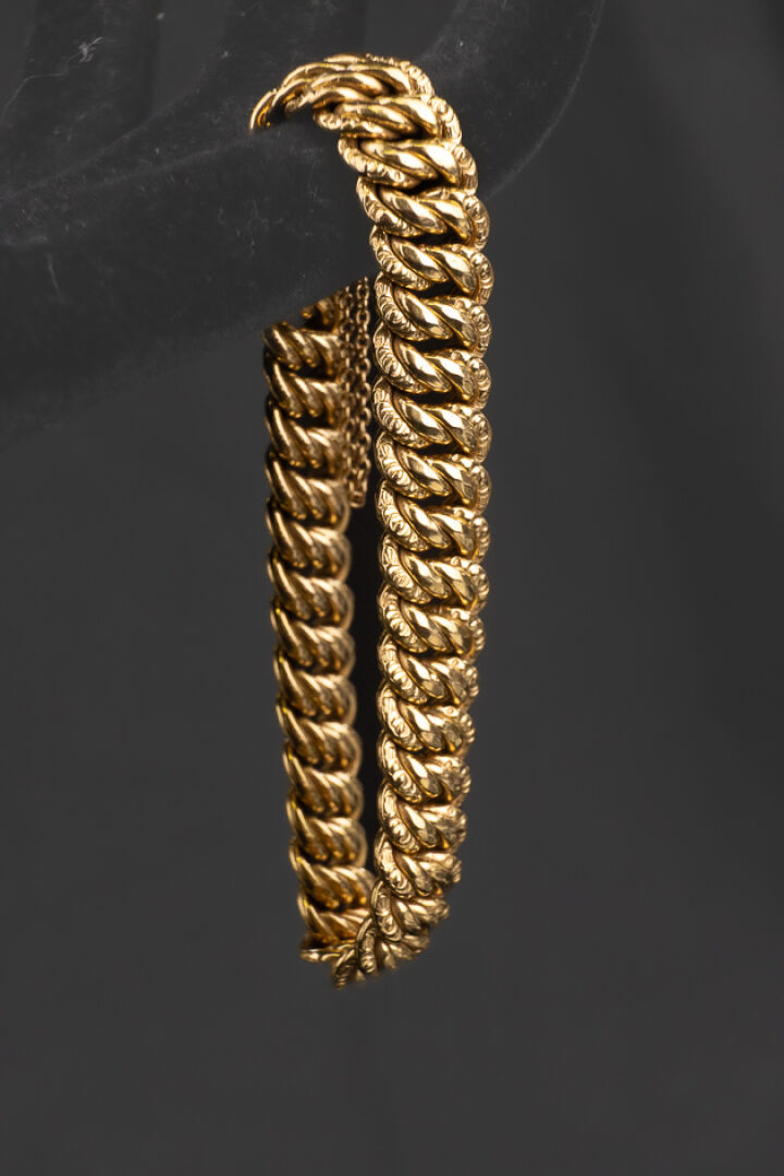 Bracelet en or jaune 18k (750 millièmes) maille américaine, chainette de sécurité et huit de sécurité. Poids : 25 gr