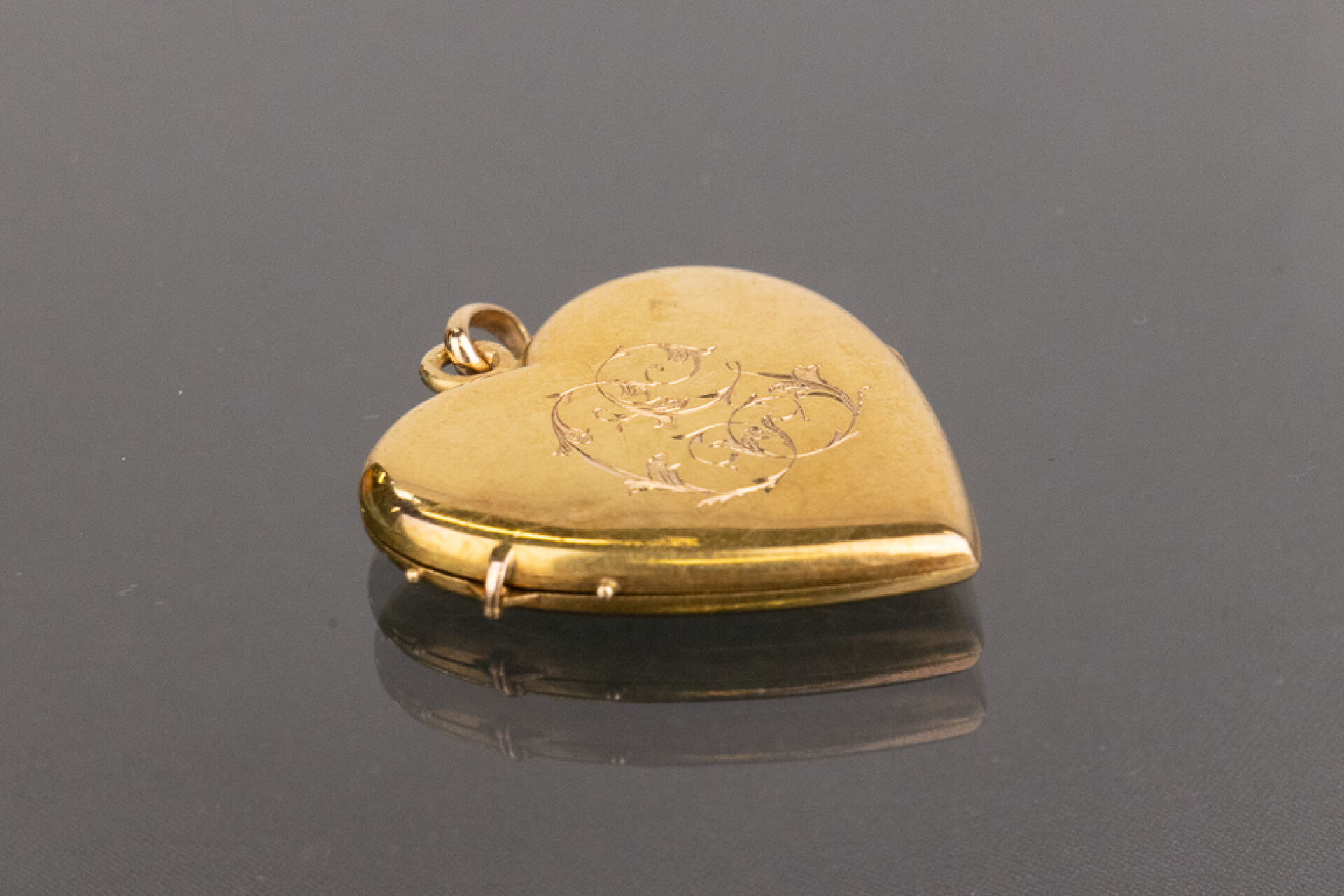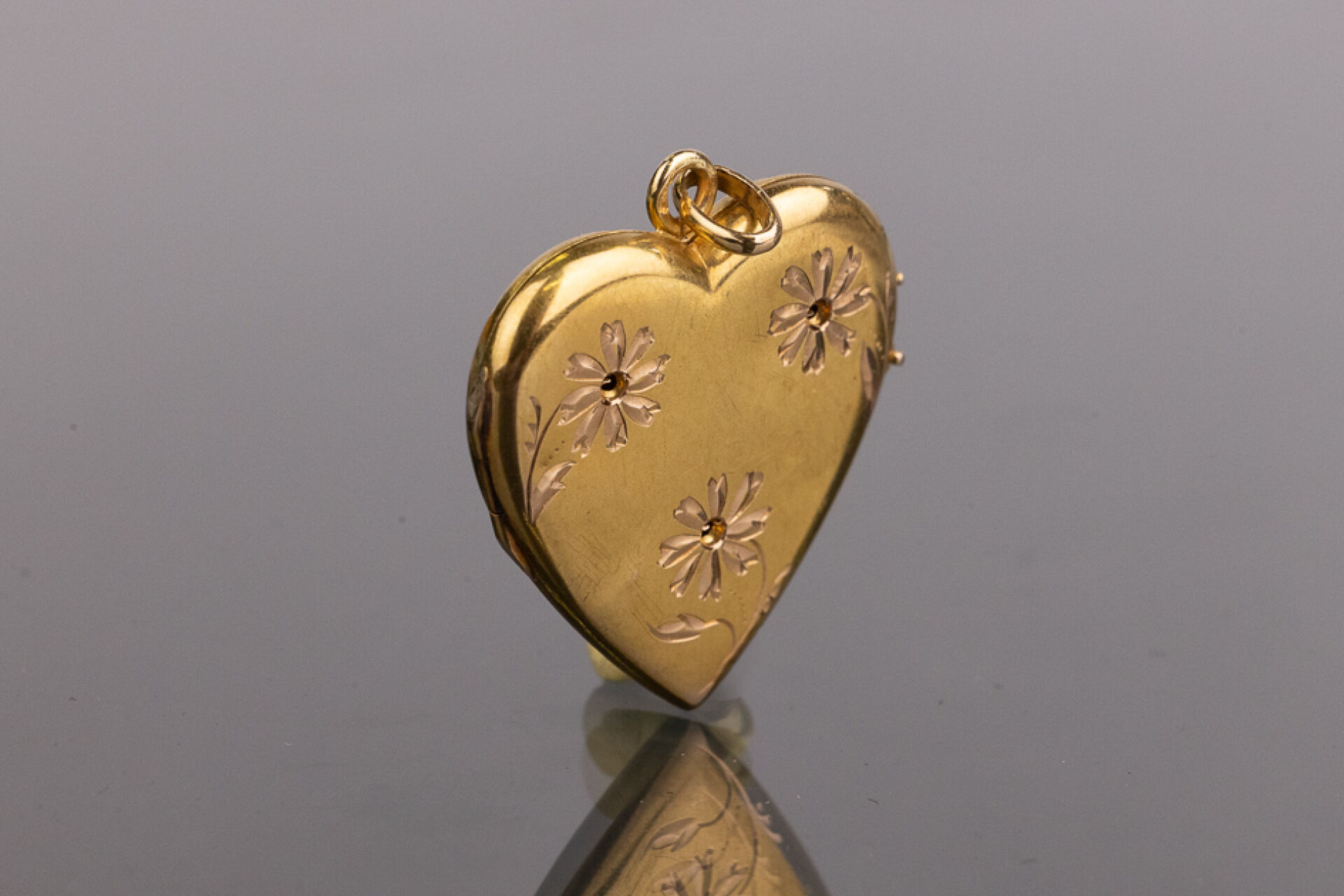 Pendentif formant cœur ouvrant en or jaune 18k (750 millièmes) à décor de fleurs gravées et monogrammée. Poids : 4.81 gr - Haut. : 3 cm Manque le cœur des fleurs