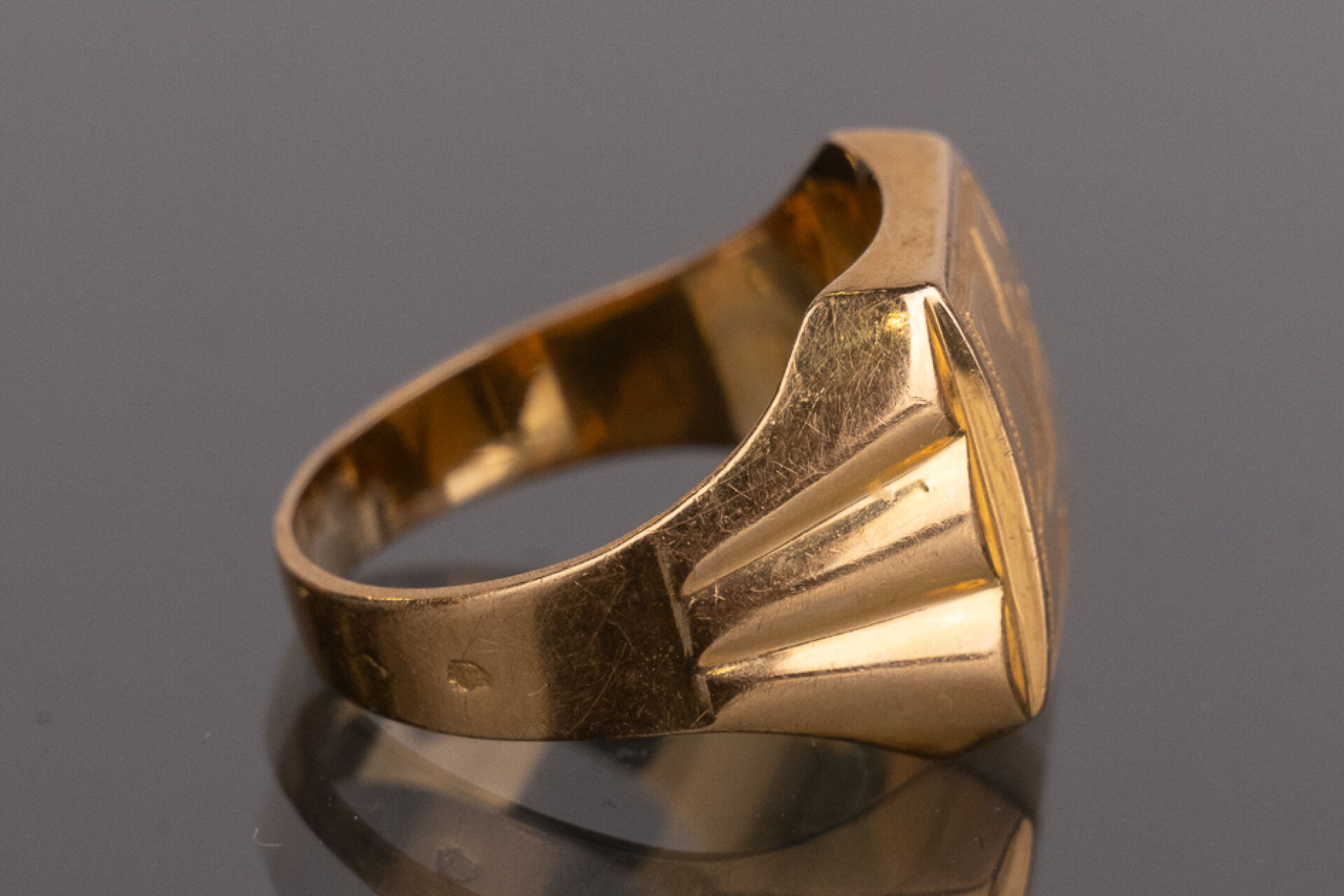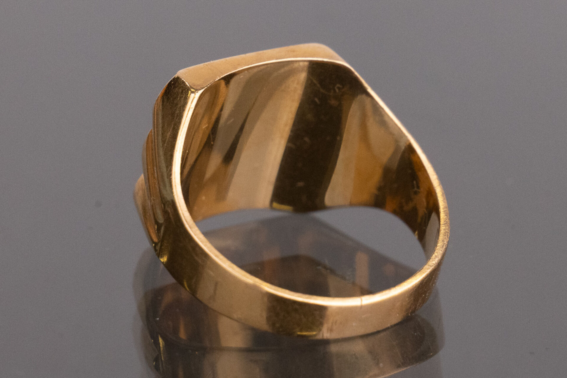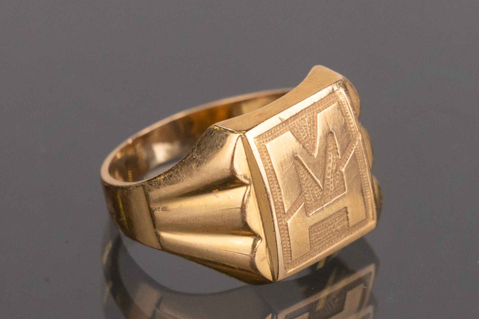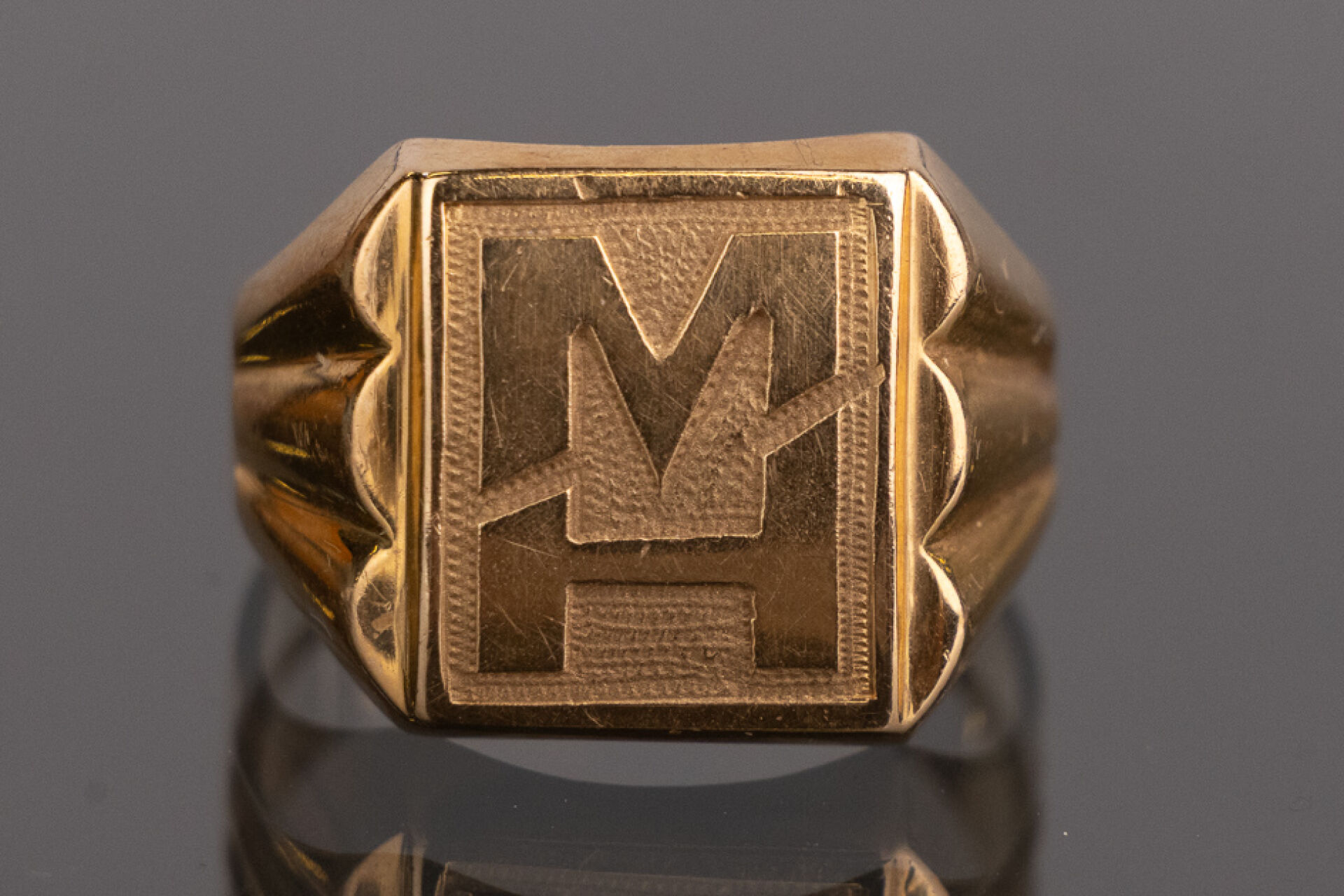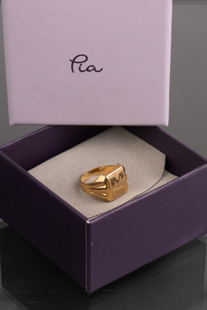 Chevalière en or jaune 18k (750 millièmes), monogrammée MH. Poids : 3,2 gr - Tour de doigt 47