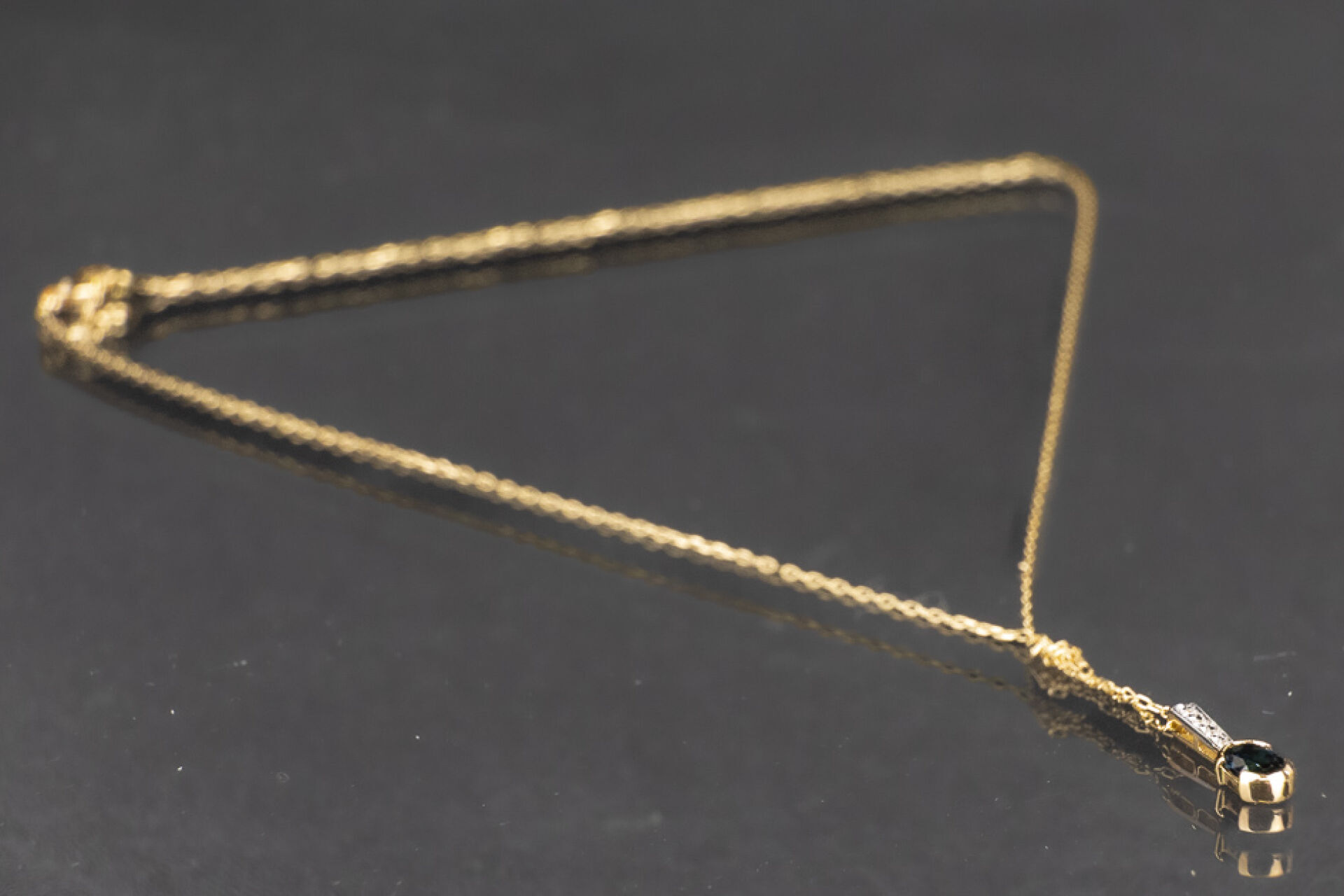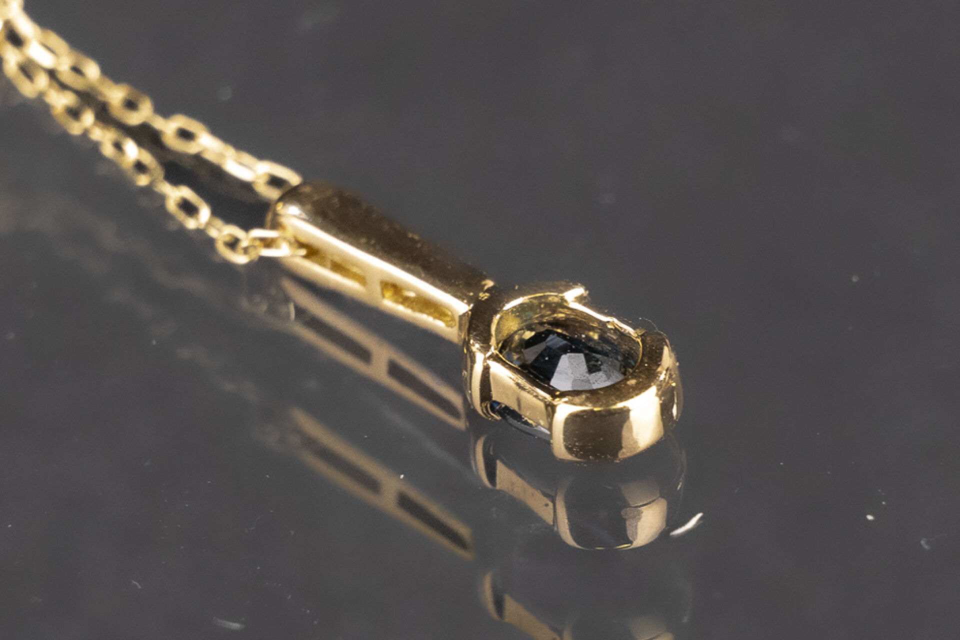 Chaine en or jaune 18k (750 millièmes) mailles gourmette, retenant un pendentif orné d'un petit saphir et de brillants. Poids brut : 1,59 gr - Long de la chaine : 41 cm environ