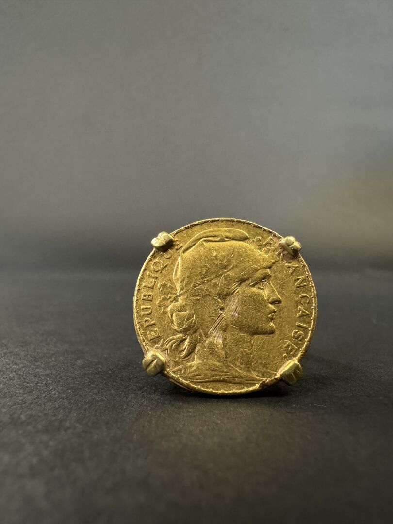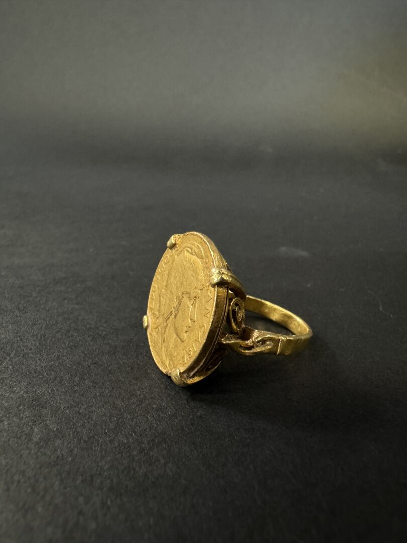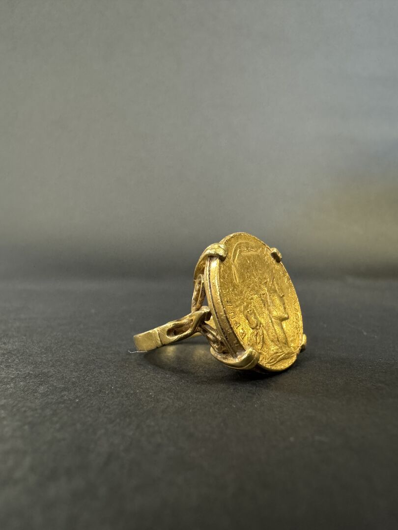 Bague en or jaune 18k (750 millièmes) sertie d'une pièce de 20 francs or. Poids : 12.68 gr - Tour de doigt 53 environ Anneau déformé