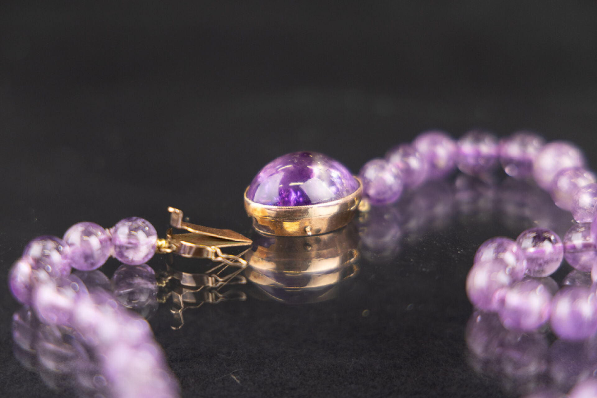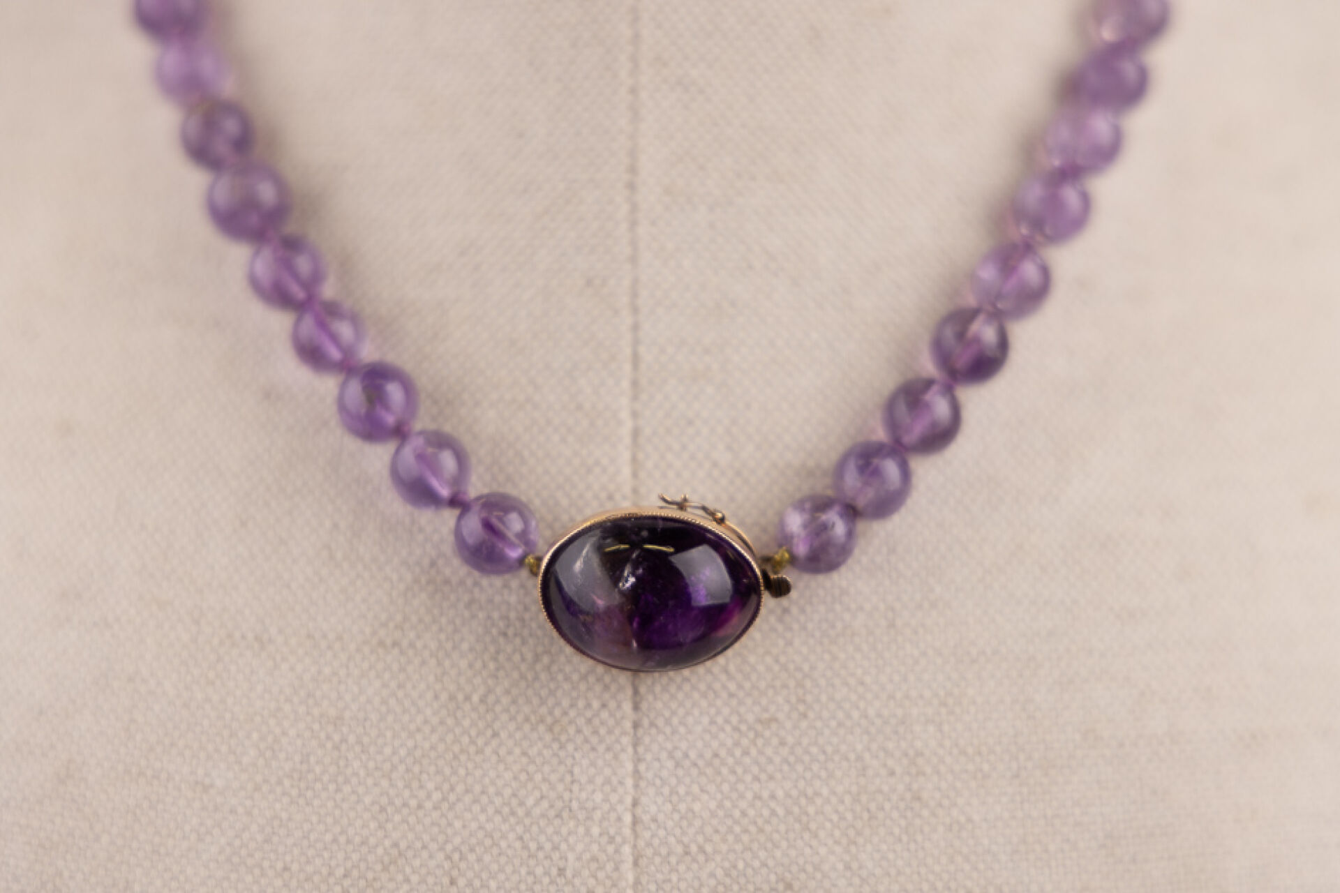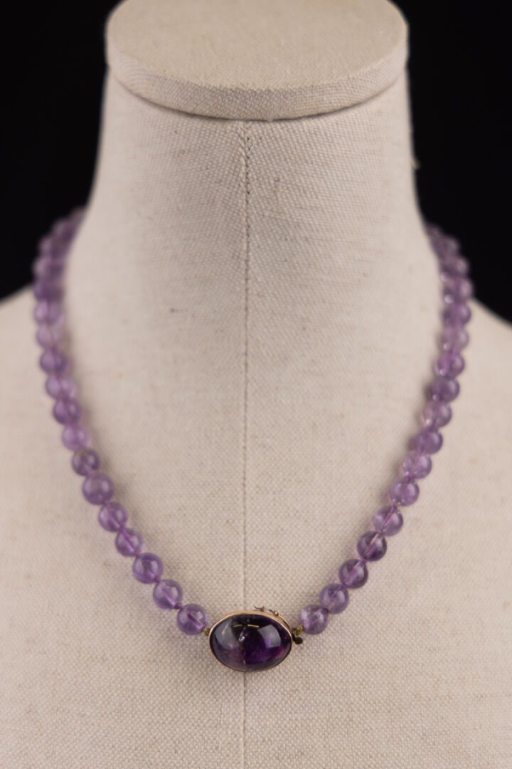 Collier de 48 perles de pierres dures violettes probablement améthystes, le fermoir ornée d'une pierre en cabochon à la monture en or rose 14k (585 millièmes), huit de sécurité. Poids brut : 59.2 gr - Long. : 51 cm