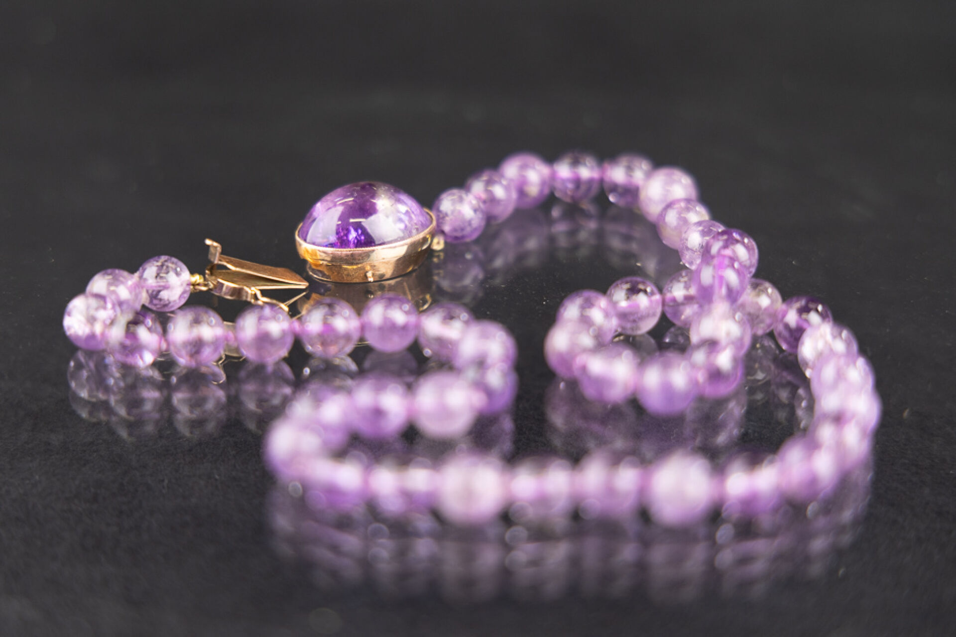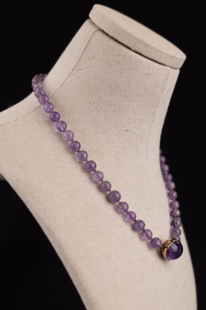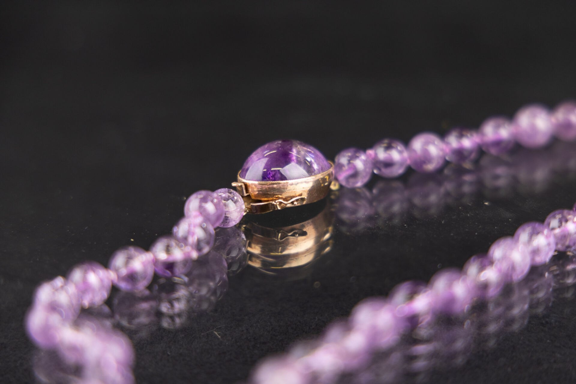 Collier de 48 perles de pierres dures violettes probablement améthystes, le fermoir ornée d'une pierre en cabochon à la monture en or rose 14k (585 millièmes), huit de sécurité. Poids brut : 59.2 gr - Long. : 51 cm