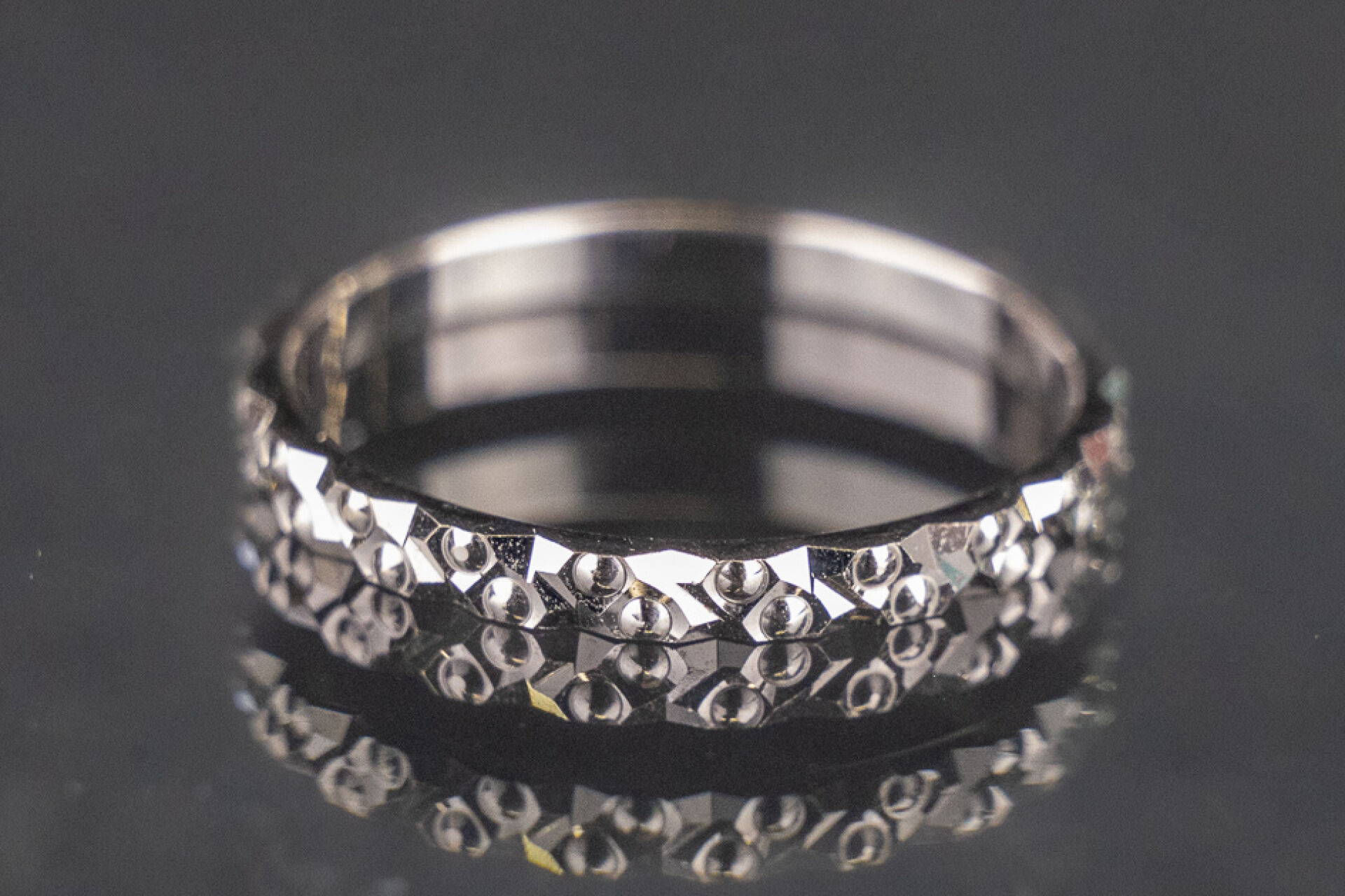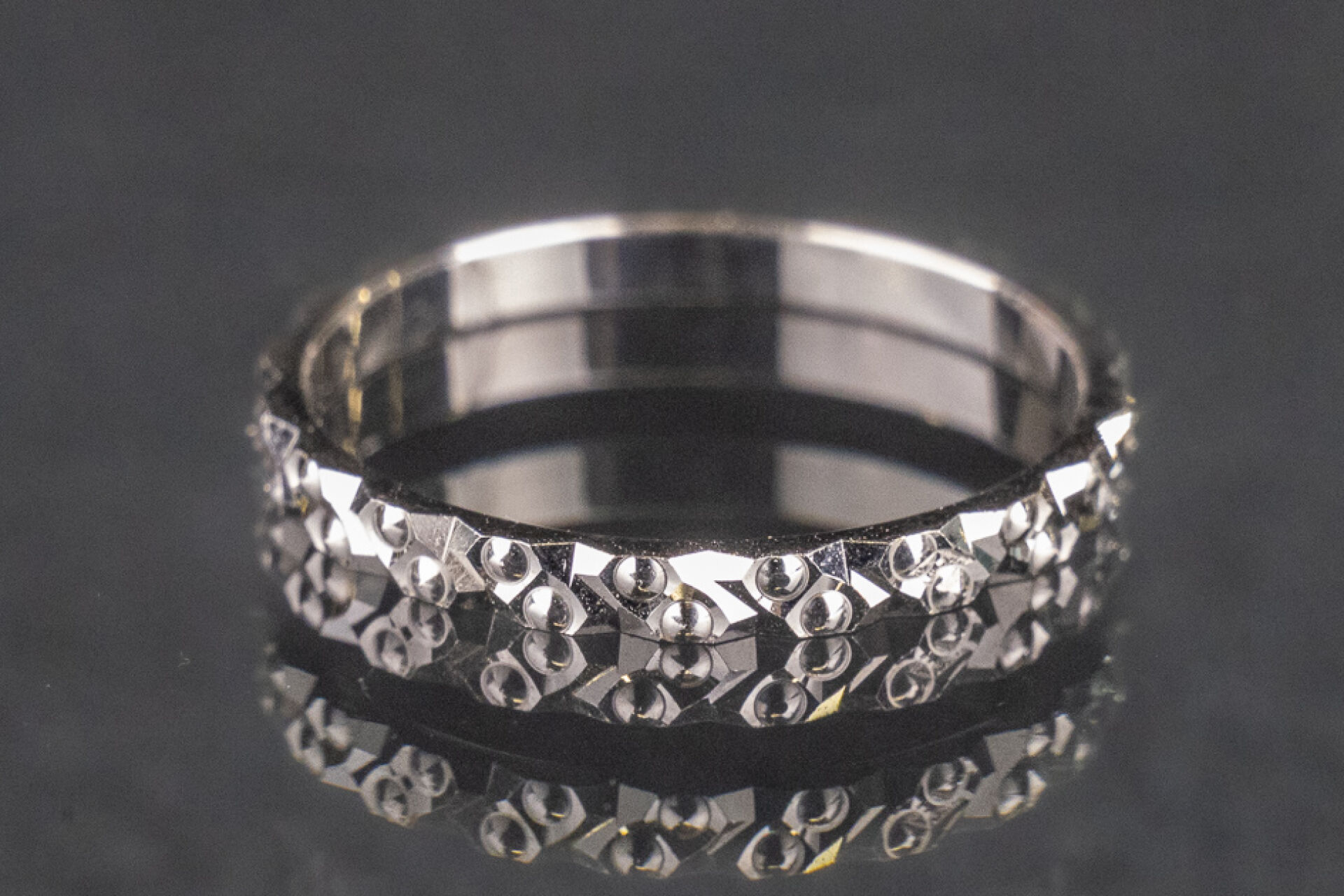 Alliance en or blanc 18k (750 millièmes) à décor de deux sphères de biais. Poids : 1.6 gr