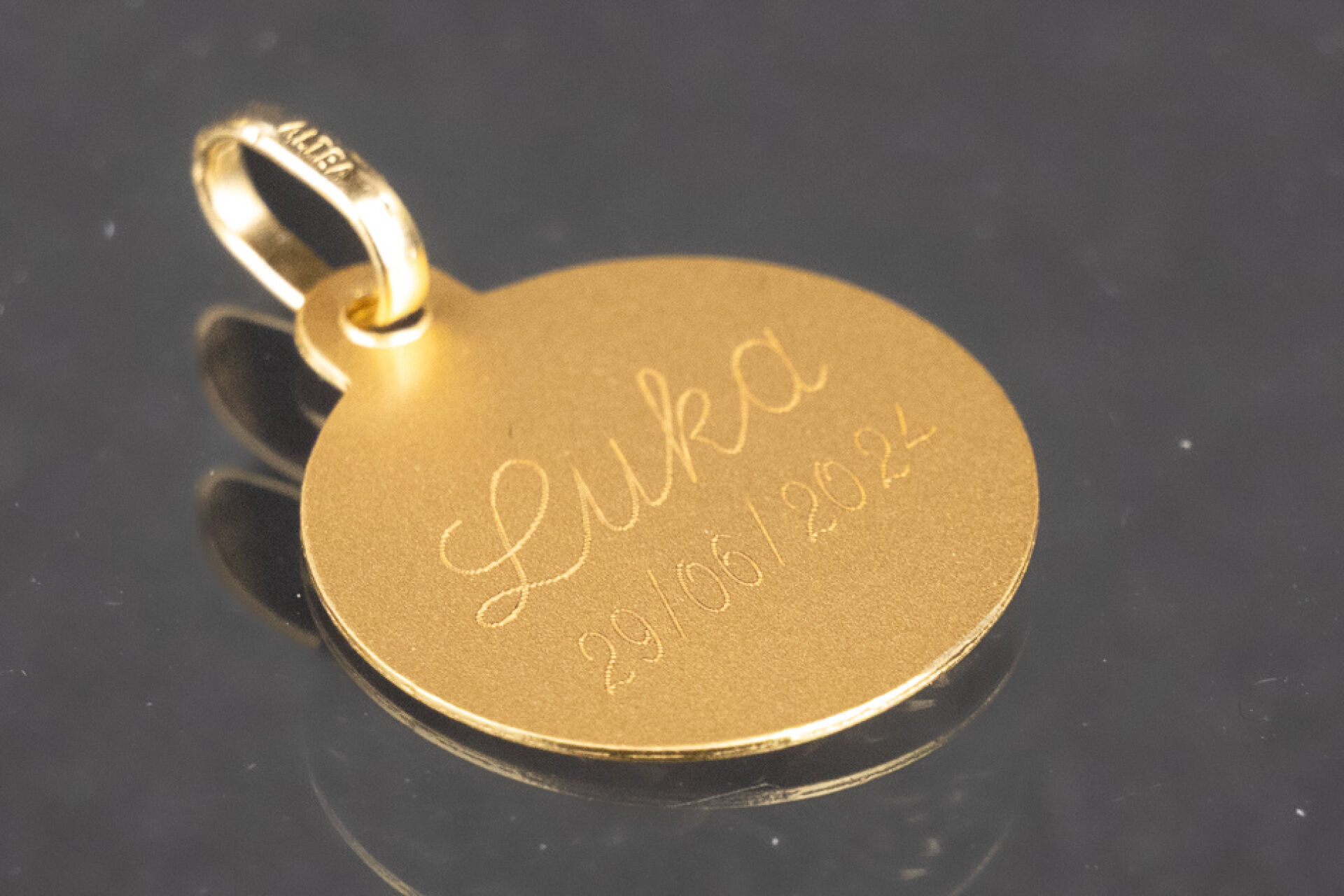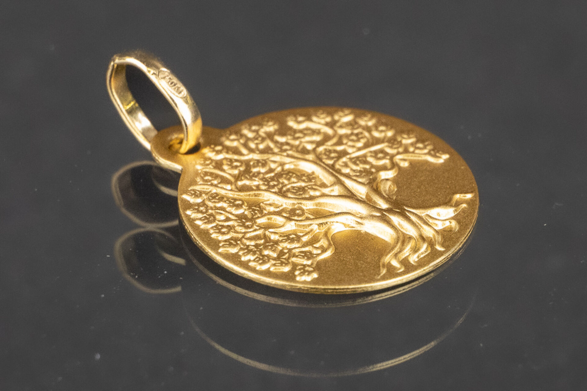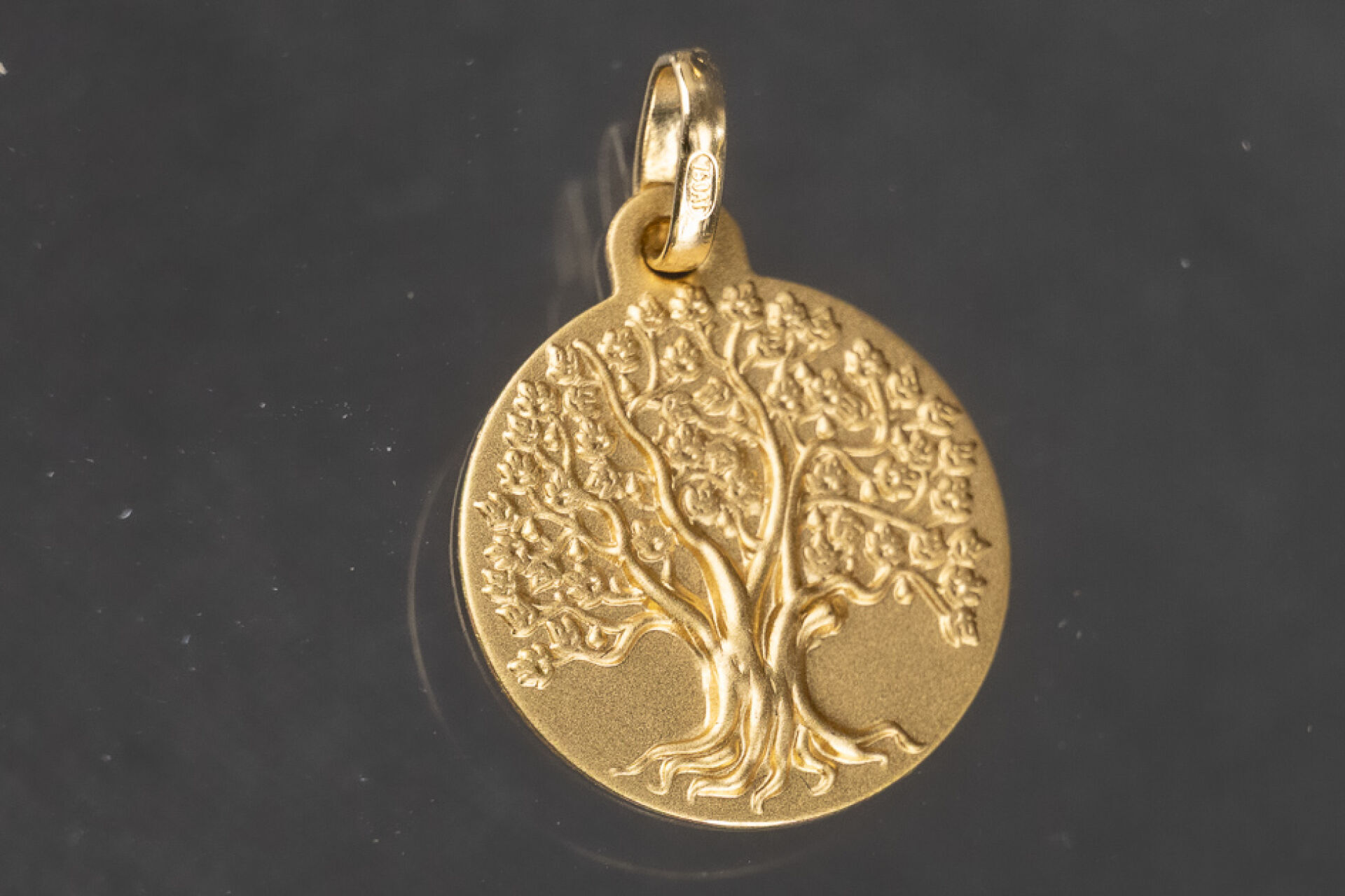 Médaille en or jaune 18k (750 millièmes) à décor d'un arbre de vie, gravée au dos. Poids : 1,63 gr - Diam. : 1,5 cm Dans un écrin OCARAT.