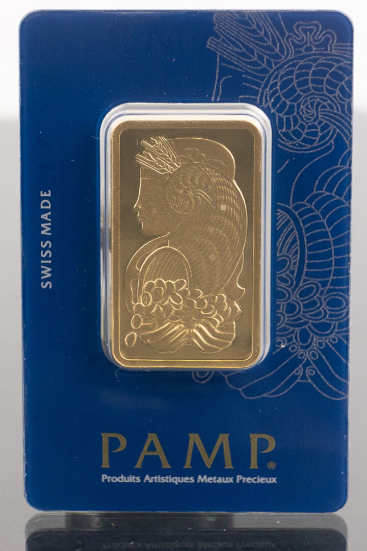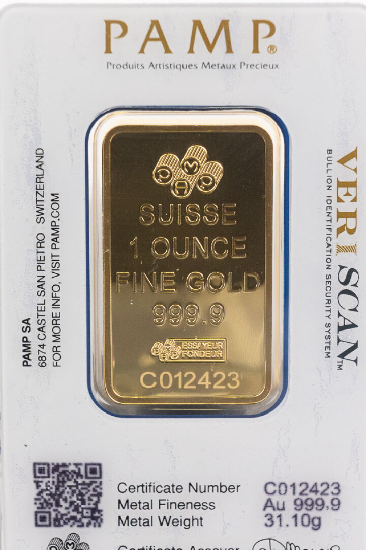 Lingot en or 999,9 millièmes (1 ounceSuisse). Sous scellé PAMP. Poids : 31,10 gr PAS DE LIVE POUR CE LOT PIECES CONSERVEES A LA BANQUE - VENDUES SUR DESIGNATION - VISIBLES SUR RENDEZ-VOUS UNIQUEMENT 48 H AVANT LA VENTE - DELIVRANCE SUR RENDEZ-VOUS UNIQUEMENT 72 HEURES A L'AVANCE