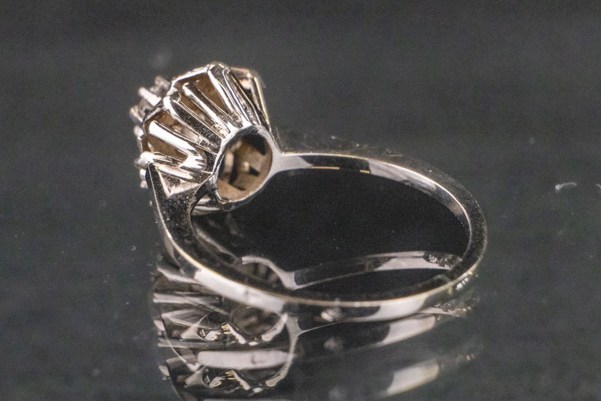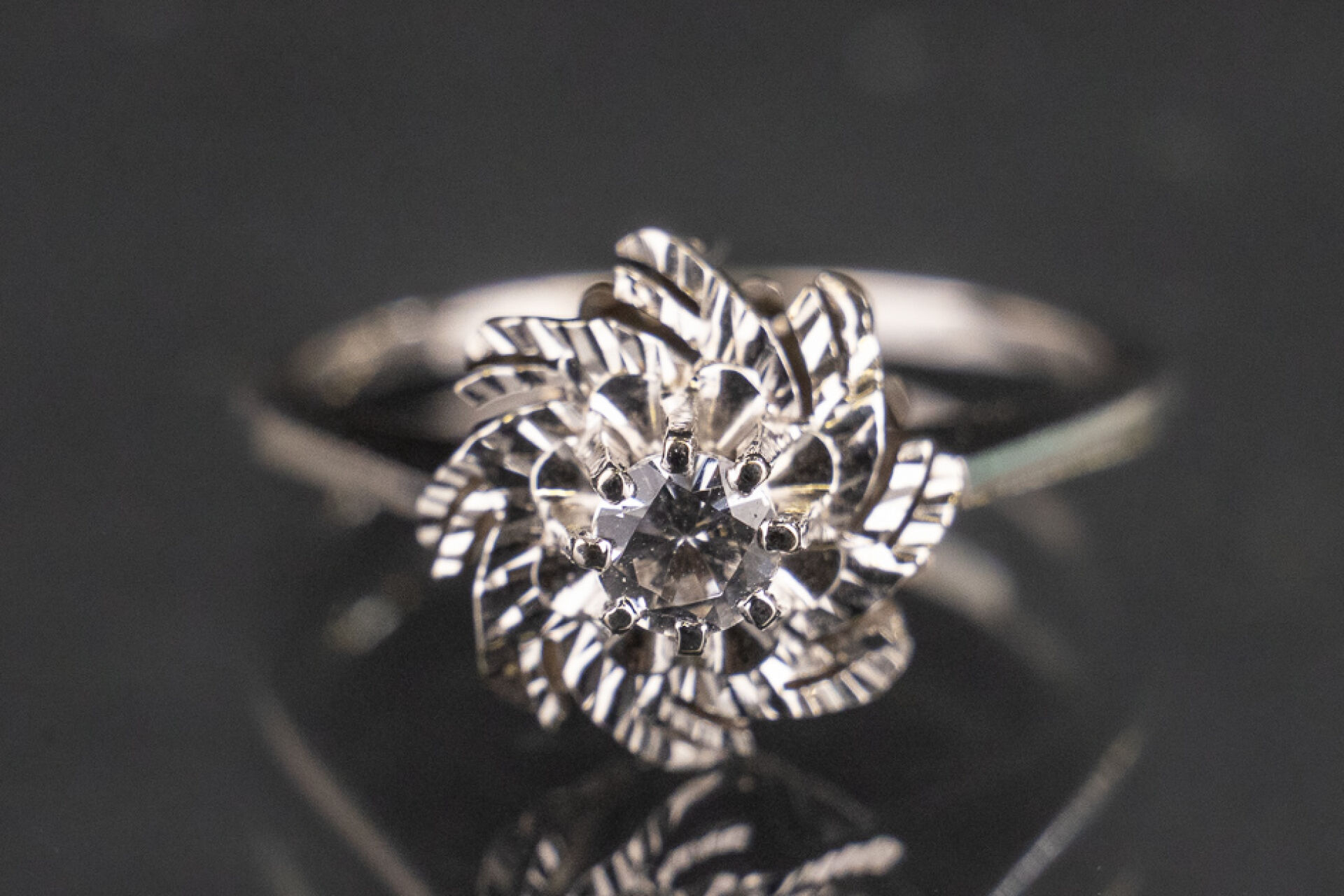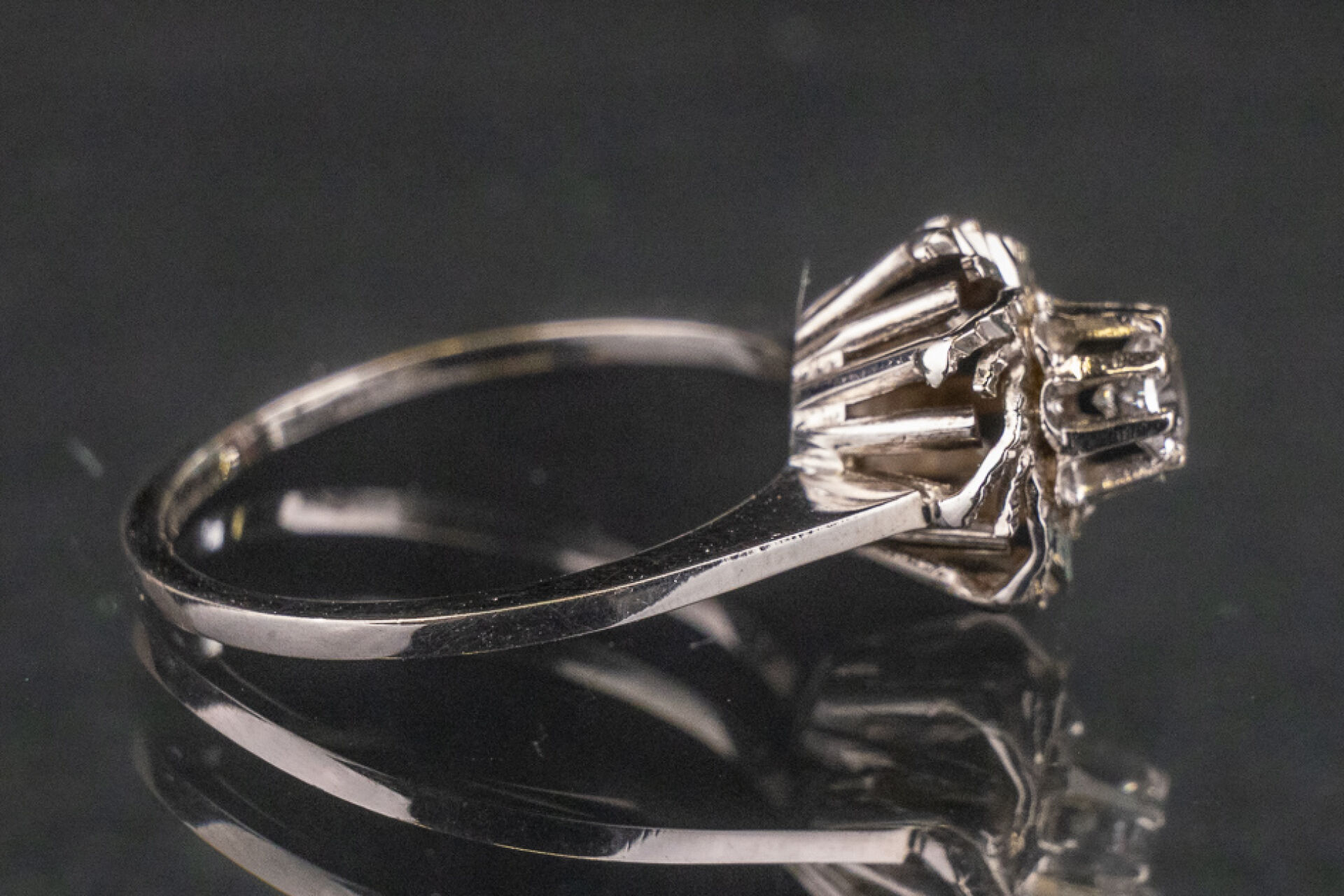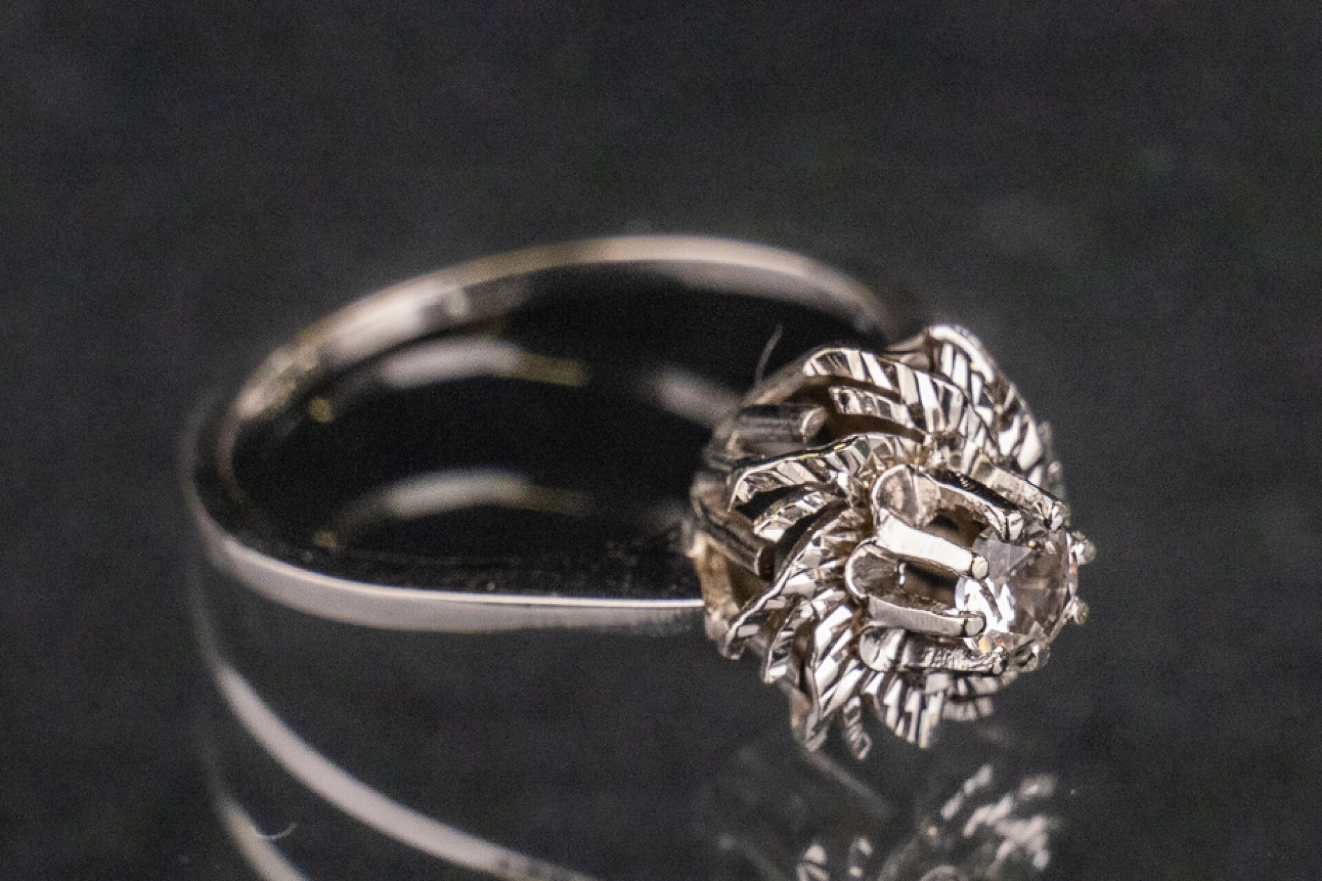 Bague en or blanc 18k (750 millièmes) le chaton étoilé centré d'un saphir blanc taille brillant. Poids brut : 3.1 gr - Tour de doigt 54