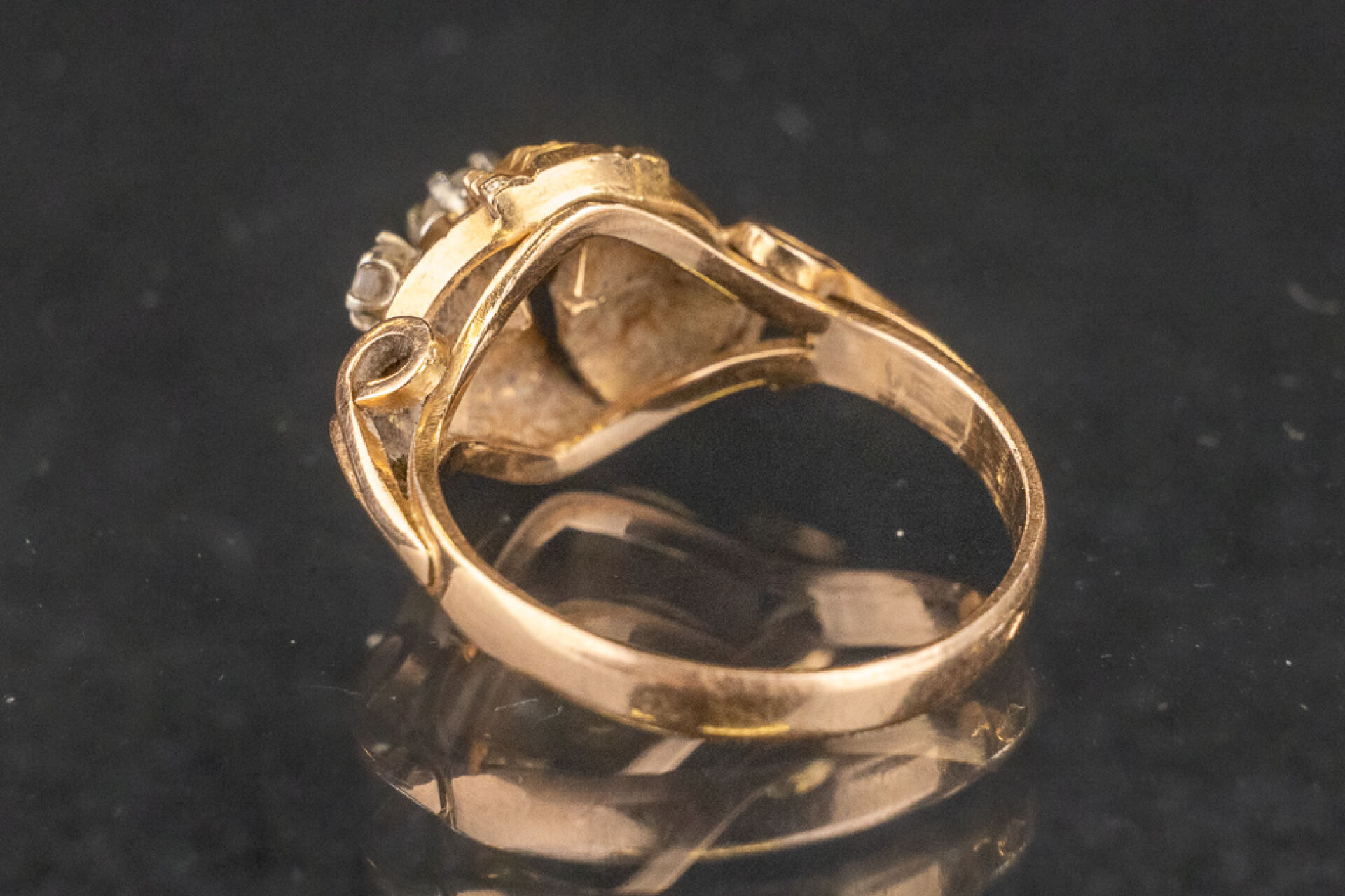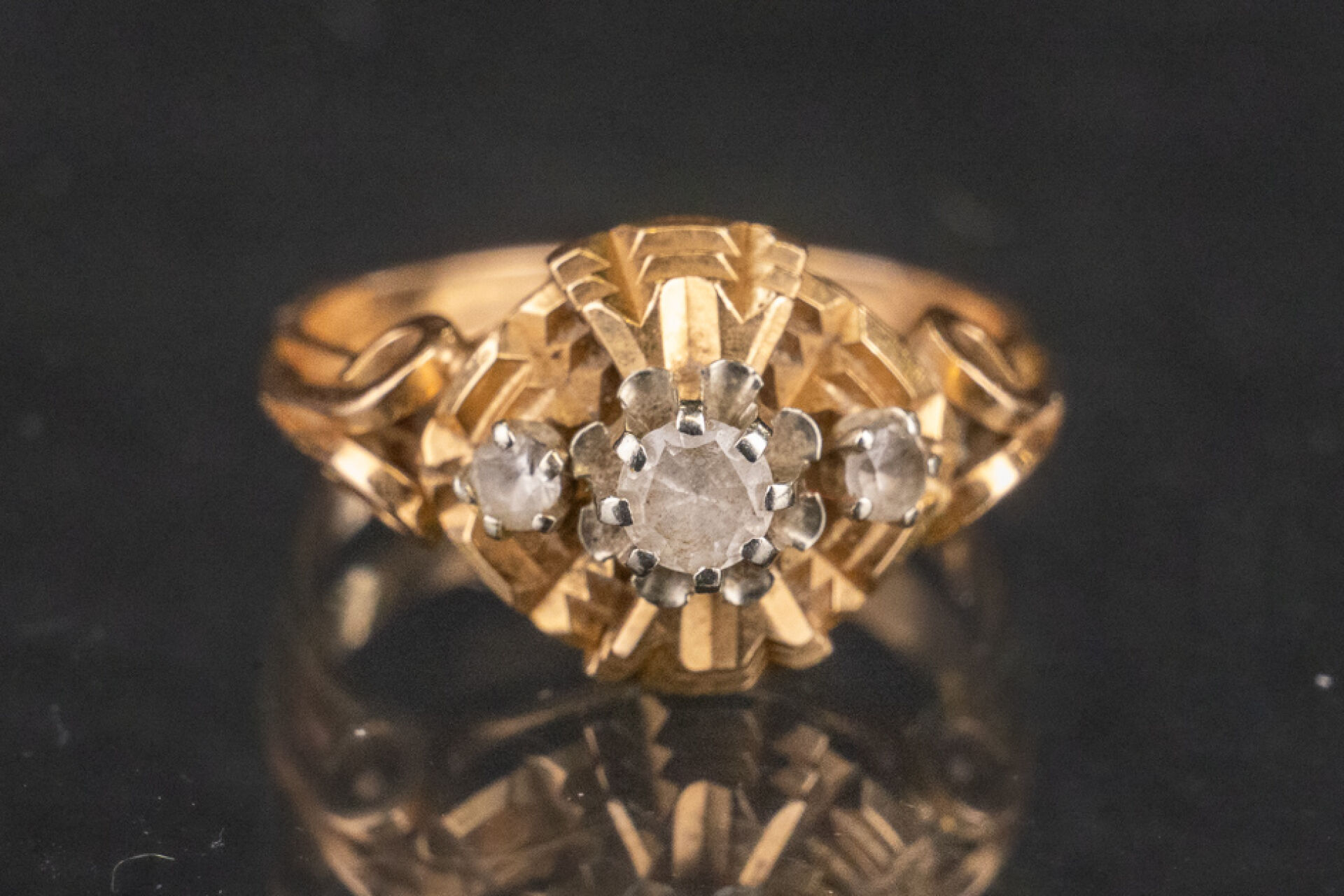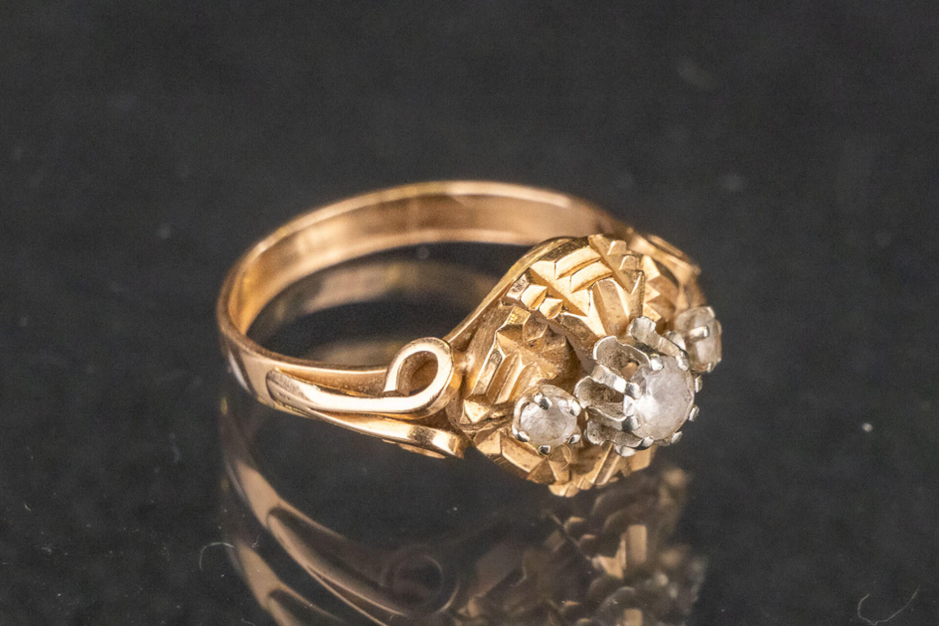Bague en or jaune 18k (750 millièmes), monture à décor d'enroulements, sertie de trois pierres blanches. Poids brut : 4.06 gr - Tour de doigt 54