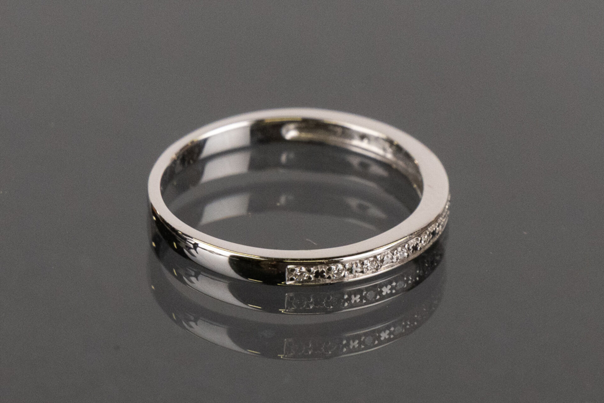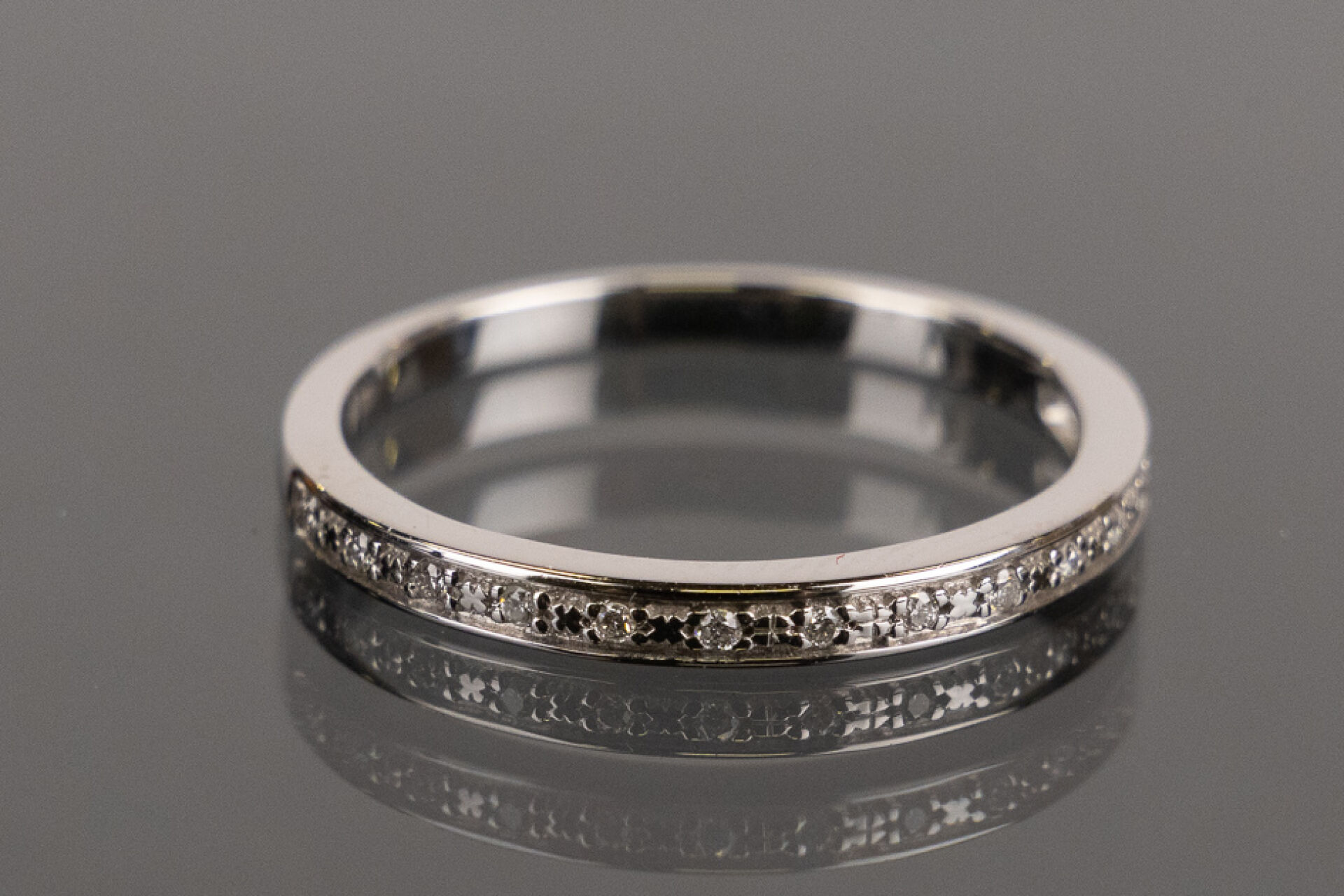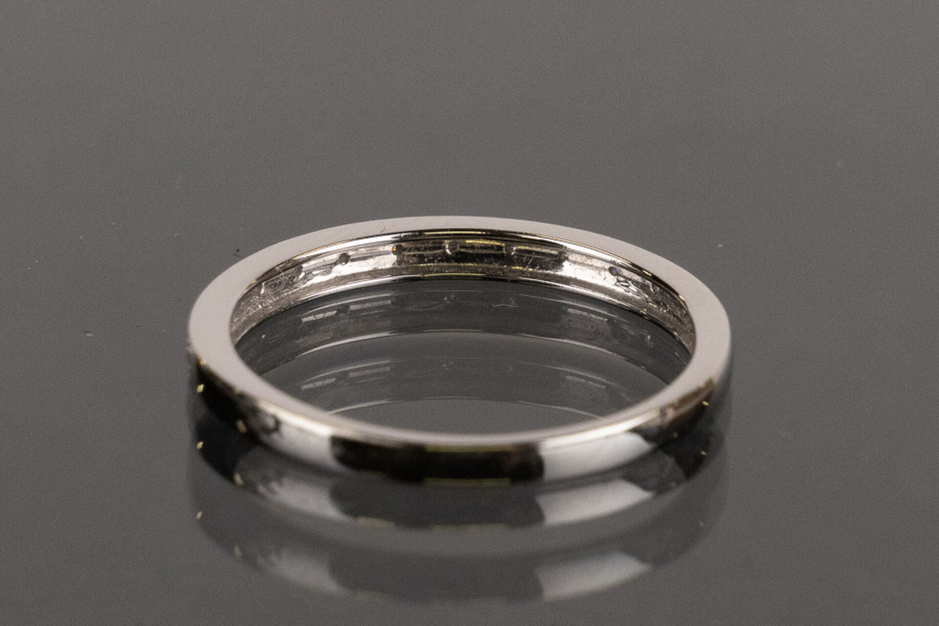 Alliance américaine en or gris 18k (750 millièmes), sertie de diamants de taille brillant. Poids brut : 1,57 gr - Tour de doigt 51 Conditions de vente spécifiques : Les gemmes, pierres et perles peuvent avoir fait l'objet de pratiques d'embellissement (huilage pour les émeraudes, traitement thermique pour les saphirs ou les rubis, blanchiment pour les perles). Ces améliorations sont considérées comme traditionnelles et sont admises par le commerce international des pierres gemmes et des perles. Par conséquent, ces traitements ne sont pas mentionnés au catalogue. De plus, les pierres n'ayant pas été desserties pour fait l'objet d'un examen approfondi en laboratoire, elles peuvent être synthétiques. Leur poids en carats vous est fourni à titre indicatif et précédé de la mention « environ ».