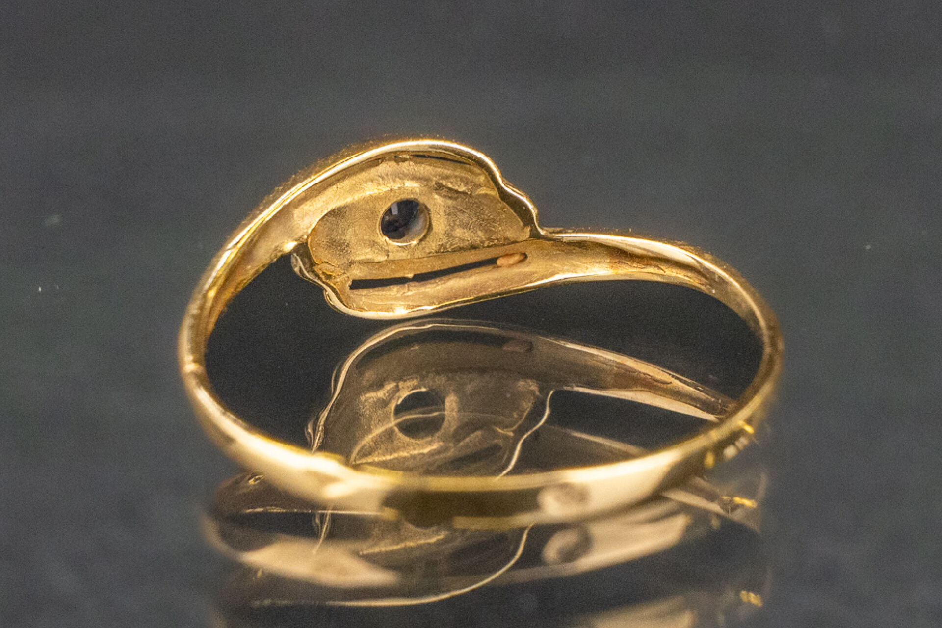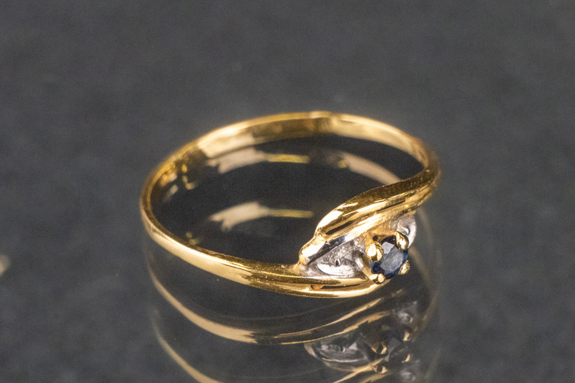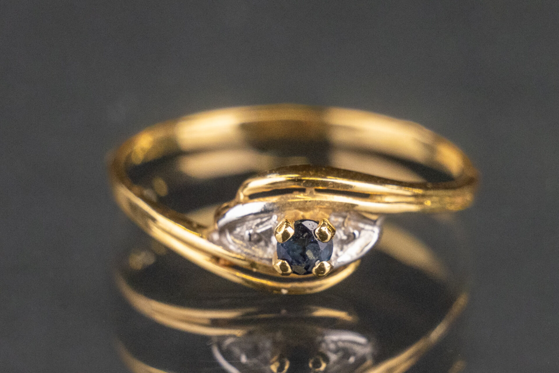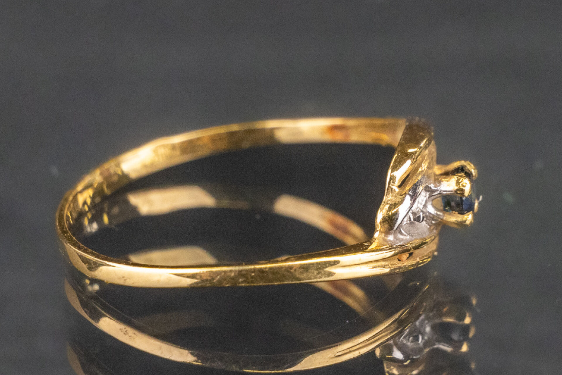 Bague en or jaune et or blanc 18k (750 millièmes) sertie d'un saphir de forme torsadé. Poids brut : 1.2 gr - Tour de doigt 53