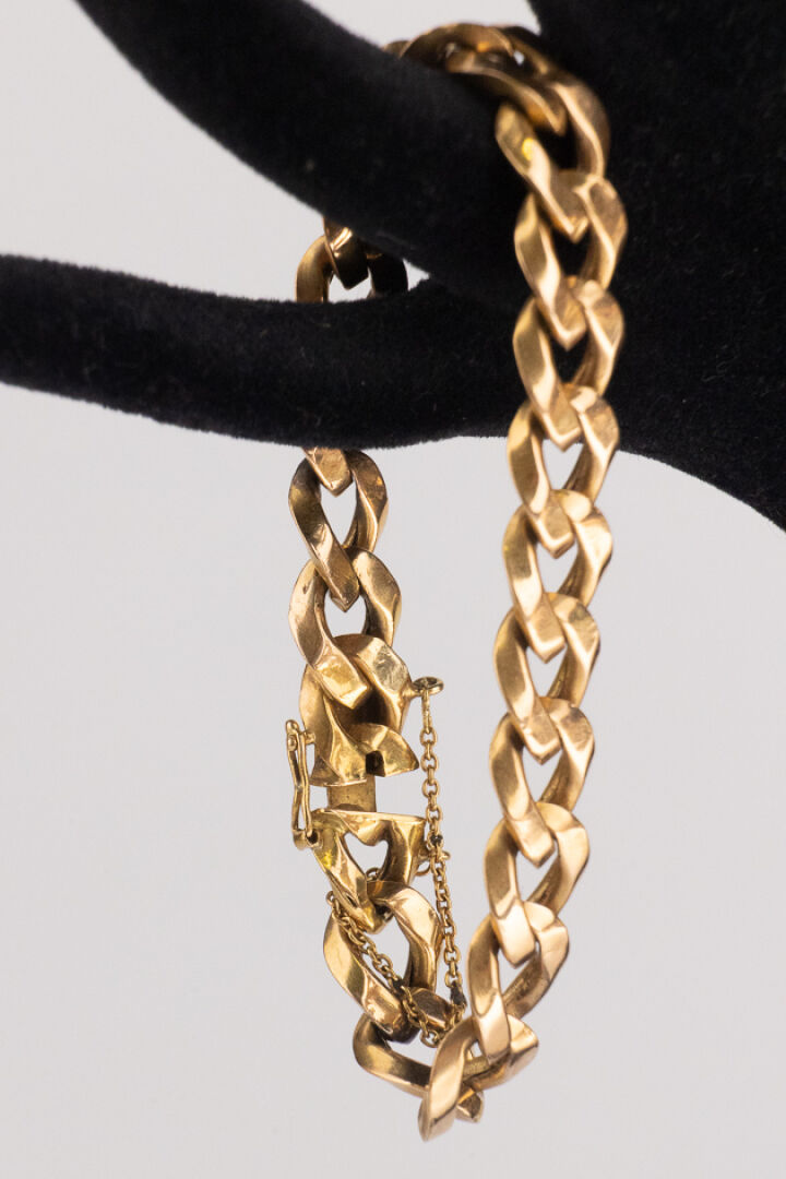 Bracelet en or jaune 18k (750 millièmes), maille gourmette, chaine de sécurité. Poids : 19.89 gr
