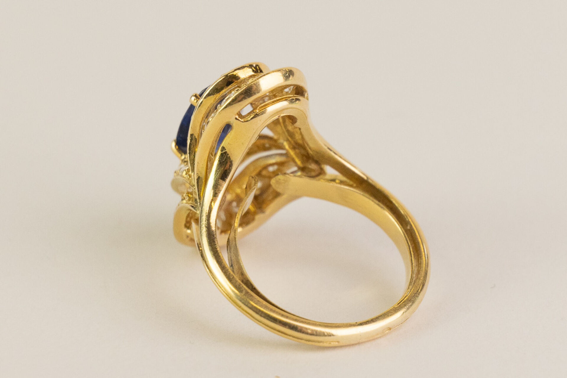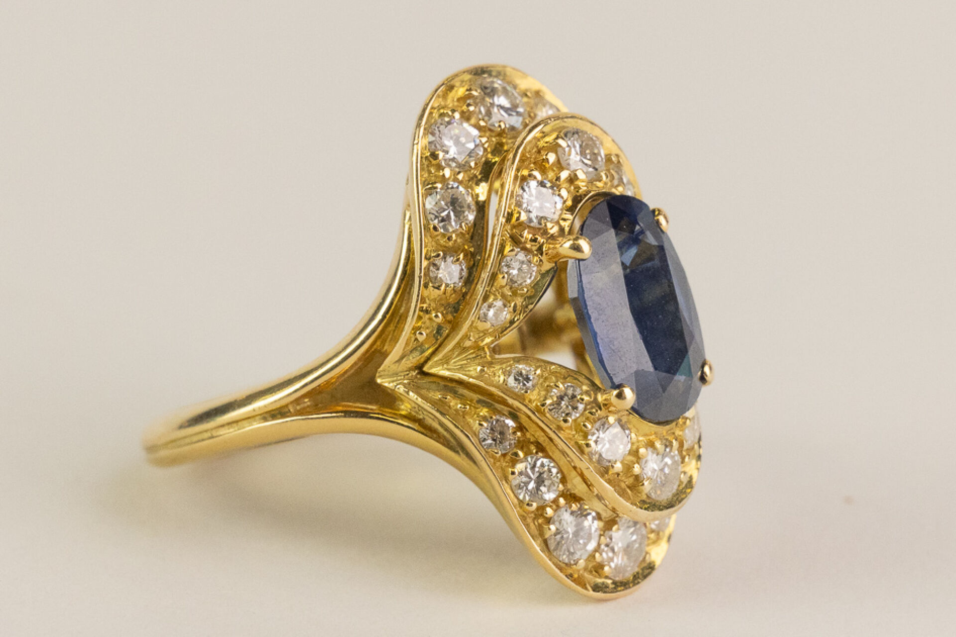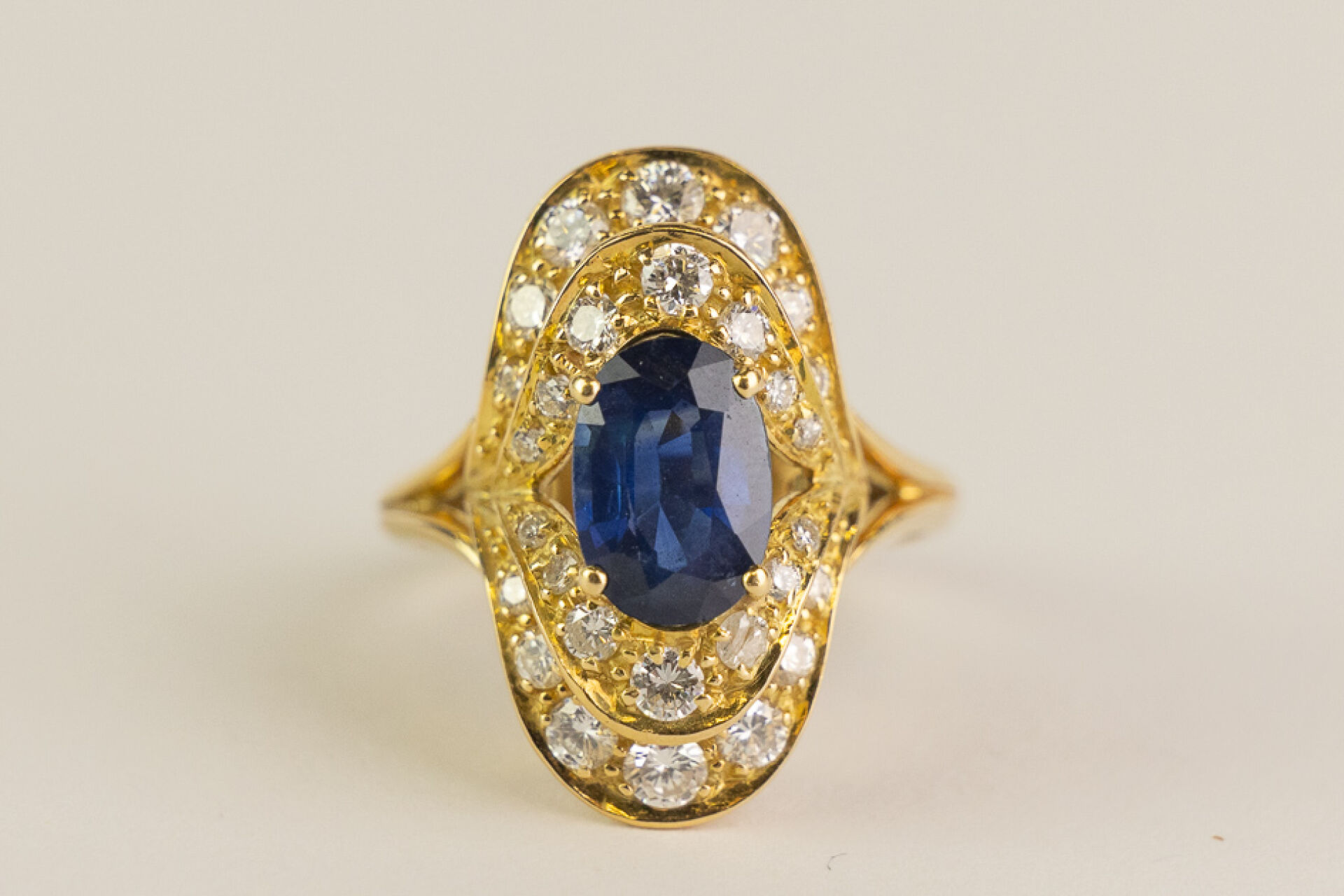 Bague type marquise en or jaune ornée en son centre d'un saphir ovale ponctué de petits diamants sur deux rangées. Tour de doigt : 49 - Poids brut : 7 gr Conditions de vente spécifiques : Les gemmes, pierres et perles peuvent avoir fait l'objet de pratiques d'embellissement (huilage pour les émeraudes, traitement thermique pour les saphirs ou les rubis, blanchiment pour les perles). Ces améliorations sont considérées comme traditionnelles et sont admises par le commerce international des pierres gemmes et des perles. Par conséquent, ces traitements ne sont pas mentionnés au catalogue. De plus, les pierres n'ayant pas été desserties pour fait l'objet d'un examen approfondi en laboratoire, leur poids en carats vous est fourni à titre indicatif et précédé de la mention « environ ».