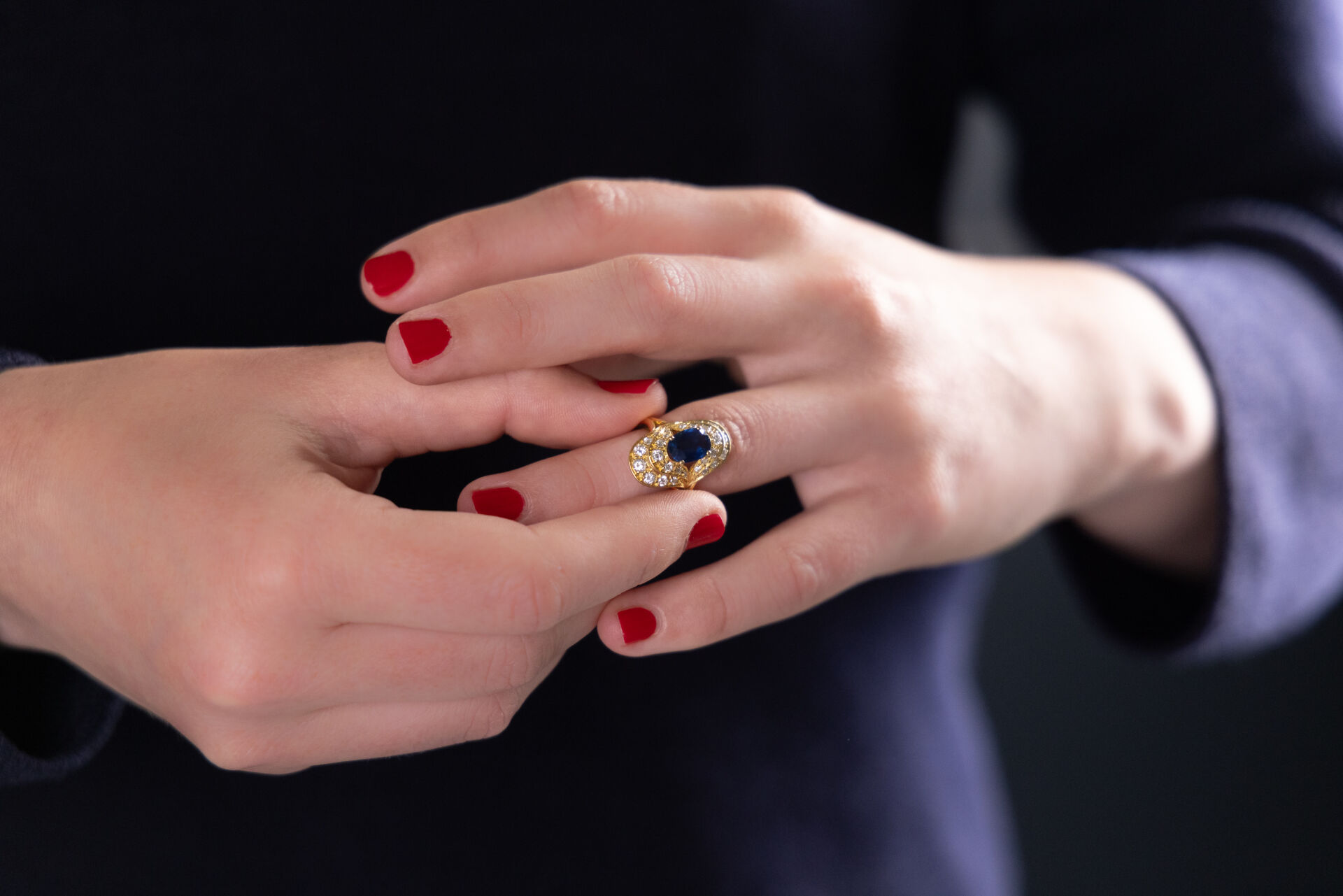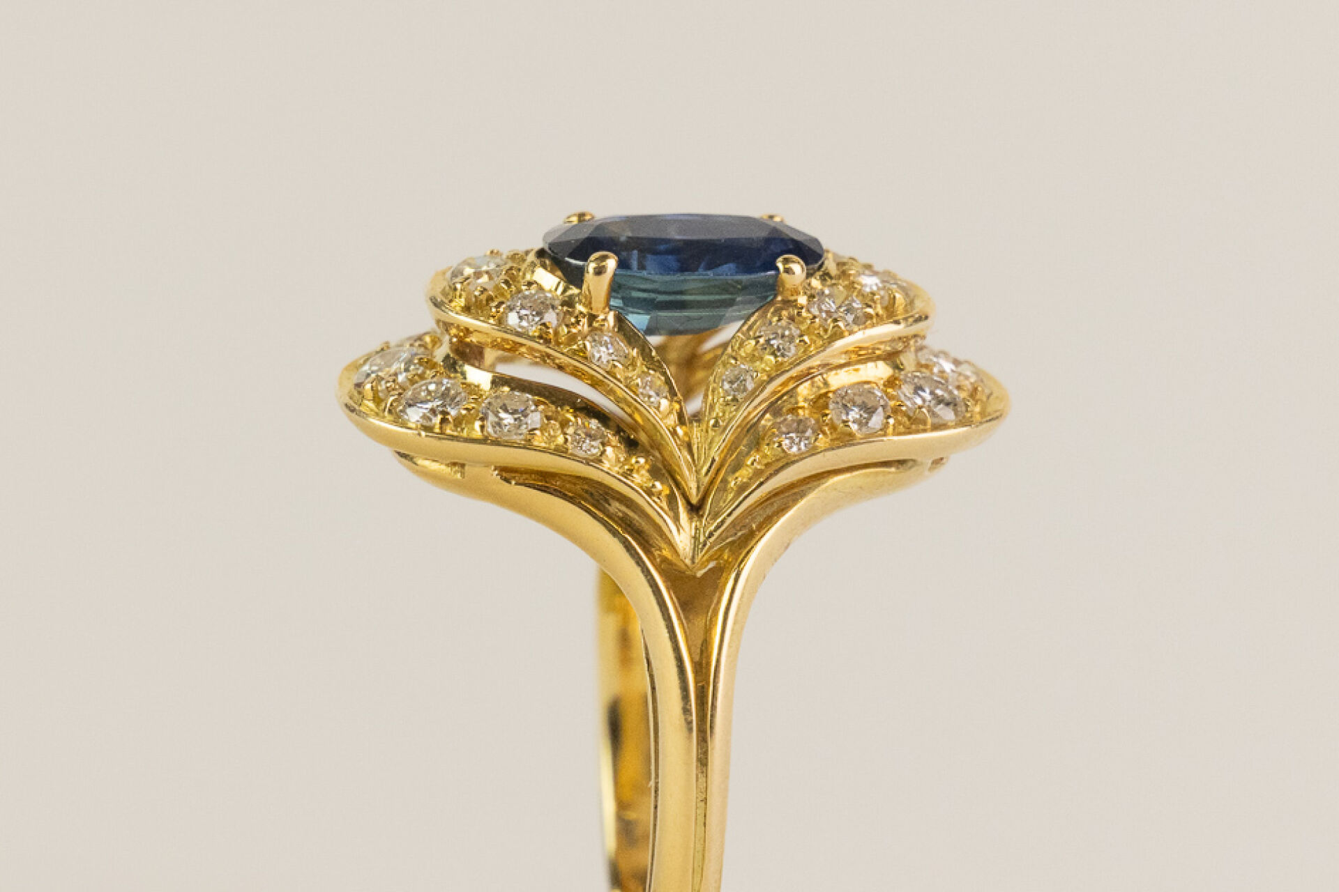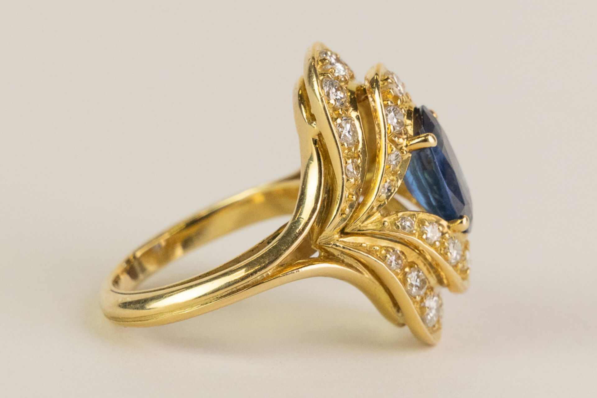 Bague type marquise en or jaune ornée en son centre d'un saphir ovale ponctué de petits diamants sur deux rangées. Tour de doigt : 49 - Poids brut : 7 gr Conditions de vente spécifiques : Les gemmes, pierres et perles peuvent avoir fait l'objet de pratiques d'embellissement (huilage pour les émeraudes, traitement thermique pour les saphirs ou les rubis, blanchiment pour les perles). Ces améliorations sont considérées comme traditionnelles et sont admises par le commerce international des pierres gemmes et des perles. Par conséquent, ces traitements ne sont pas mentionnés au catalogue. De plus, les pierres n'ayant pas été desserties pour fait l'objet d'un examen approfondi en laboratoire, leur poids en carats vous est fourni à titre indicatif et précédé de la mention « environ ».