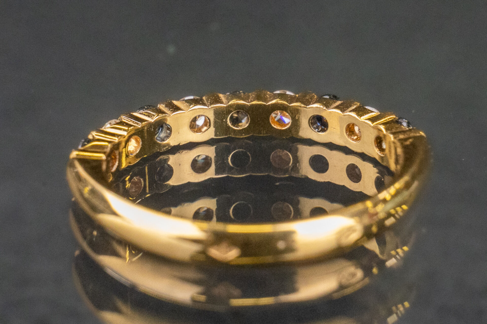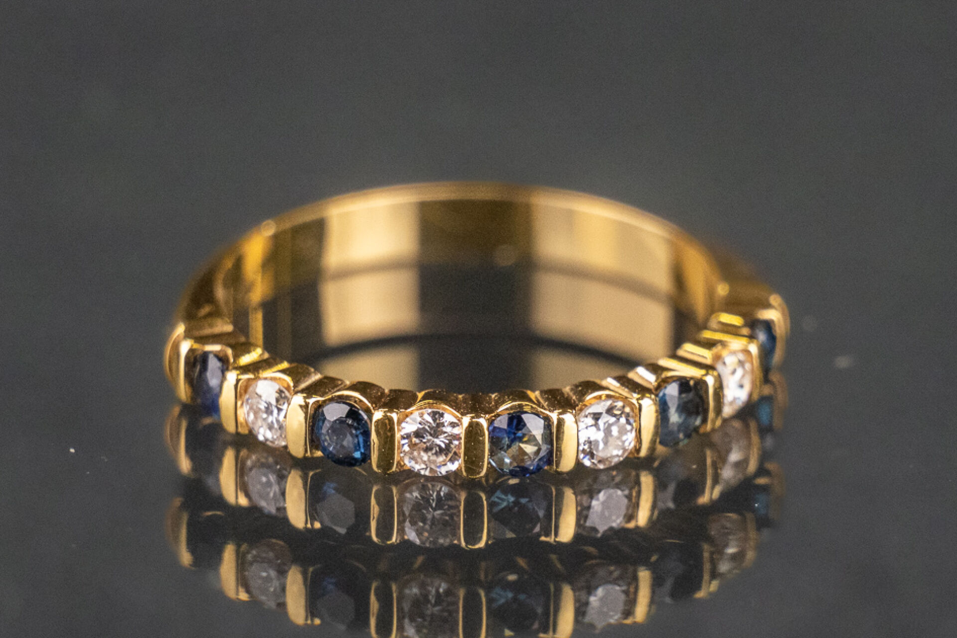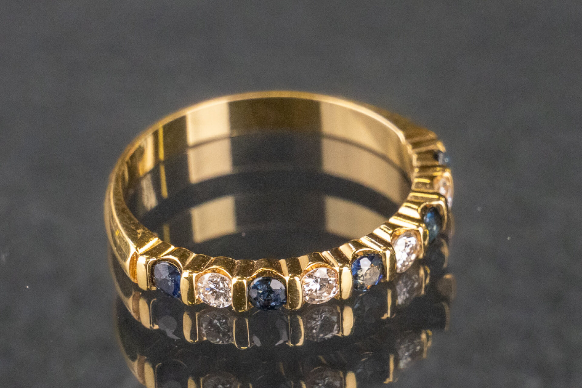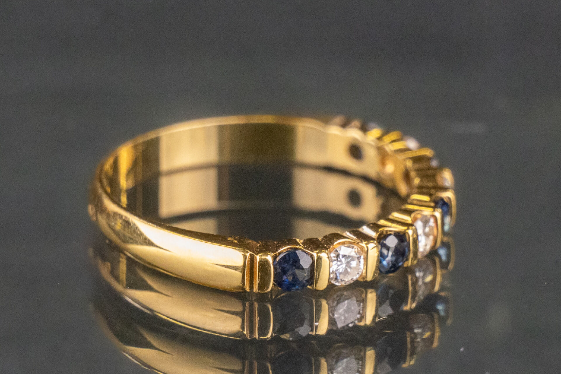 Demi-alliance américaine en or jaune 18k (750 millièmes) sertie de saphirs et diamants taille brillant. Poids brut : 2.4 gr - Tour de doigt 52 Conditions de vente spécifiques : Les gemmes, pierres et perles peuvent avoir fait l'objet de pratiques d'embellissement (huilage pour les émeraudes, traitement thermique pour les saphirs ou les rubis, blanchiment pour les perles). Ces améliorations sont considérées comme traditionnelles et sont admises par le commerce international des pierres gemmes et des perles. Par conséquent, ces traitements ne sont pas mentionnés au catalogue. De plus, les pierres n'ayant pas été desserties pour fait l'objet d'un examen approfondi en laboratoire, elles peuvent être synthétiques. Leur poids en carats vous est fourni à titre indicatif et précédé de la mention « environ ».