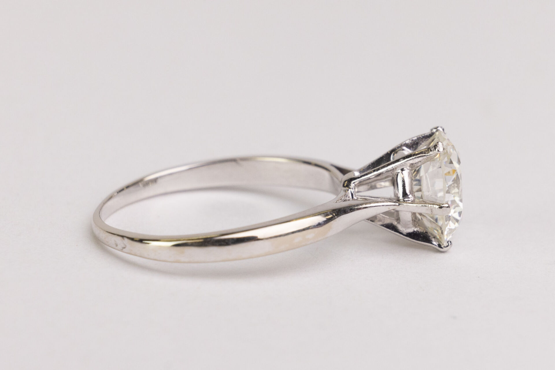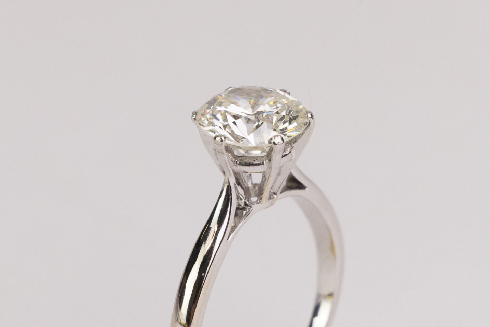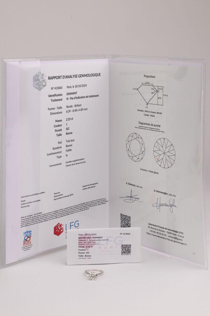 Solitaire en platine serti d'un important diamant rond taille moderne. Nous y joignons son certificat d'analyse gemmologique du LFG attestant son poids de 2.12 carats, sa couleur : J et sa pureté SI2. Tour de doigt : 54 - Poids brut : 3.17 gr Conditions de vente spécifiques : Les gemmes, pierres et perles peuvent avoir fait l'objet de pratiques d'embellissement (huilage pour les émeraudes, traitement thermique pour les saphirs ou les rubis, blanchiment pour les perles). Ces améliorations sont considérées comme traditionnelles et sont admises par le commerce international des pierres gemmes et des perles. Par conséquent, ces traitements ne sont pas mentionnés au catalogue. De plus, les pierres n'ayant pas été desserties pour fait l'objet d'un examen approfondi en laboratoire, leur poids en carats vous est fourni à titre indicatif et précédé de la mention « environ ».