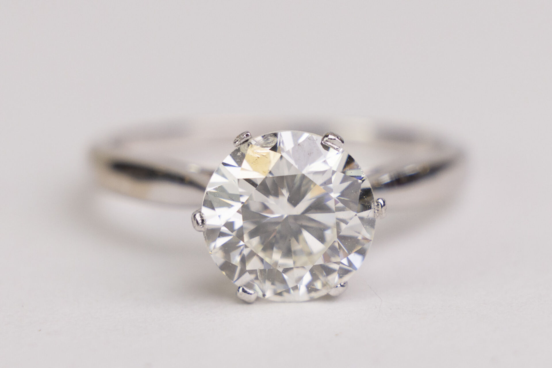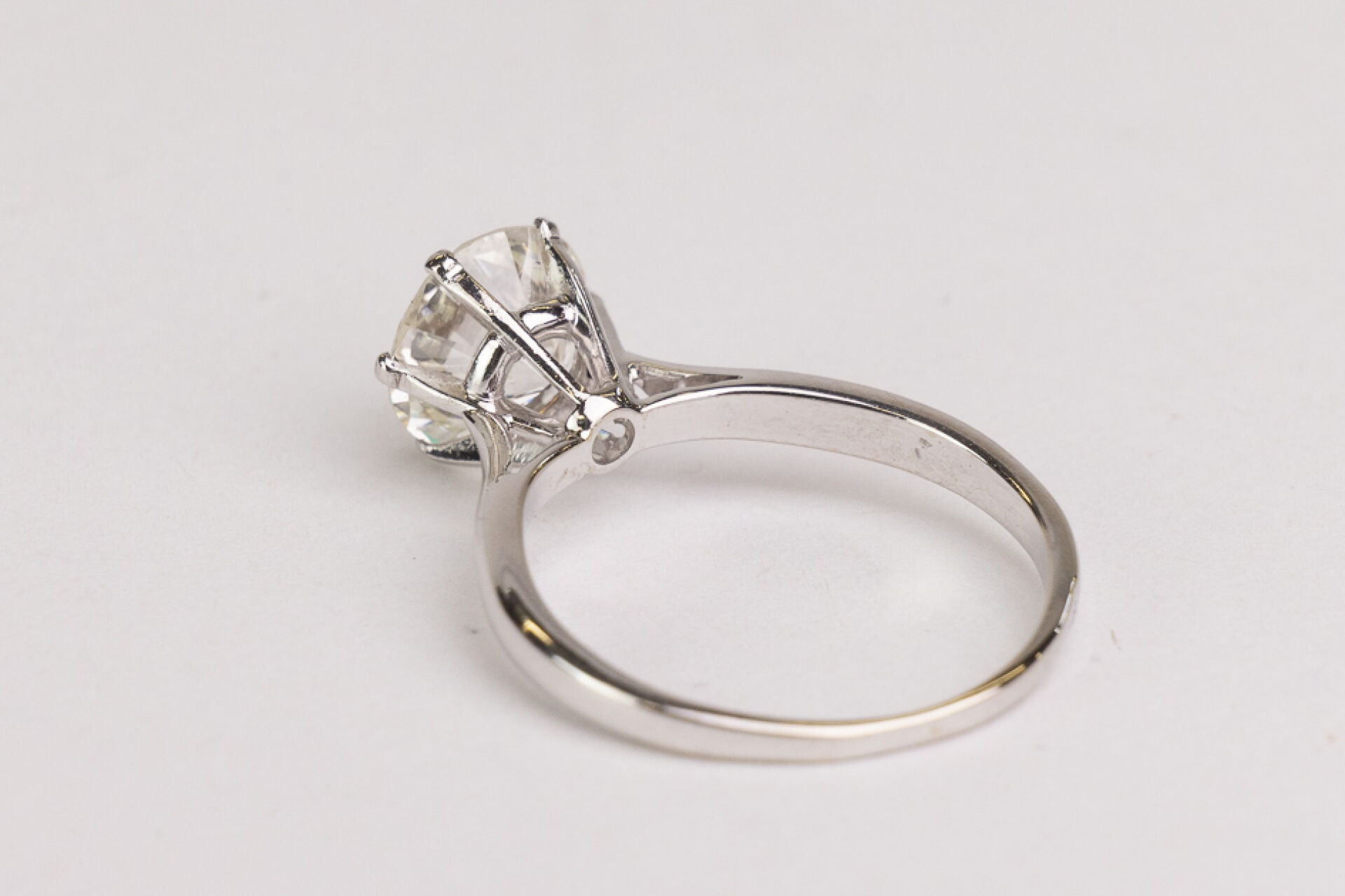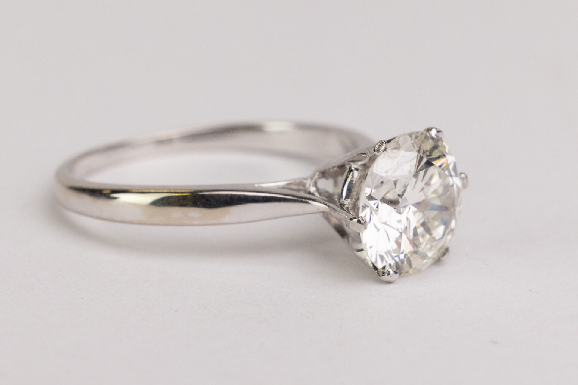Solitaire en platine serti d'un important diamant rond taille moderne. Nous y joignons son certificat d'analyse gemmologique du LFG attestant son poids de 2.12 carats, sa couleur : J et sa pureté SI2. Tour de doigt : 54 - Poids brut : 3.17 gr Conditions de vente spécifiques : Les gemmes, pierres et perles peuvent avoir fait l'objet de pratiques d'embellissement (huilage pour les émeraudes, traitement thermique pour les saphirs ou les rubis, blanchiment pour les perles). Ces améliorations sont considérées comme traditionnelles et sont admises par le commerce international des pierres gemmes et des perles. Par conséquent, ces traitements ne sont pas mentionnés au catalogue. De plus, les pierres n'ayant pas été desserties pour fait l'objet d'un examen approfondi en laboratoire, leur poids en carats vous est fourni à titre indicatif et précédé de la mention « environ ».