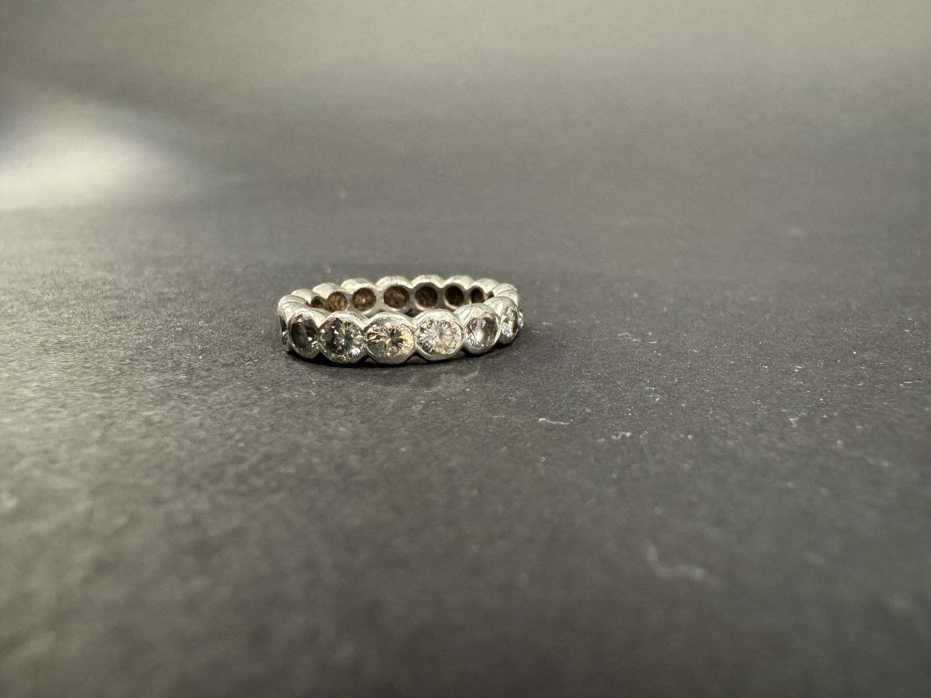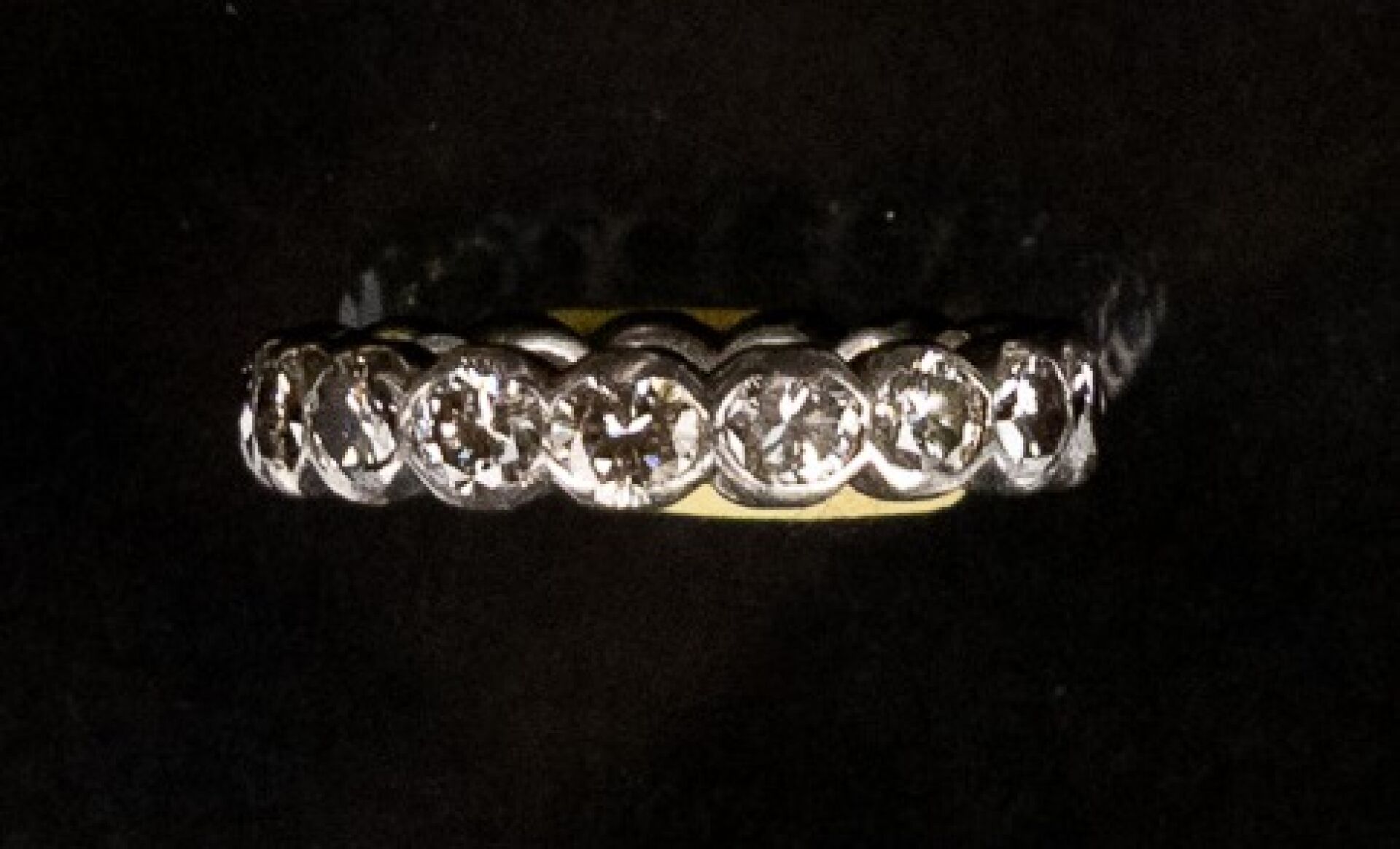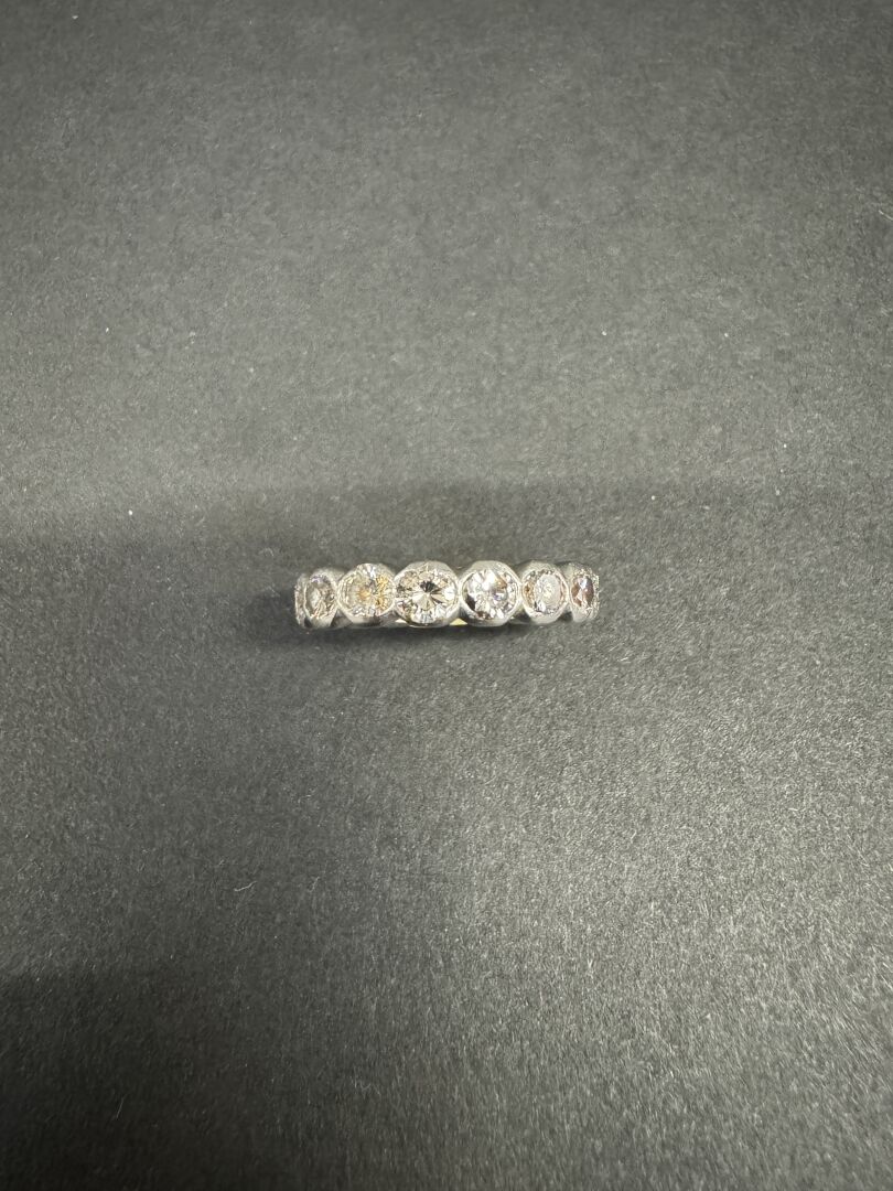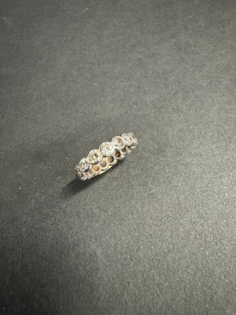 Alliance américaine en platine 850 millièmes sertie de diamants. Poids brut : 6.31 gr - Tour de doigt 54 Conditions de vente spécifiques : Les gemmes, pierres et perles peuvent avoir fait l'objet de pratiques d'embellissement (huilage pour les émeraudes, traitement thermique pour les saphirs ou les rubis, blanchiment pour les perles). Ces améliorations sont considérées comme traditionnelles et sont admises par le commerce international des pierres gemmes et des perles. Par conséquent, ces traitements ne sont pas mentionnés au catalogue. De plus, les pierres n'ayant pas été desserties pour fait l'objet d'un examen approfondi en laboratoire, elles peuvent être synthétiques. Leur poids en carats vous est fourni à titre indicatif et précédé de la mention « environ ».
