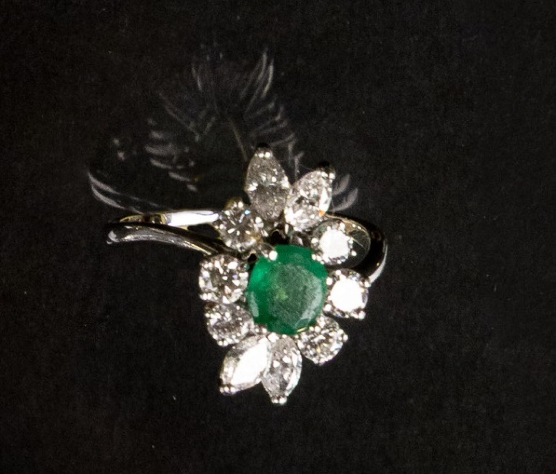 Bague en platine 850 millièmes ?? sertie d'une émeraude dans un entourage de 4 diamants taillés en poire et 6 diamants taille brillant. Poids brut : 5.38 gr - Tour de doigt 57 Egrisures à l'émeraude, deux boules de renfort Conditions de vente spécifiques : Les gemmes, pierres et perles peuvent avoir fait l'objet de pratiques d'embellissement (huilage pour les émeraudes, traitement thermique pour les saphirs ou les rubis, blanchiment pour les perles). Ces améliorations sont considérées comme traditionnelles et sont admises par le commerce international des pierres gemmes et des perles. Par conséquent, ces traitements ne sont pas mentionnés au catalogue. De plus, les pierres n'ayant pas été desserties pour fait l'objet d'un examen approfondi en laboratoire, elles peuvent être synthétiques. Leur poids en carats vous est fourni à titre indicatif et précédé de la mention « environ ».