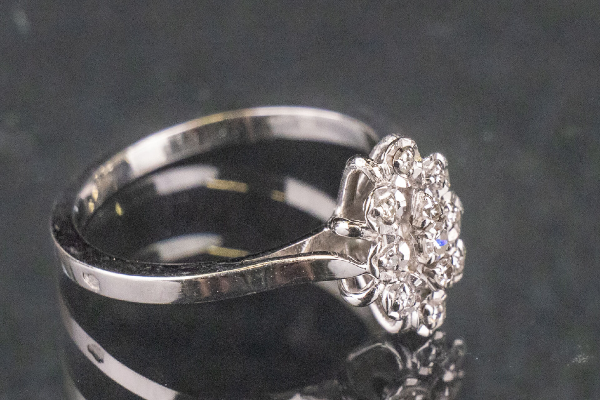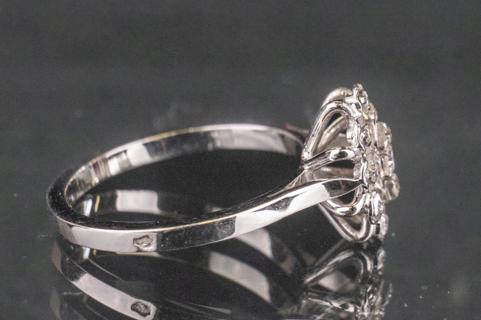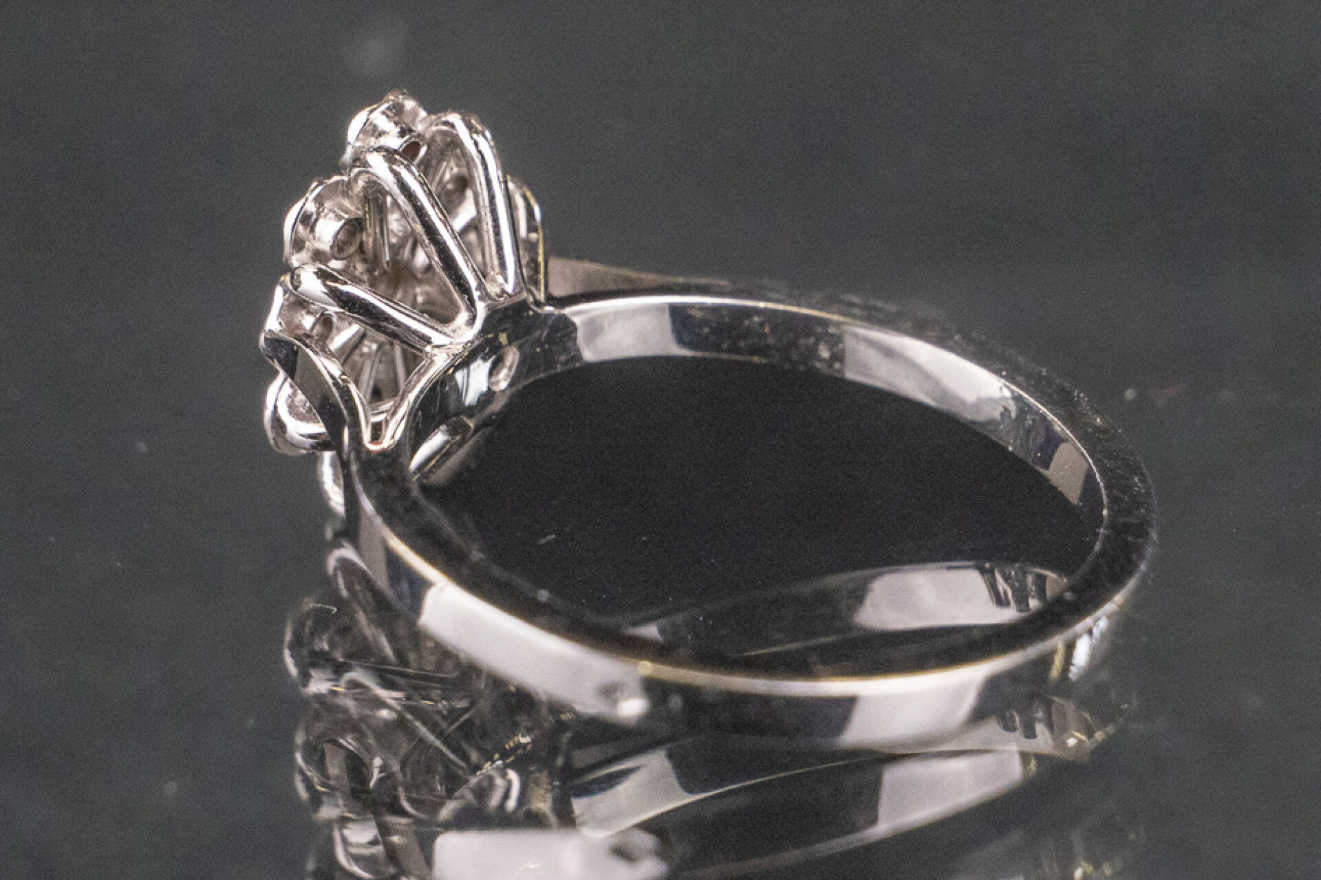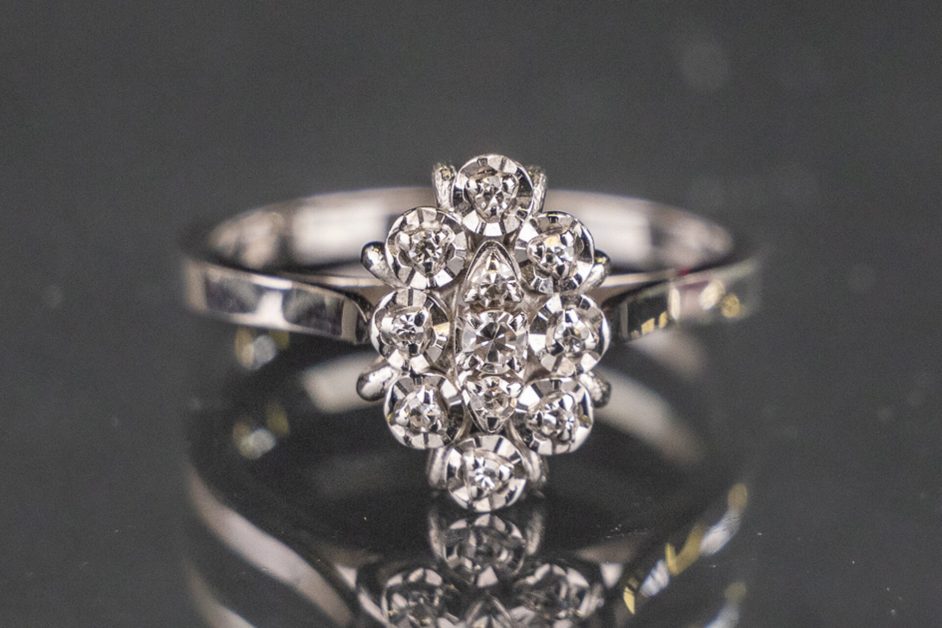 Bague marquise en or blanc 18k (750 millièmes) sertie de diamants taille brillant. Poids brut : 2.7 gr - Tour de doigt 49 Conditions de vente spécifiques : Les gemmes, pierres et perles peuvent avoir fait l'objet de pratiques d'embellissement (huilage pour les émeraudes, traitement thermique pour les saphirs ou les rubis, blanchiment pour les perles). Ces améliorations sont considérées comme traditionnelles et sont admises par le commerce international des pierres gemmes et des perles. Par conséquent, ces traitements ne sont pas mentionnés au catalogue. De plus, les pierres n'ayant pas été desserties pour fait l'objet d'un examen approfondi en laboratoire, elles peuvent être synthétiques. Leur poids en carats vous est fourni à titre indicatif et précédé de la mention « environ ».
