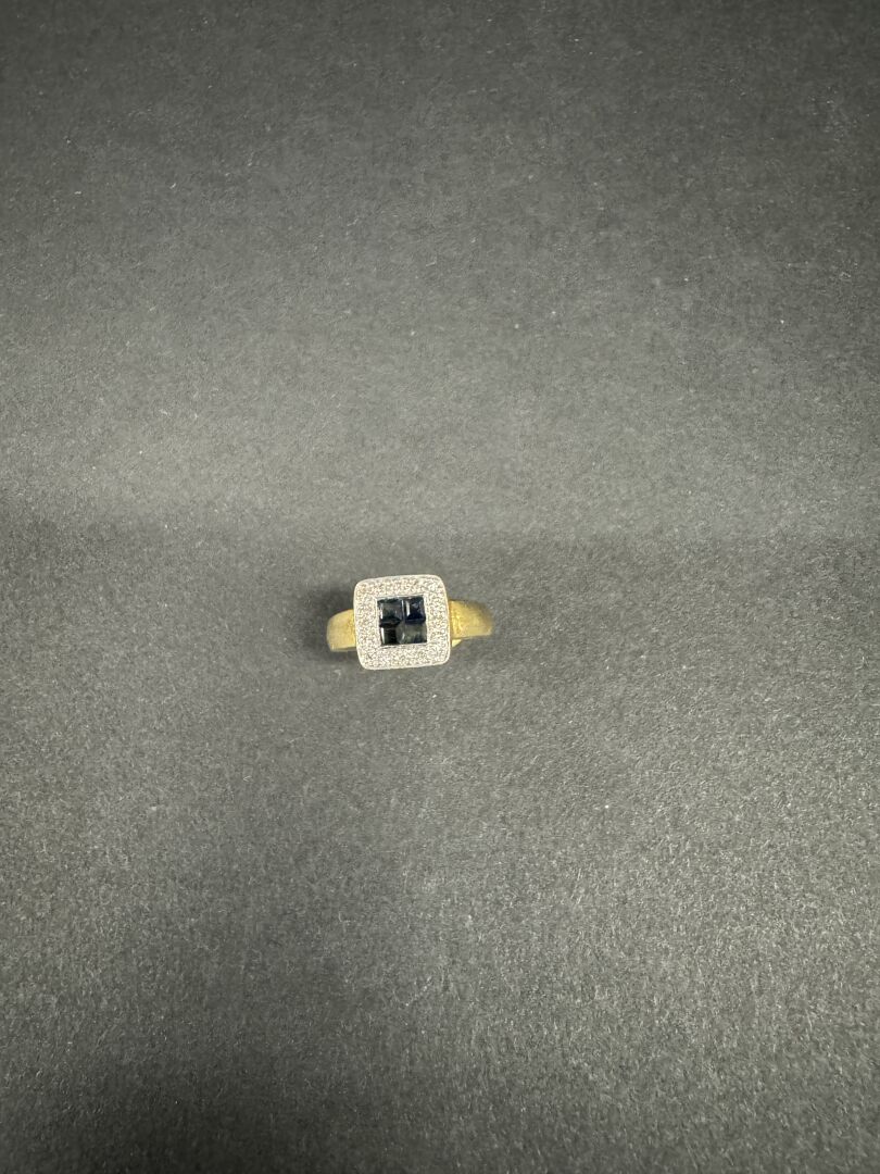 Bague en or jaune 18k (750 millièmes) sertie de quatre petites pierres bleues probablement saphir dans un entourage de diamants taille brillant. Tour de doigt 46 Poids brut : 4.23 gr Conditions de vente spécifiques : Les gemmes, pierres et perles peuvent avoir fait l'objet de pratiques d'embellissement (huilage pour les émeraudes, traitement thermique pour les saphirs ou les rubis, blanchiment pour les perles). Ces améliorations sont considérées comme traditionnelles et sont admises par le commerce international des pierres gemmes et des perles. Par conséquent, ces traitements ne sont pas mentionnés au catalogue. De plus, les pierres n'ayant pas été desserties pour fait l'objet d'un examen approfondi en laboratoire, elles peuvent être synthétiques. Leur poids en carats vous est fourni à titre indicatif et précédé de la mention « environ ».