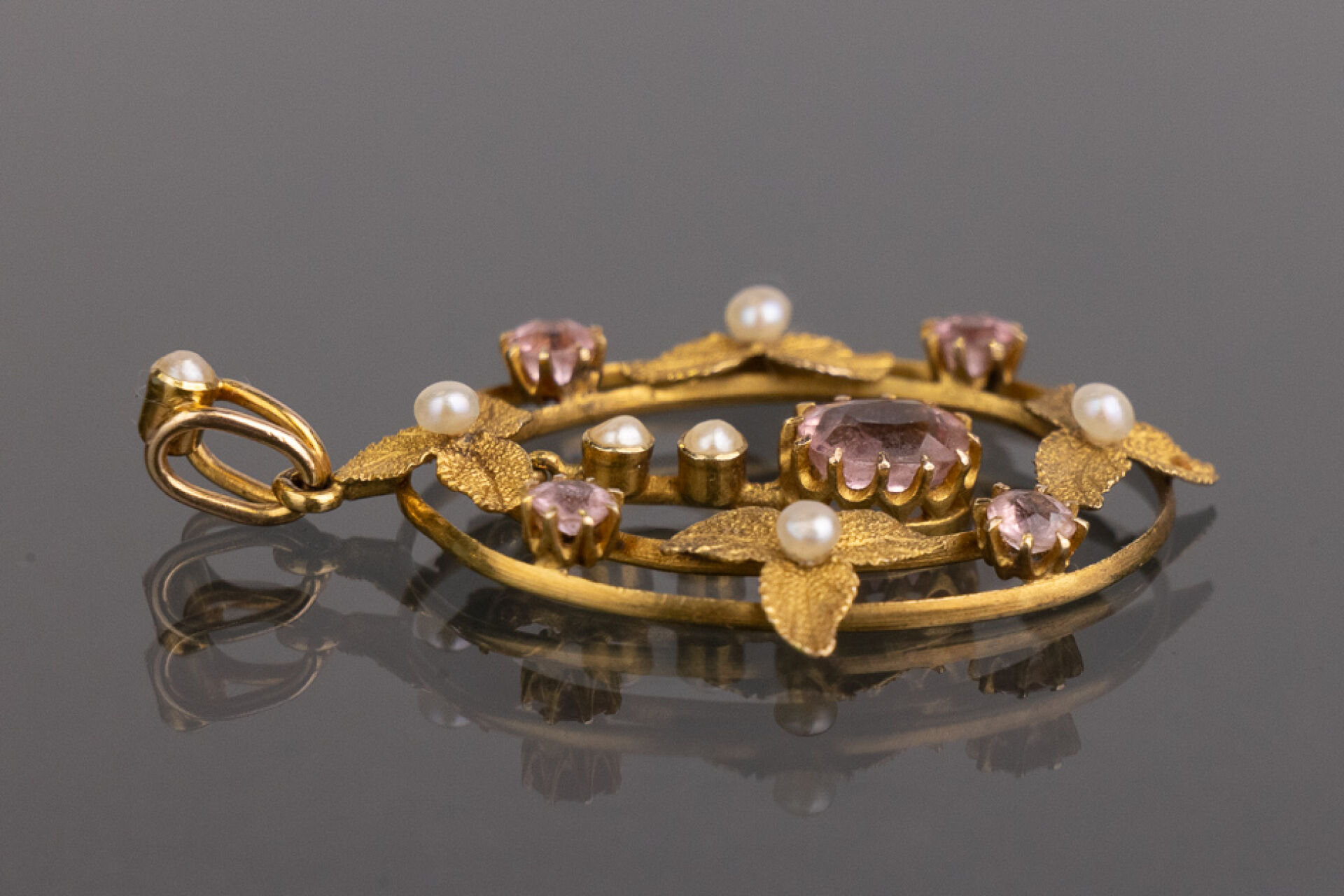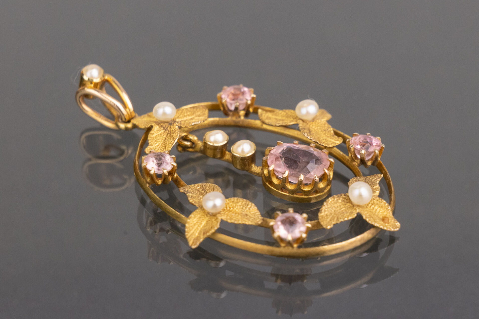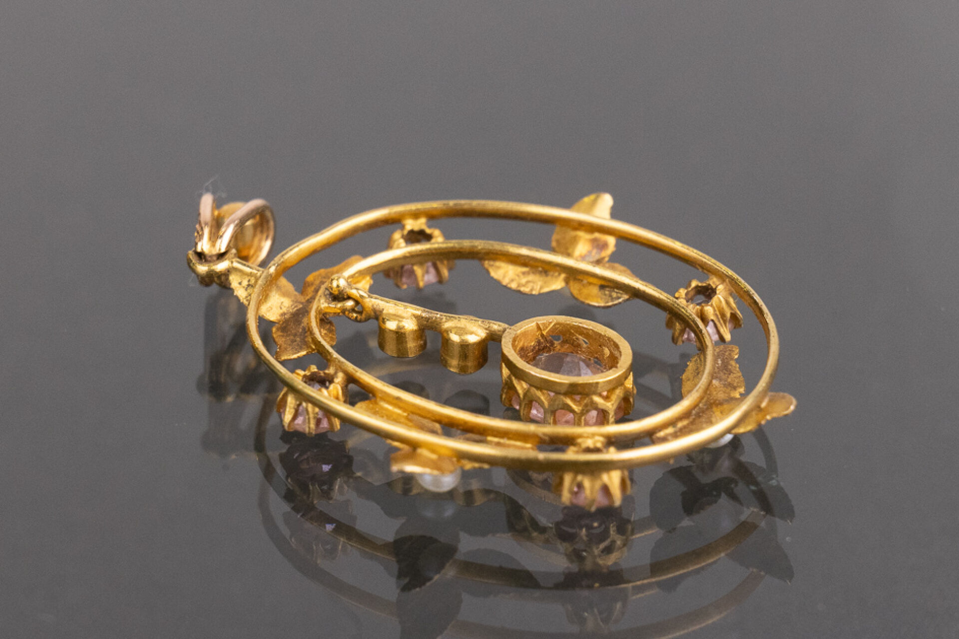 Broche de forme ovale ajourée en or jaune 18k (750 millièmes) à décor de feuilles, pierres roses et perles. Poids brut : 2,48 gr - Haut. : 3 cm