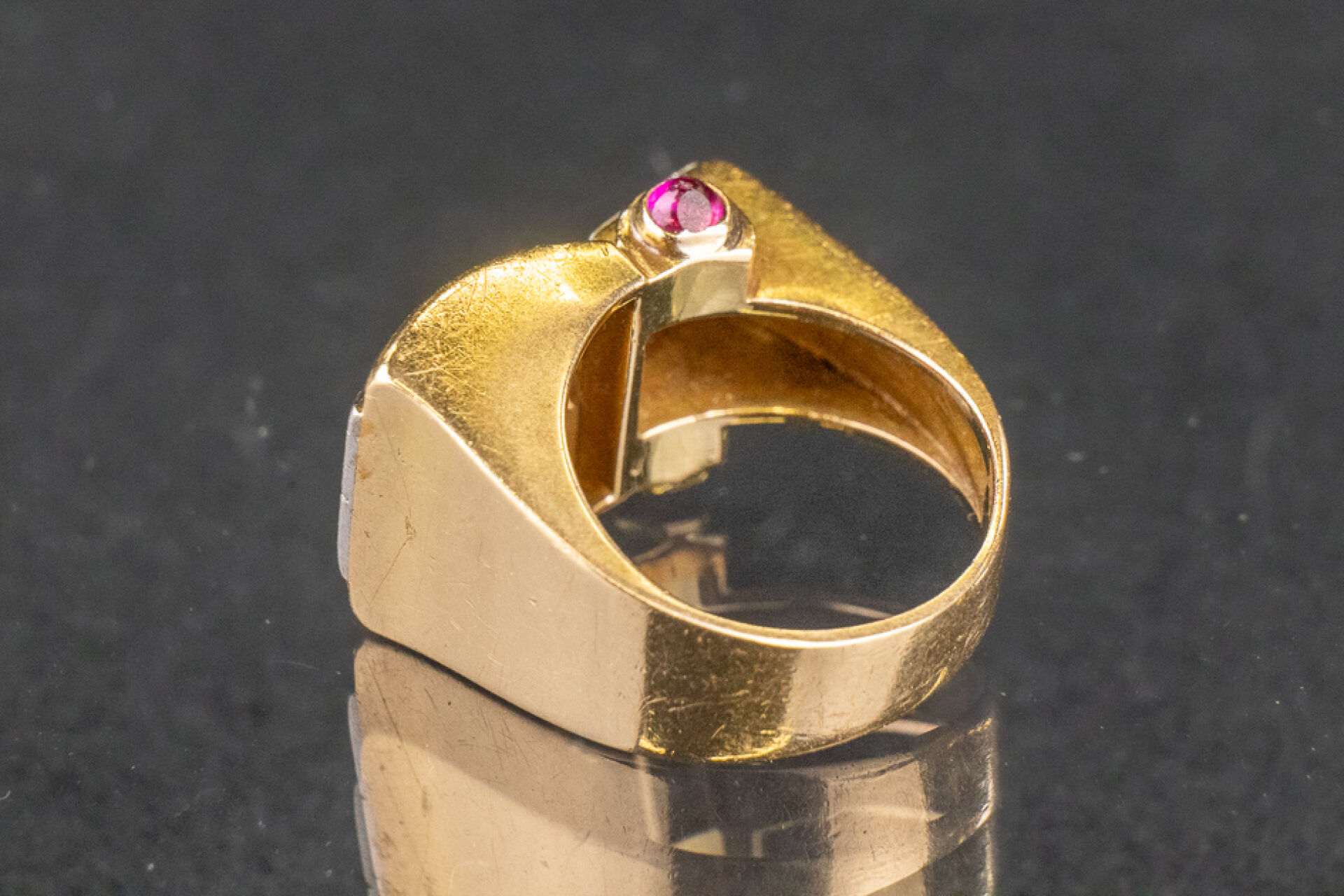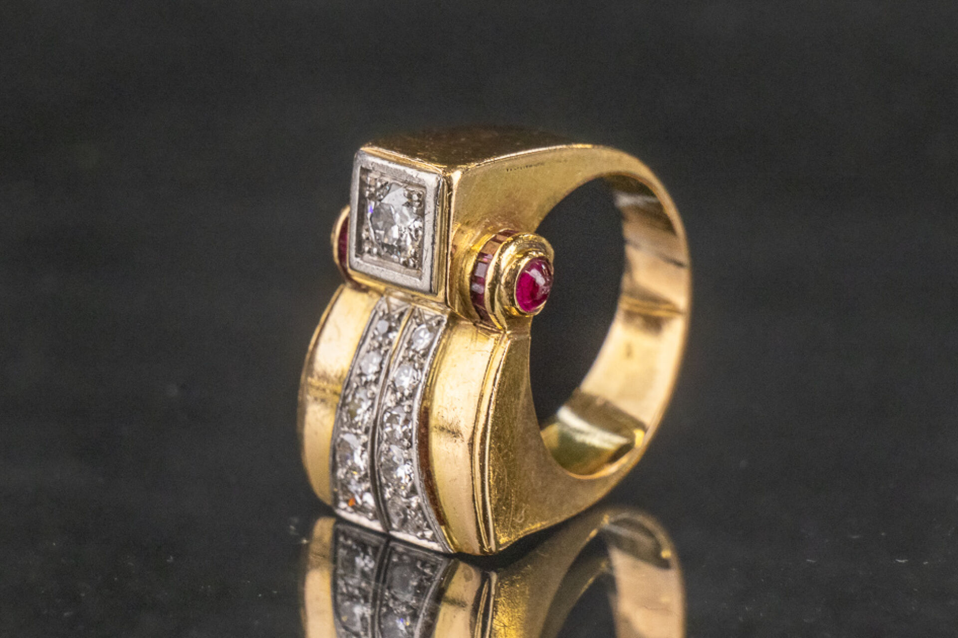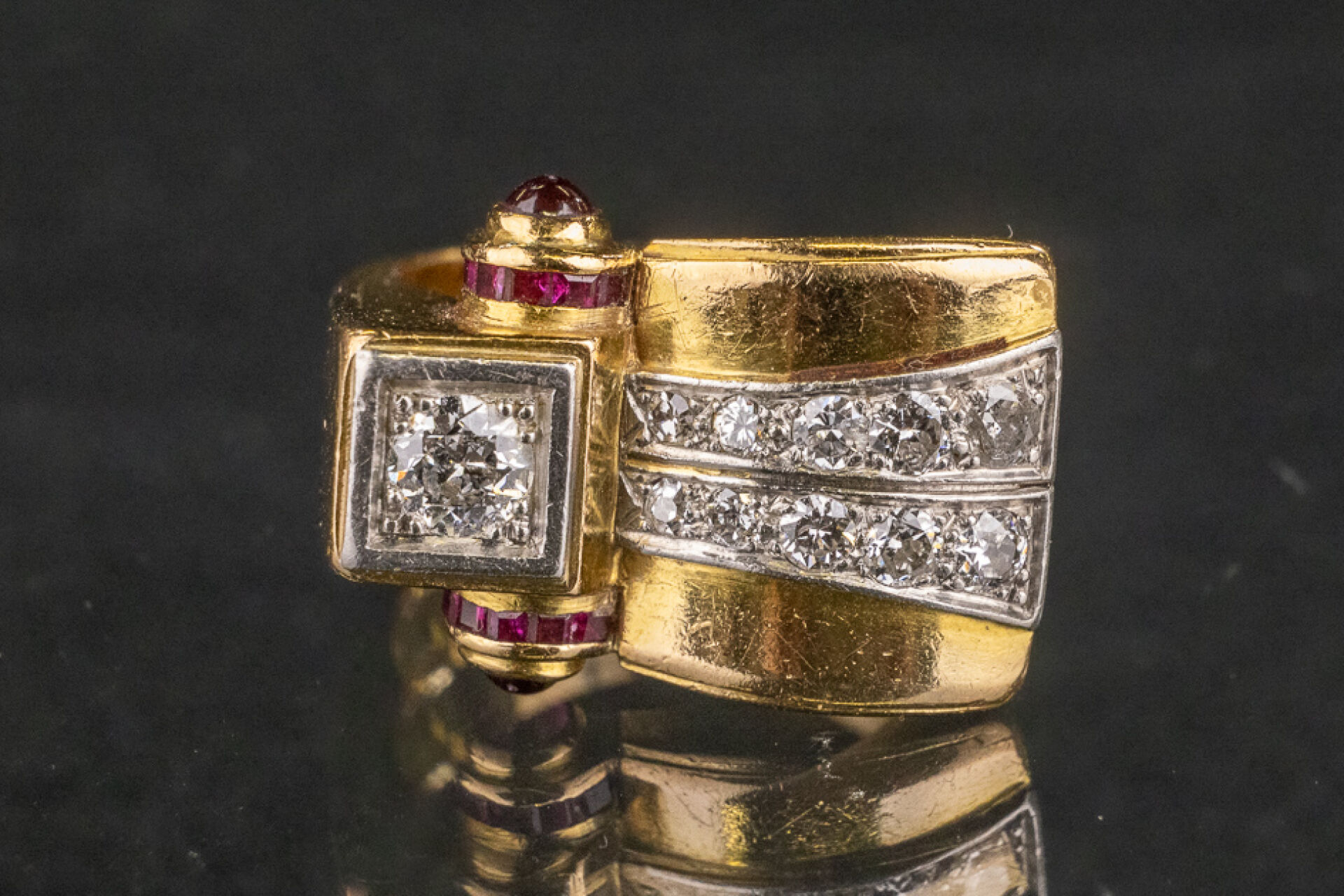 Bague tank en or jaune 18k (750 millièmes) sertie de diamants sur deux lignes et un principal et de rubis calibrées et cabochons. Poids brut : 13.9 gr - Tour de doigt 53 Conditions de vente spécifiques : Les gemmes, pierres et perles peuvent avoir fait l'objet de pratiques d'embellissement (huilage pour les émeraudes, traitement thermique pour les saphirs ou les rubis, blanchiment pour les perles). Ces améliorations sont considérées comme traditionnelles et sont admises par le commerce international des pierres gemmes et des perles. Par conséquent, ces traitements ne sont pas mentionnés au catalogue. De plus, les pierres n'ayant pas été desserties pour fait l'objet d'un examen approfondi en laboratoire, elles peuvent être synthétiques. Leur poids en carats vous est fourni à titre indicatif et précédé de la mention « environ ».