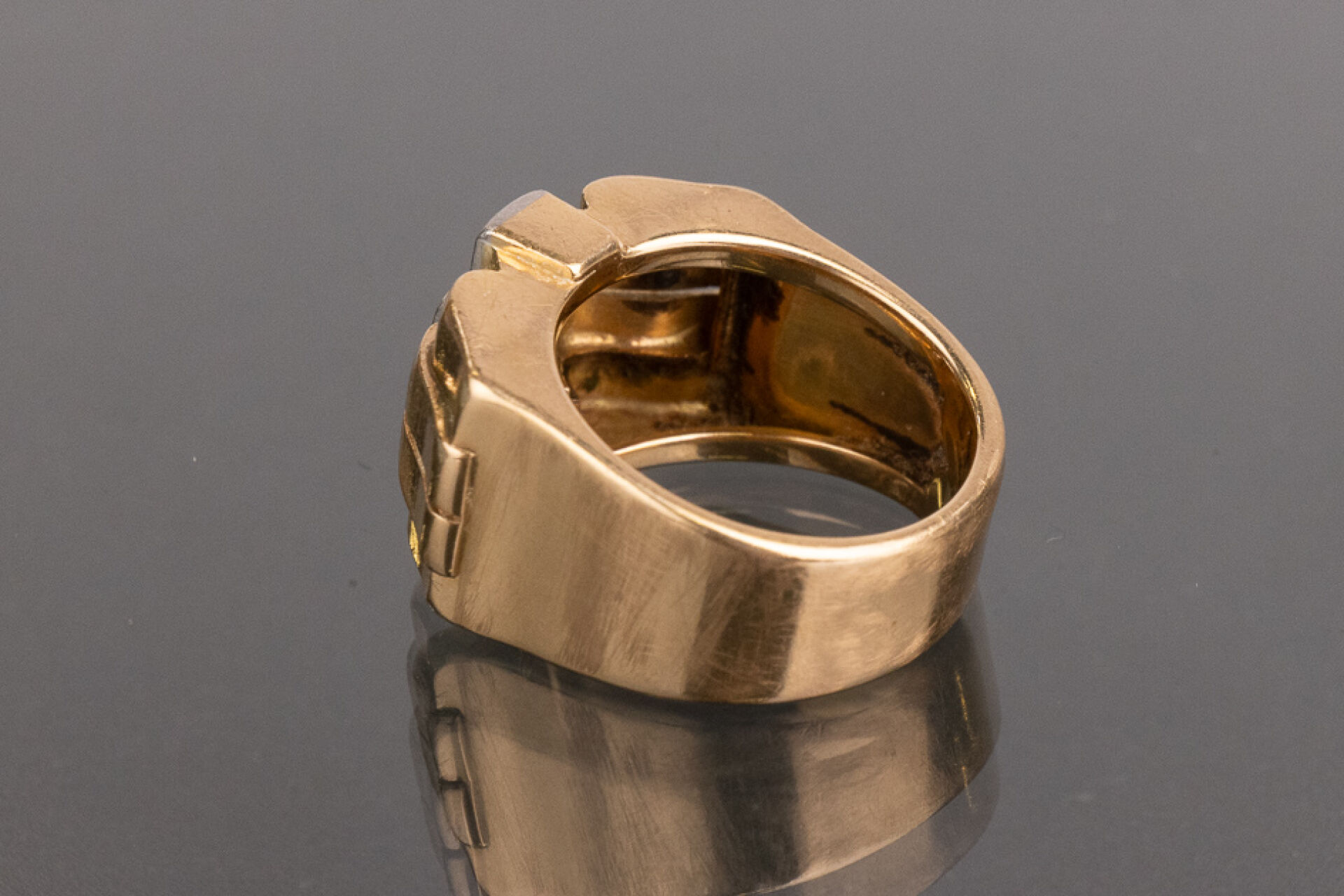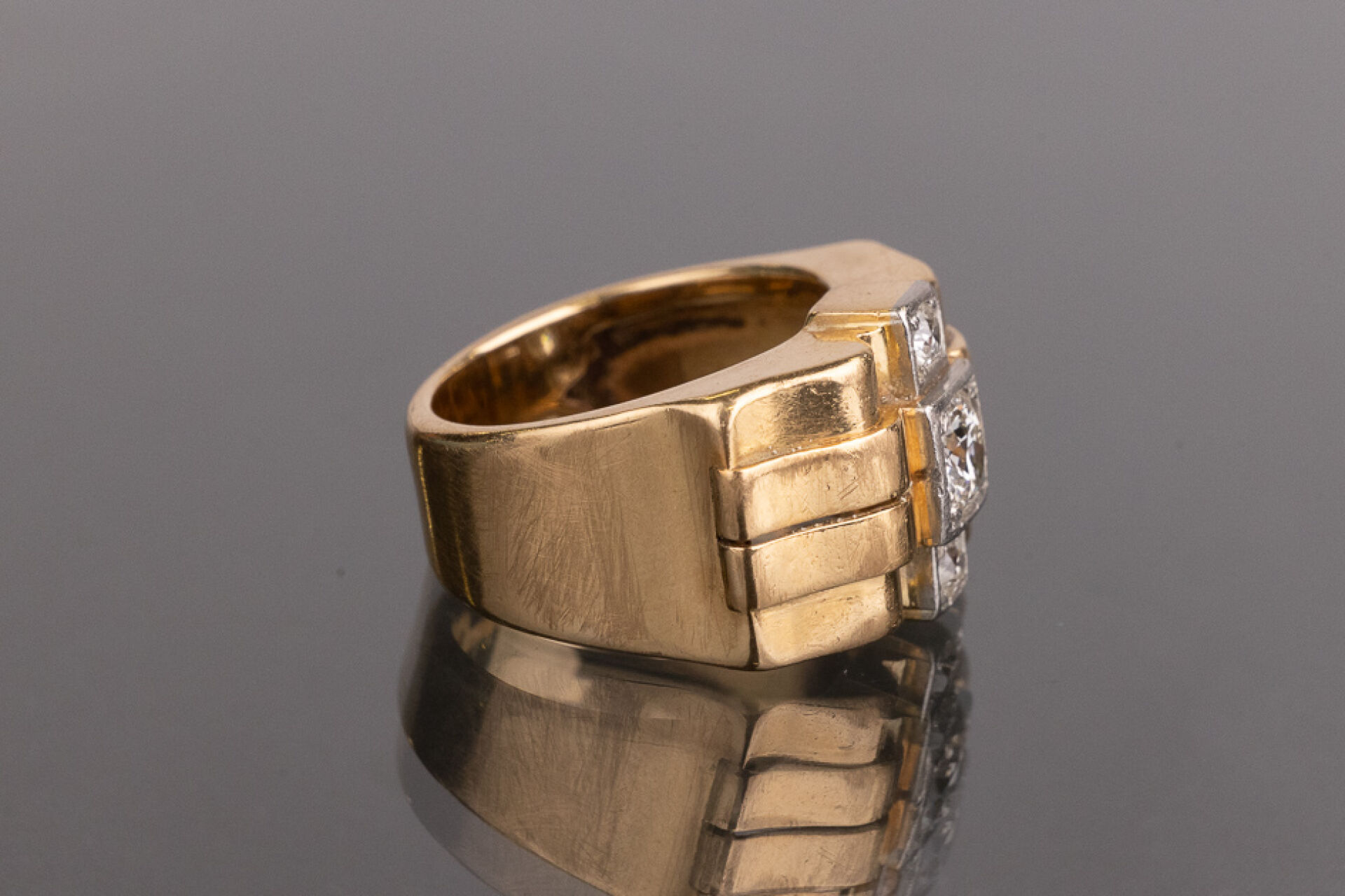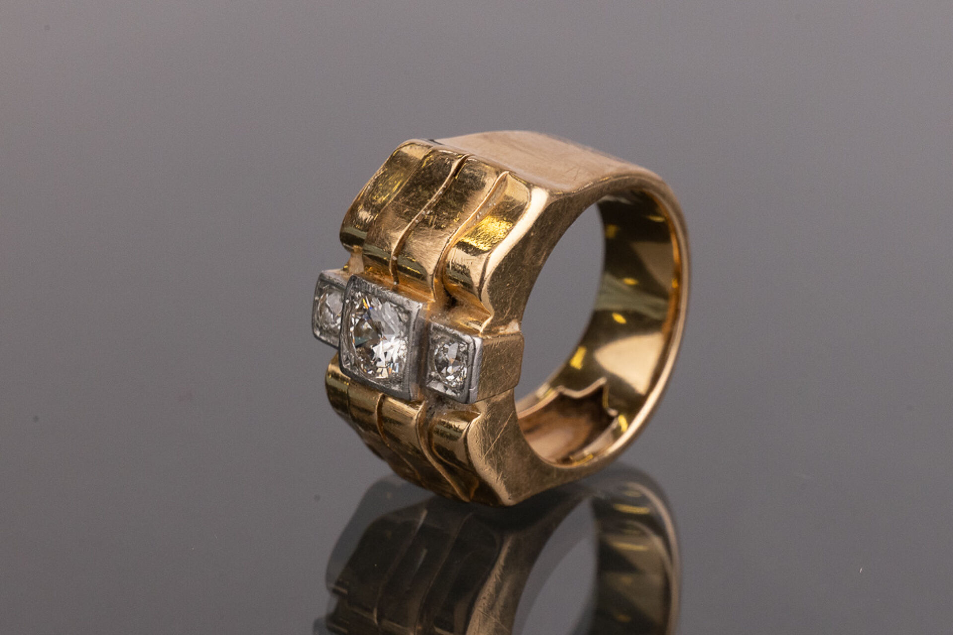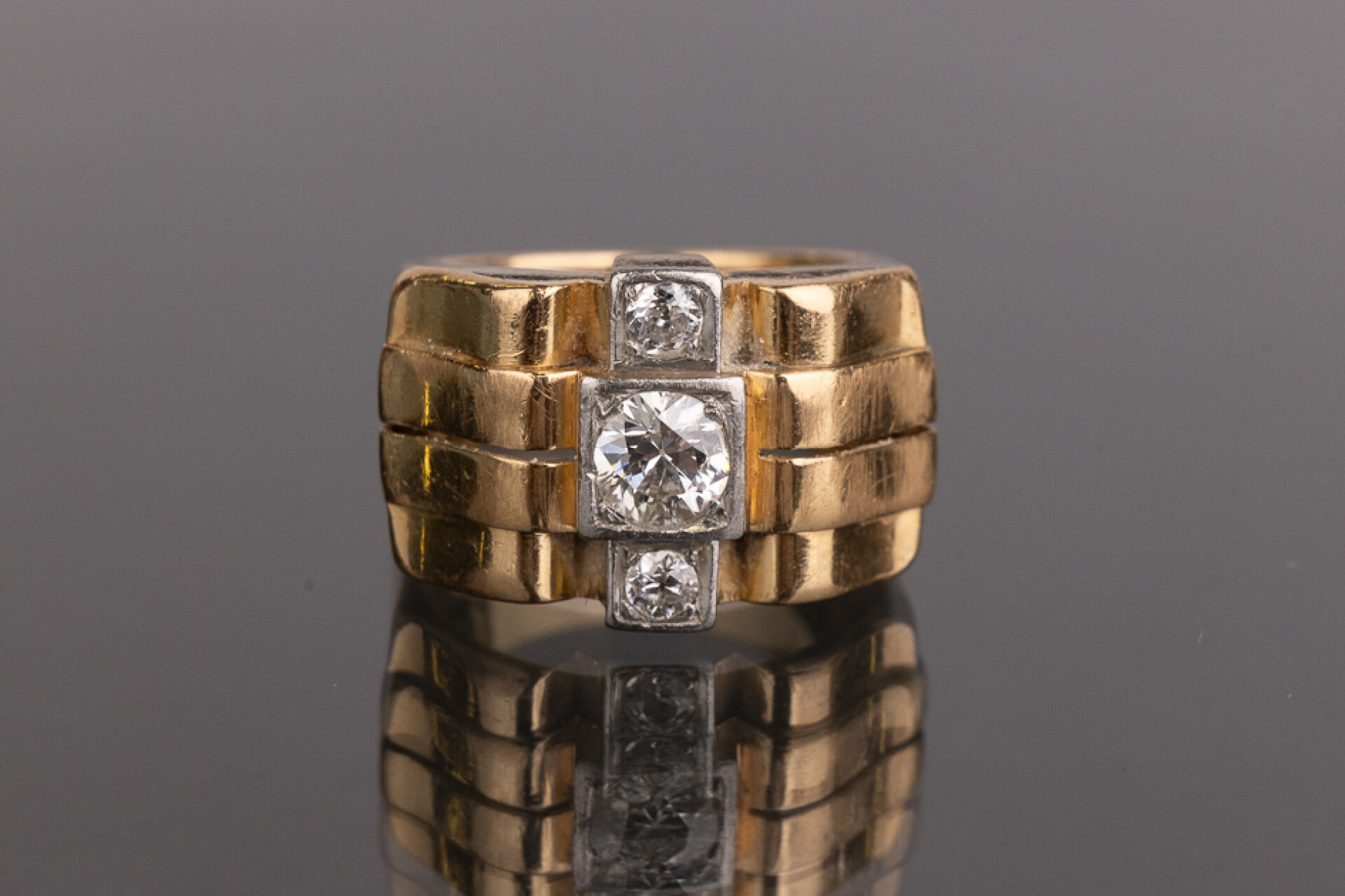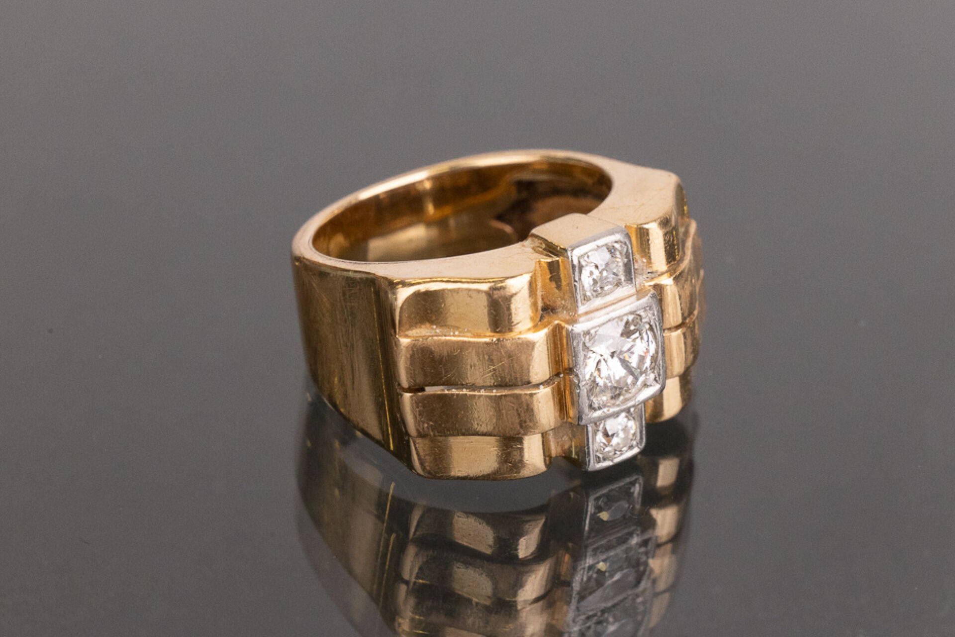 Bague tank en or rose 18k (750 millièmes) sertie de trois diamants superposés de taille brillant d'environ 0.75 carat pour le diamant central et 0.05 pour les deux plus petits. Poids brut : 10.96 gr - Tour de doigt 53 Conditions de vente spécifiques : Les gemmes, pierres et perles peuvent avoir fait l'objet de pratiques d'embellissement (huilage pour les émeraudes, traitement thermique pour les saphirs ou les rubis, blanchiment pour les perles). Ces améliorations sont considérées comme traditionnelles et sont admises par le commerce international des pierres gemmes et des perles. Par conséquent, ces traitements ne sont pas mentionnés au catalogue. De plus, les pierres n'ayant pas été desserties pour fait l'objet d'un examen approfondi en laboratoire, elles peuvent être synthétiques. Leur poids en carats vous est fourni à titre indicatif et précédé de la mention « environ ».