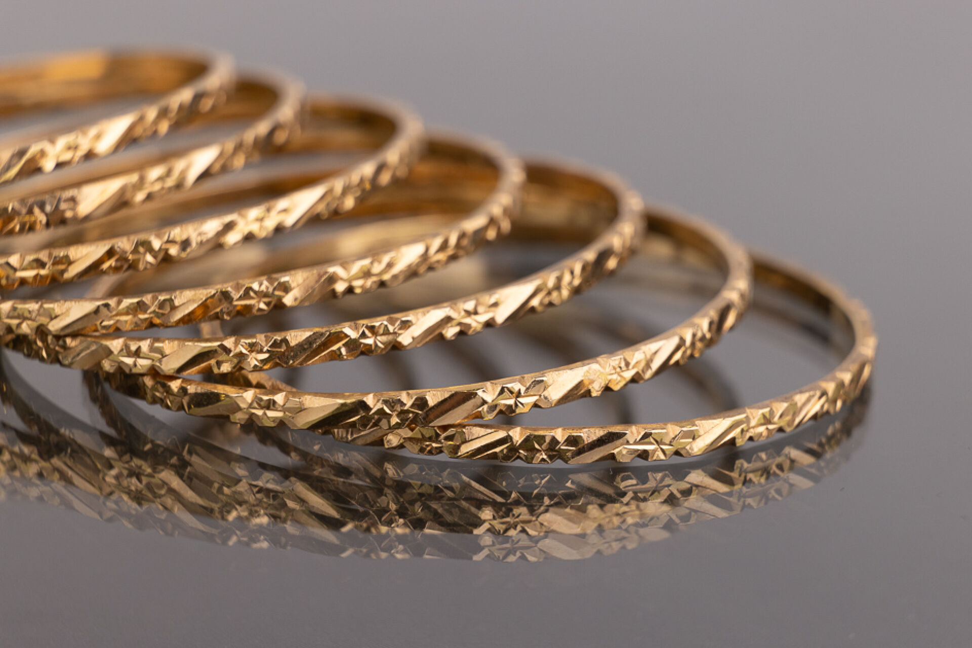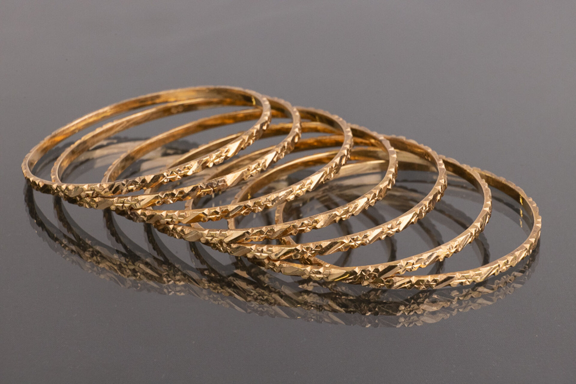 Ensemble de sept bracelets en or rose 18k (750 millièmes) à motifs géométriques martelés. Poids : 98,23 gr - Diam. : 6,1 cm