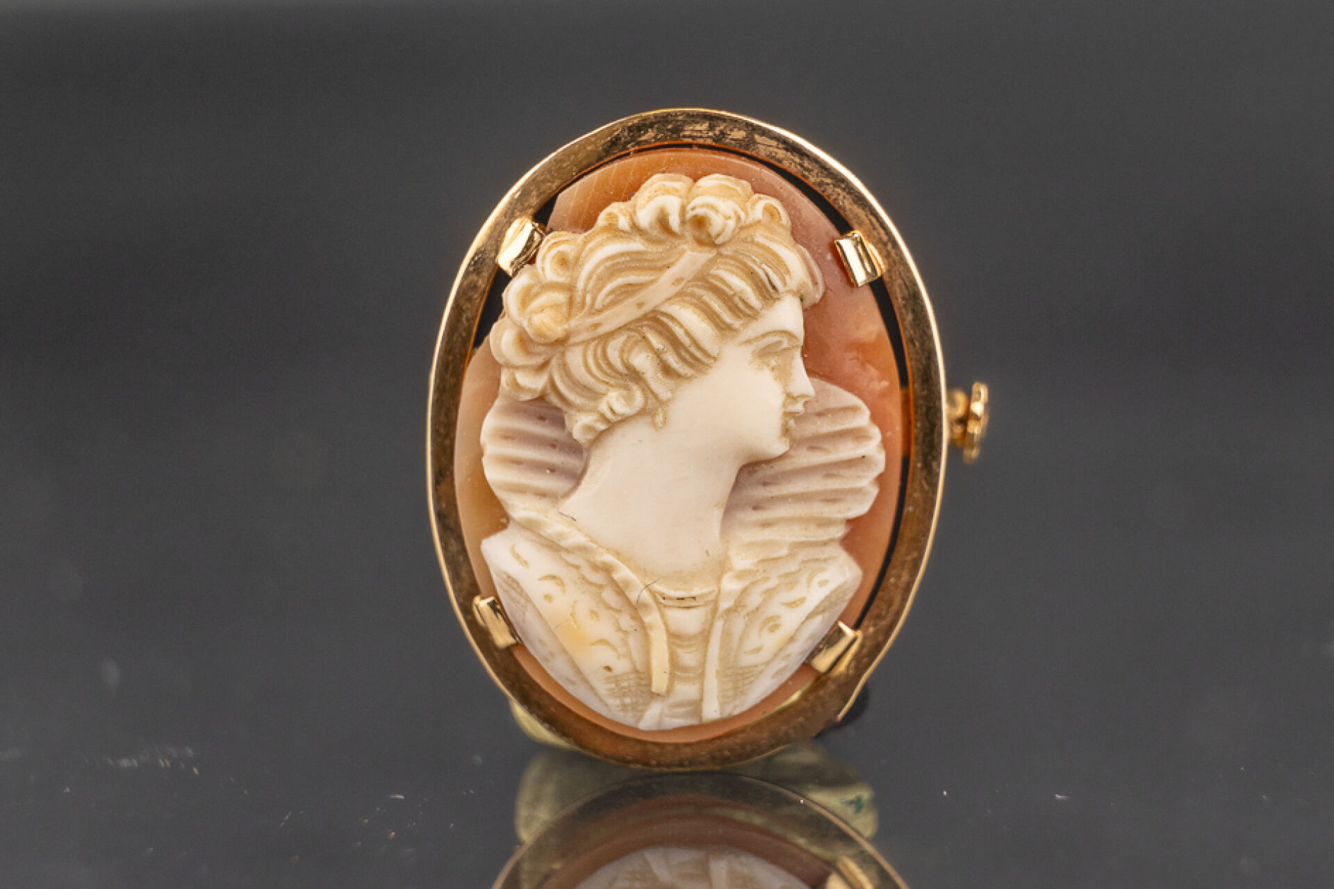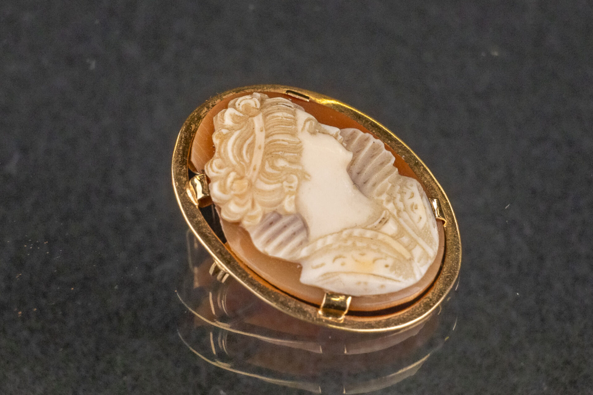 Broche pouvant former pendentif en or jaune 18k (750 millièmes) sertie d'un camée coquille figurant une femme de profil vêtue à la manière de la Renaissance. Poids brut : 4.0 gr - Haut. : 2.7 cm