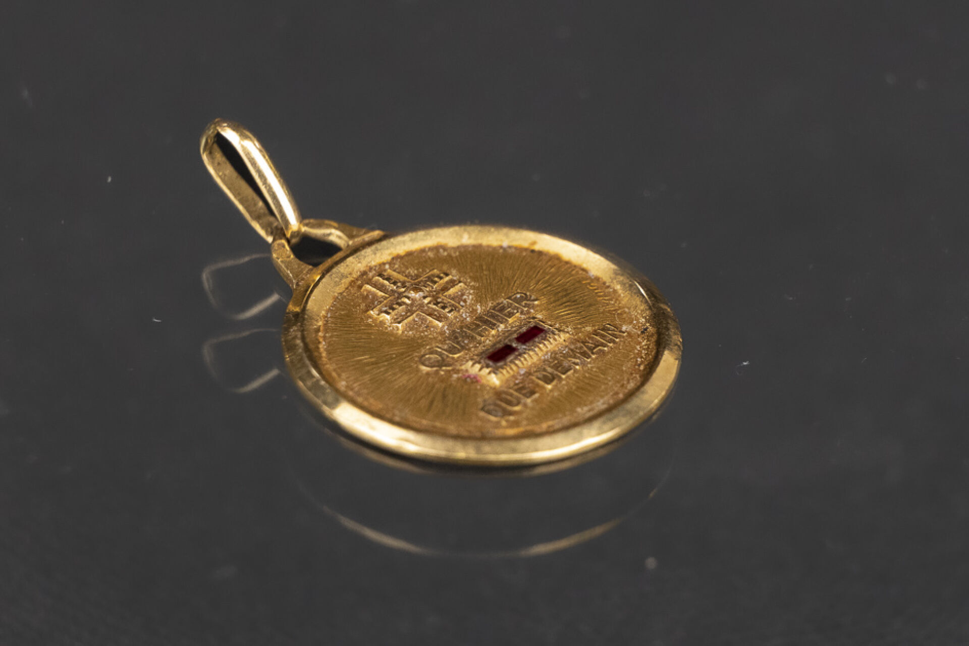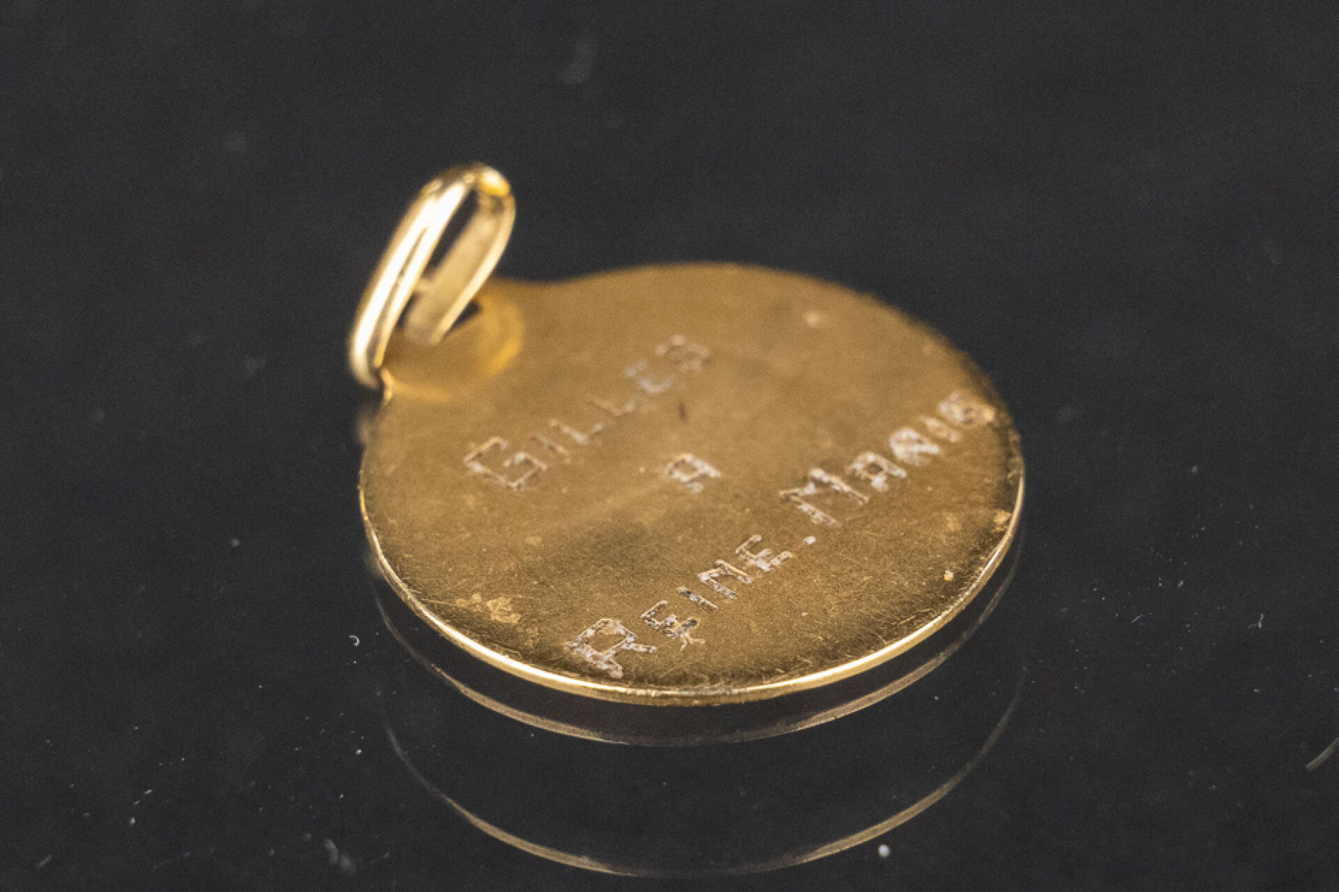Médaille en or jaune 18k (750 millièmes) "+ qu'hier - que demain", gravée au dos Gilles à Reine-Marie. Poids brut : 2,95 gr - Diam. : 1,8 cm