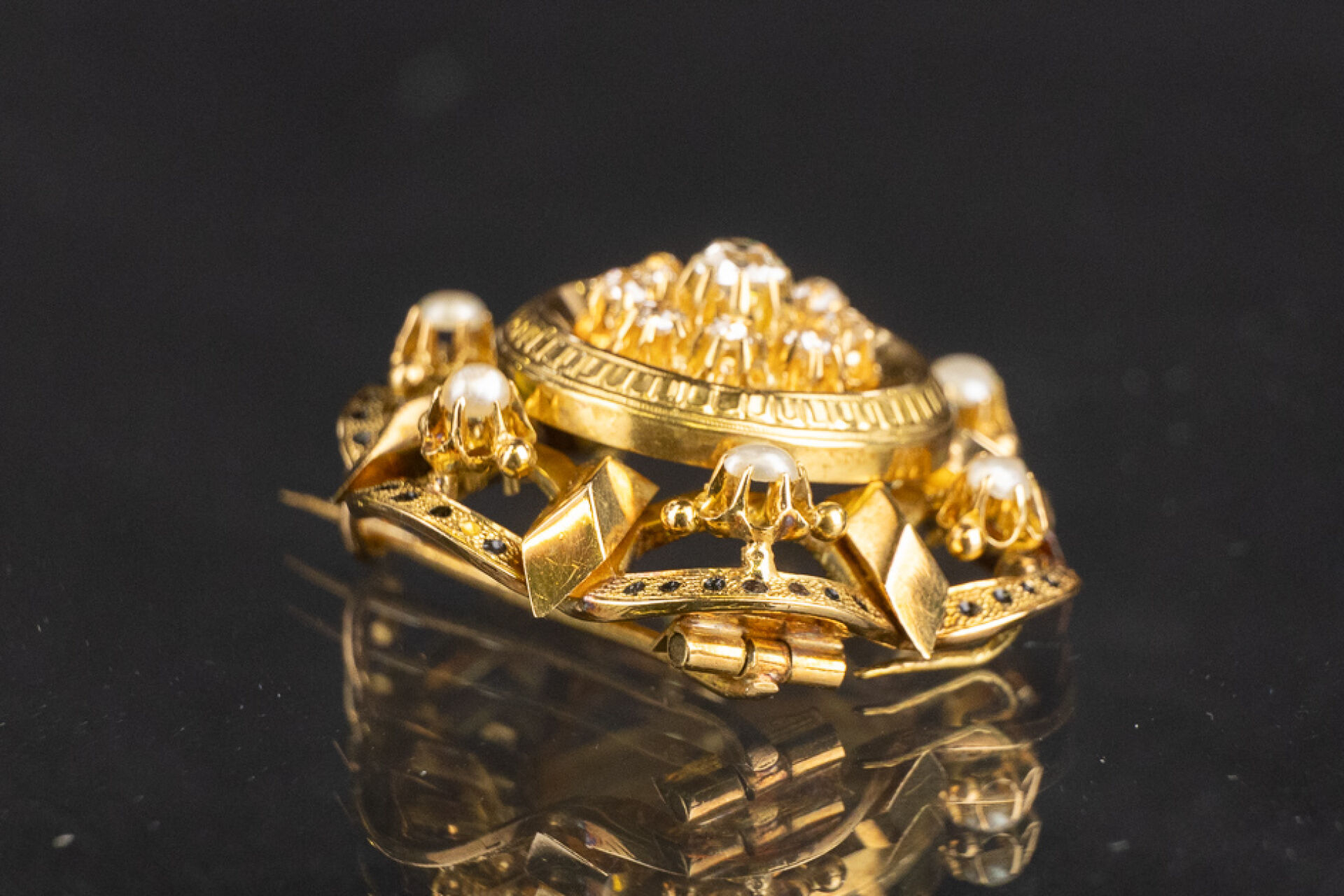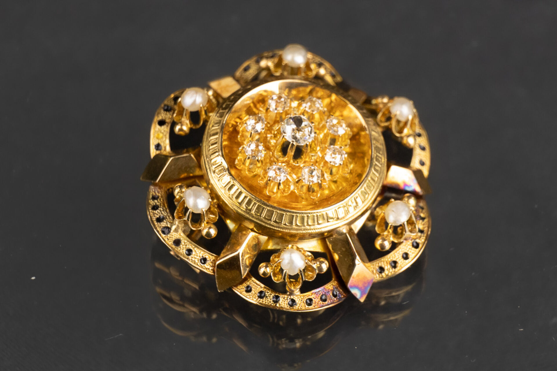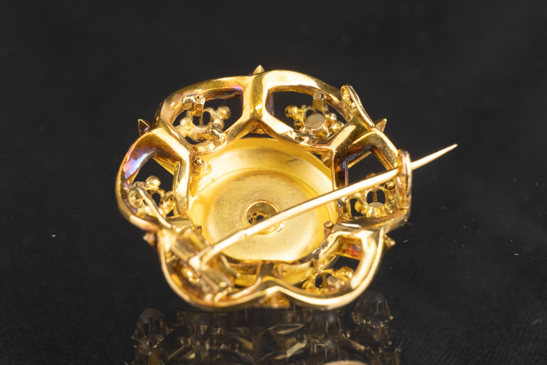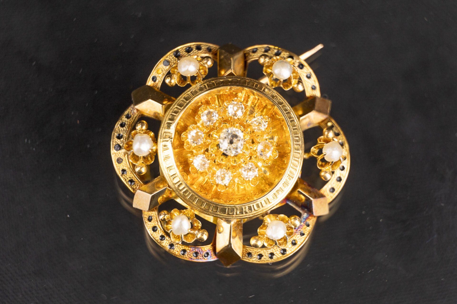 Broche en or jaune 18k (750 millièmes) formant une fleur sertie de 8 diamants et un diamant central plus important au centre, perles et petites pierres bleues probablement saphir. Poids brut : 17.05 gr - Diam. : 4 cm Conditions de vente spécifiques : Les gemmes, pierres et perles peuvent avoir fait l'objet de pratiques d'embellissement (huilage pour les émeraudes, traitement thermique pour les saphirs ou les rubis, blanchiment pour les perles). Ces améliorations sont considérées comme traditionnelles et sont admises par le commerce international des pierres gemmes et des perles. Par conséquent, ces traitements ne sont pas mentionnés au catalogue. De plus, les pierres n'ayant pas été desserties pour fait l'objet d'un examen approfondi en laboratoire, elles peuvent être synthétiques. Leur poids en carats vous est fourni à titre indicatif et précédé de la mention « environ ».