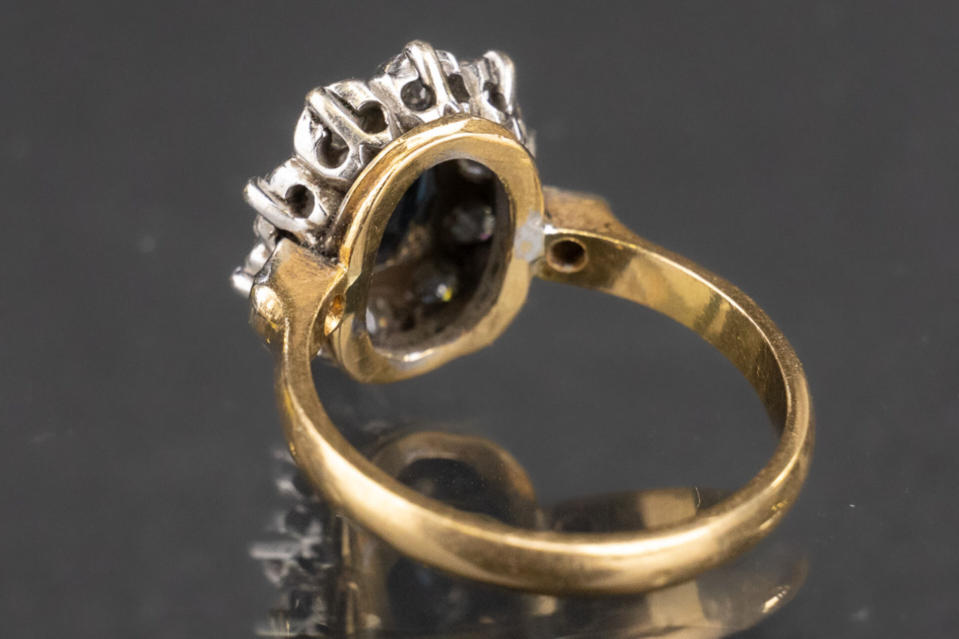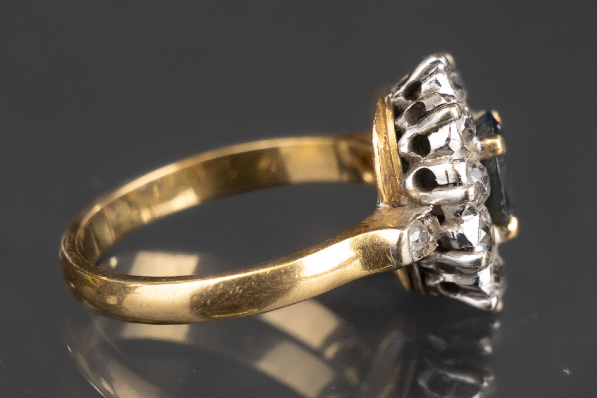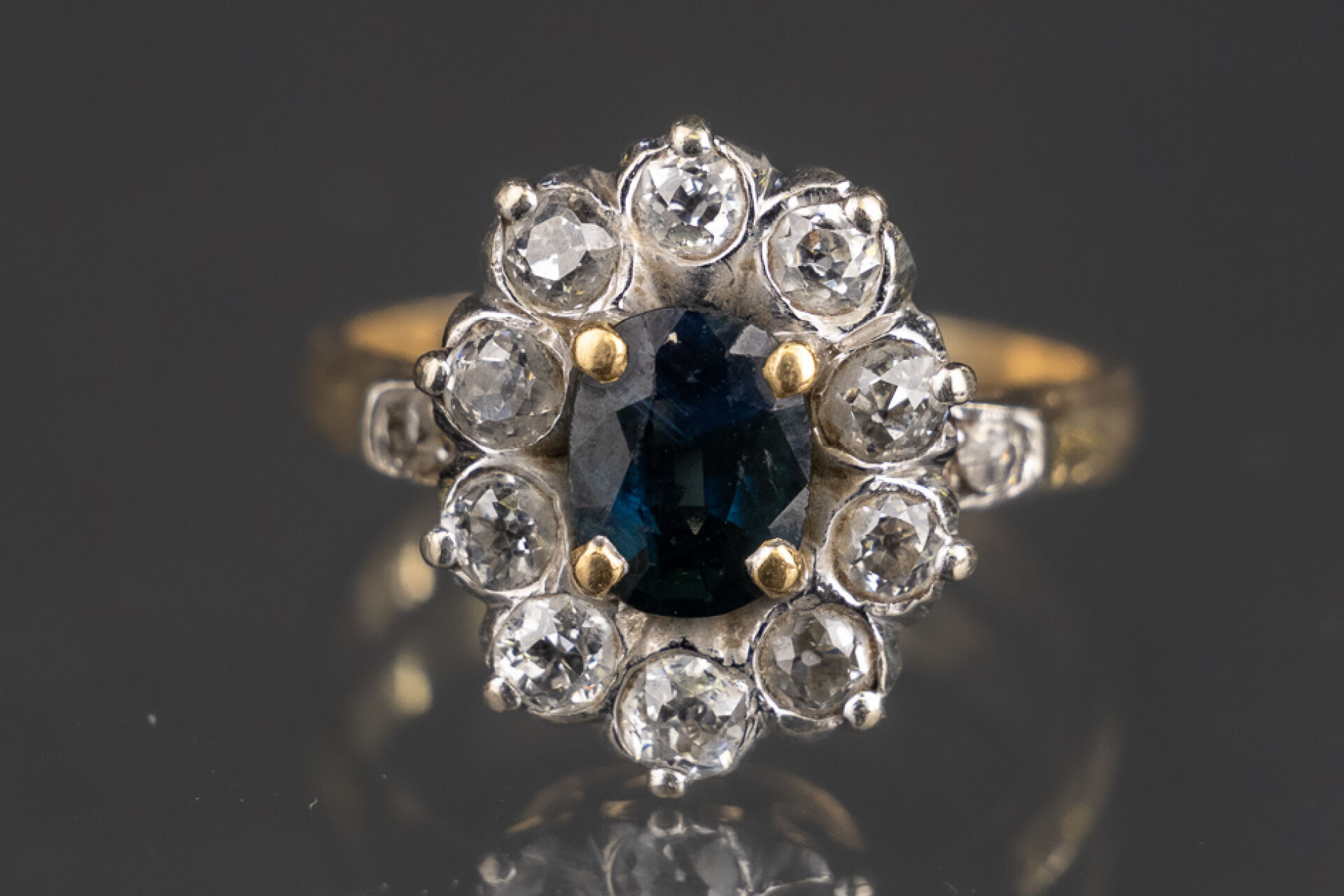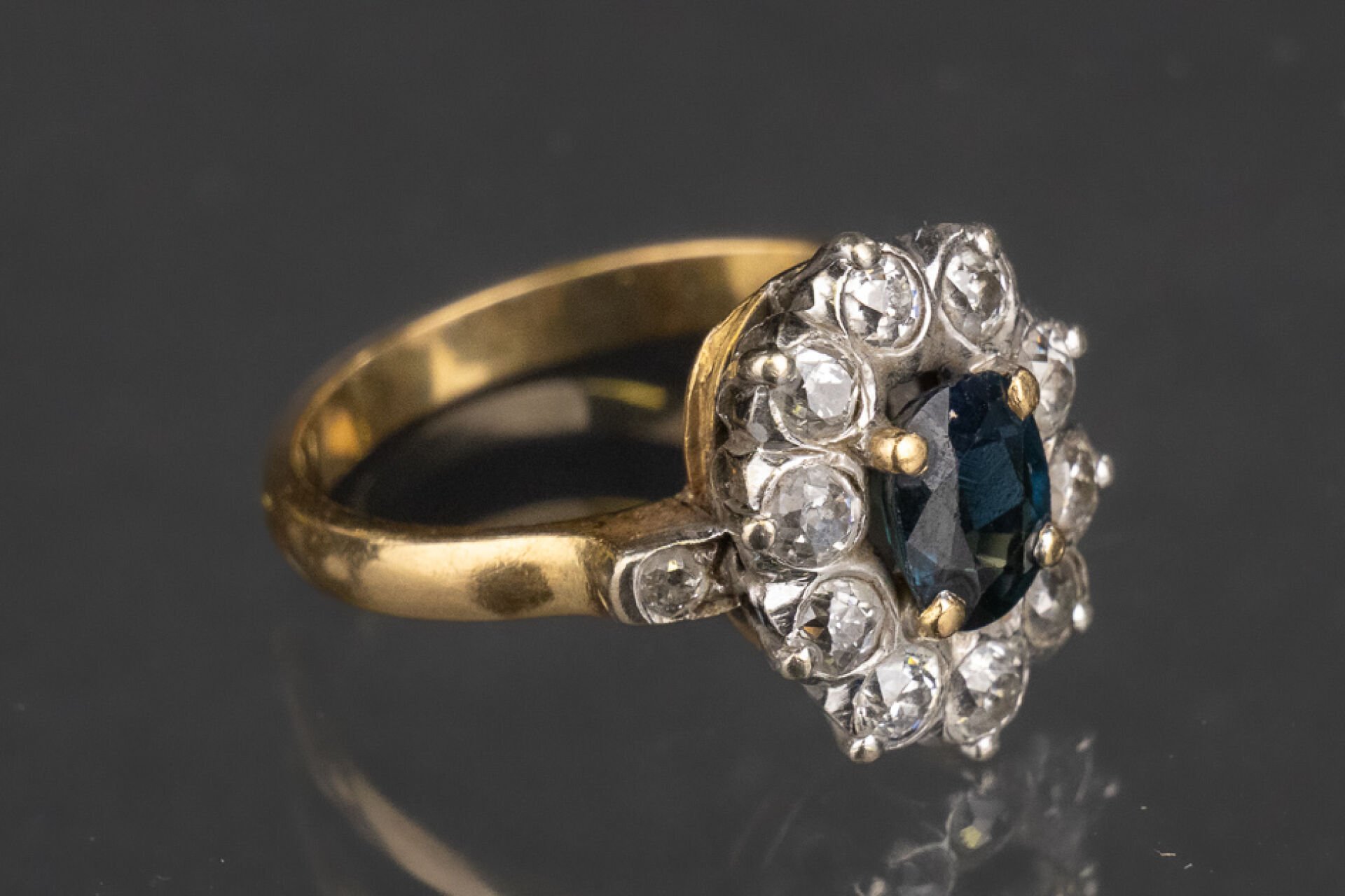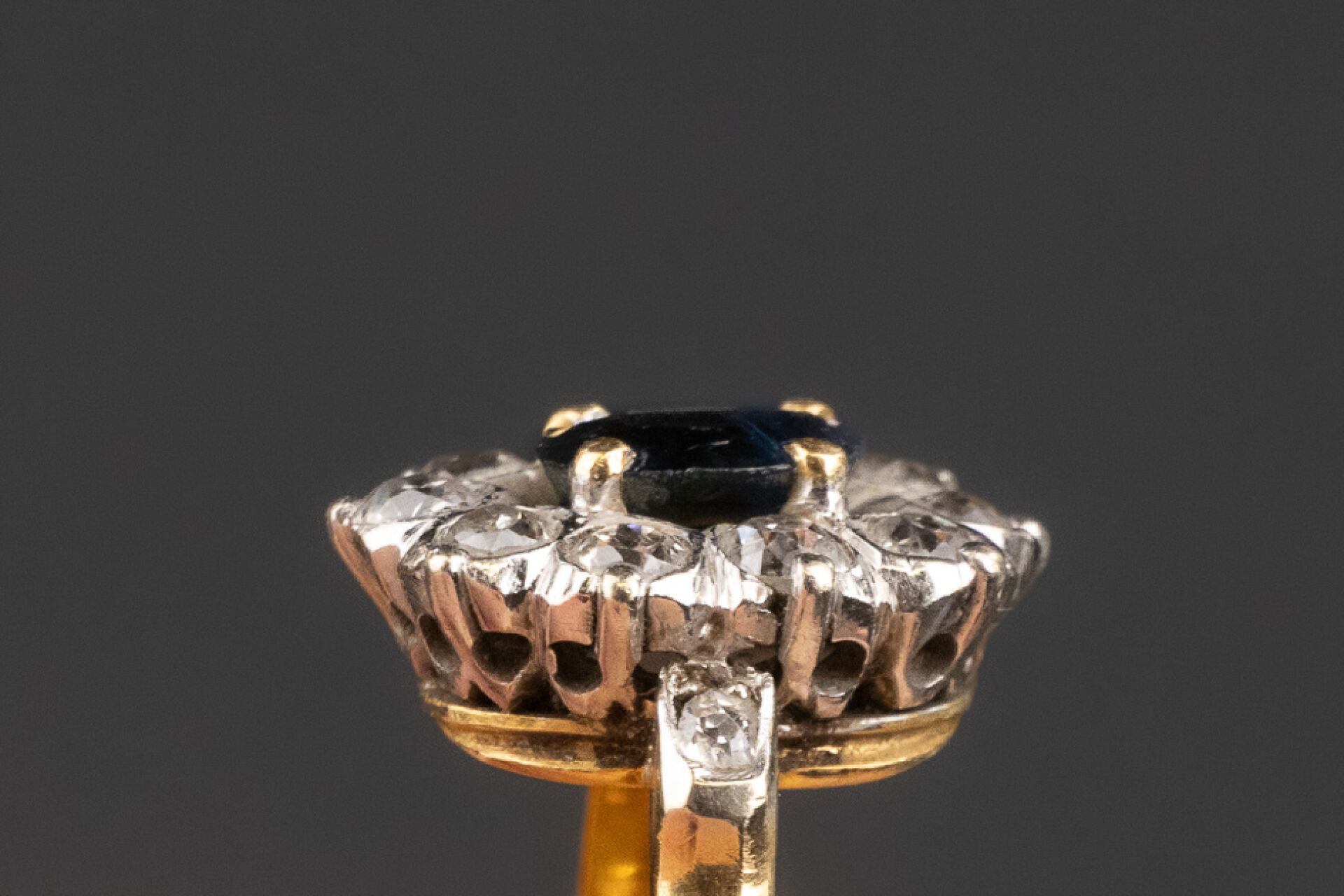 Bague marguerite en or jaune et or gris 18k (750 millièmes), chaton sertie d'un saphir dans un entourage de diamants. Poids brut : 6.44 gr - Tour de doigt 57.5 Conditions de vente spécifiques : Les gemmes, pierres et perles peuvent avoir fait l'objet de pratiques d'embellissement (huilage pour les émeraudes, traitement thermique pour les saphirs ou les rubis, blanchiment pour les perles). Ces améliorations sont considérées comme traditionnelles et sont admises par le commerce international des pierres gemmes et des perles. Par conséquent, ces traitements ne sont pas mentionnés au catalogue. De plus, les pierres n'ayant pas été desserties pour fait l'objet d'un examen approfondi en laboratoire, elles peuvent être synthétiques. Leur poids en carats vous est fourni à titre indicatif et précédé de la mention « environ ».
