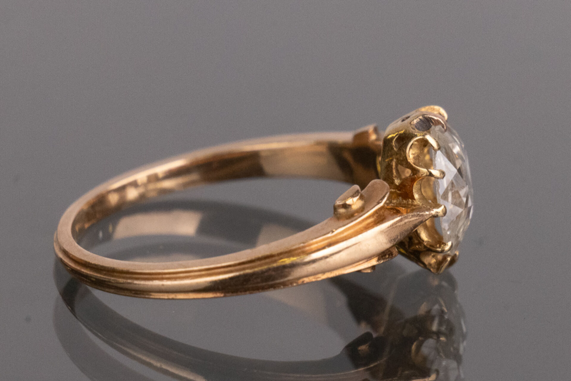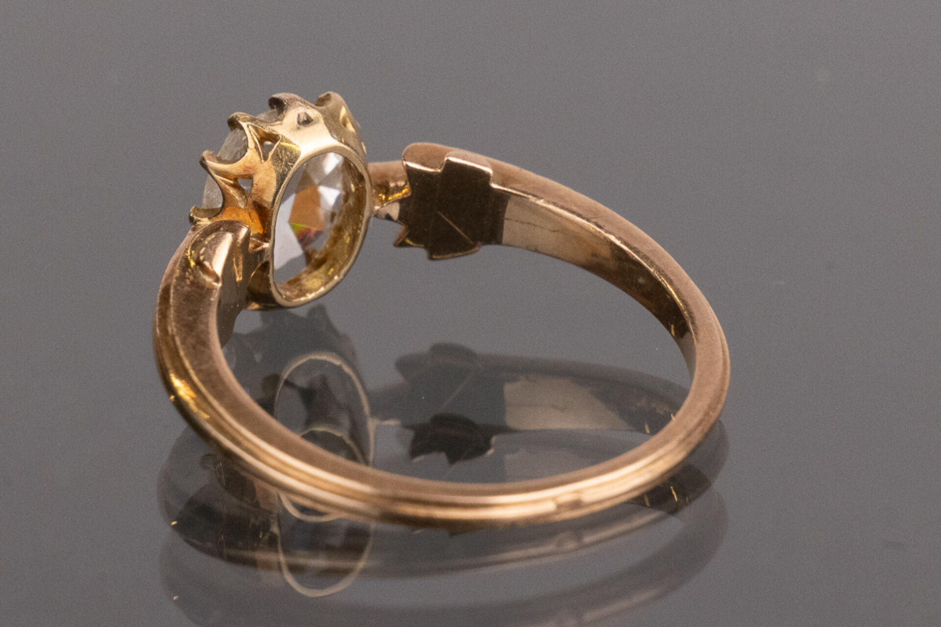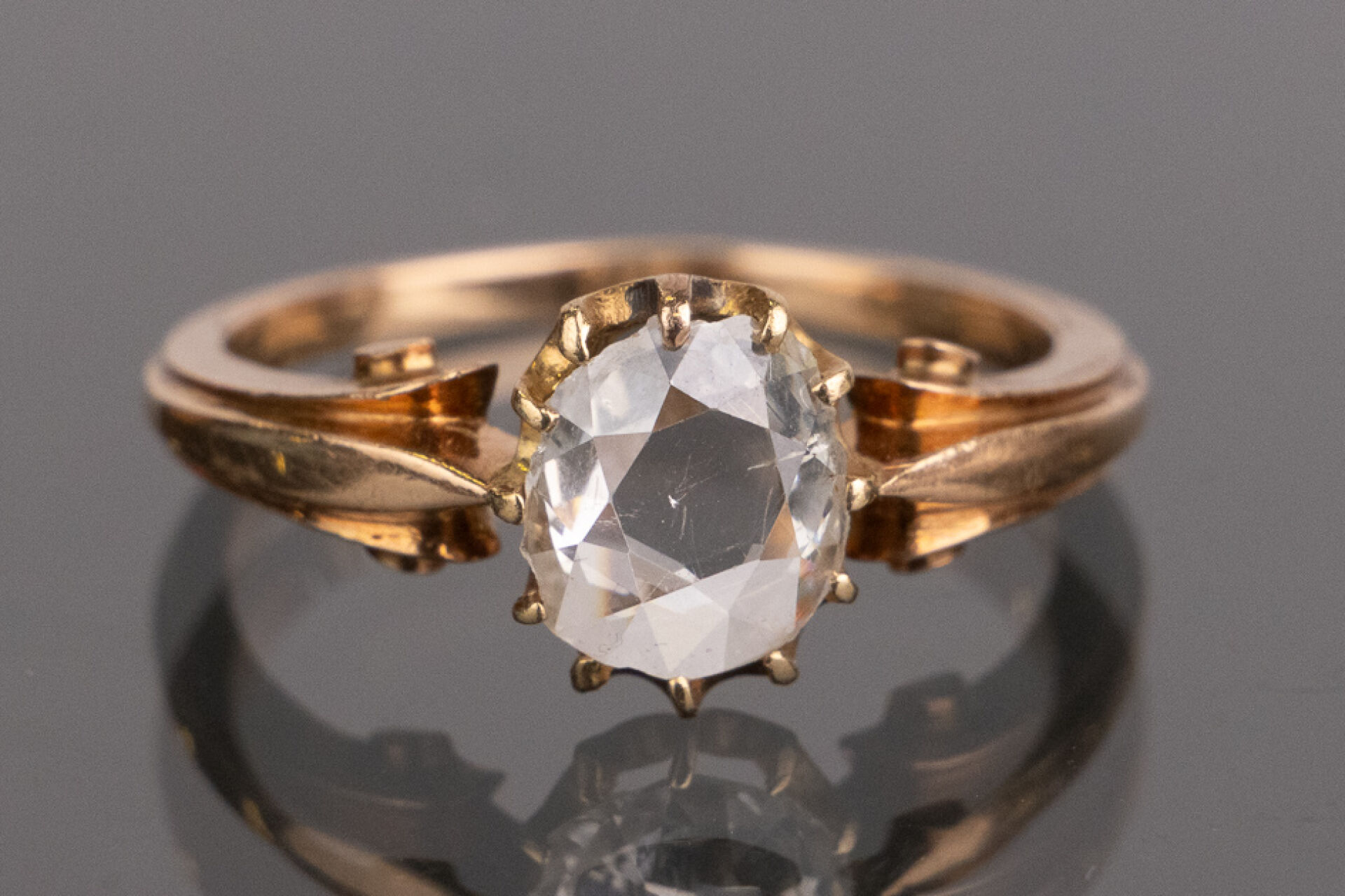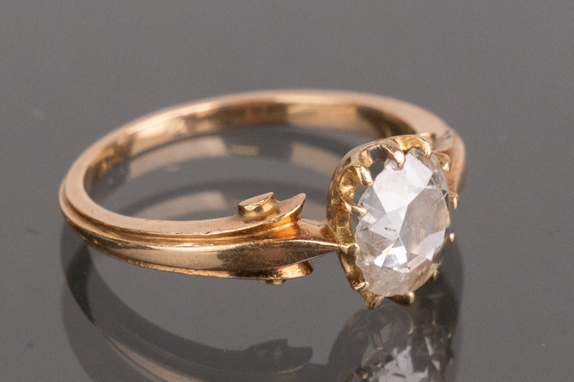 Bague en or rose 18k (750 millièmes) monture à décor d'enroulements, sertie d'un diamant taille ovale d'environ 0.50 carat. Poids brut : 2.80 gr - Tour de doigt 51 Conditions de vente spécifiques : Les gemmes, pierres et perles peuvent avoir fait l'objet de pratiques d'embellissement (huilage pour les émeraudes, traitement thermique pour les saphirs ou les rubis, blanchiment pour les perles). Ces améliorations sont considérées comme traditionnelles et sont admises par le commerce international des pierres gemmes et des perles. Par conséquent, ces traitements ne sont pas mentionnés au catalogue. De plus, les pierres n'ayant pas été desserties pour fait l'objet d'un examen approfondi en laboratoire, elles peuvent être synthétiques. Leur poids en carats vous est fourni à titre indicatif et précédé de la mention « environ ».