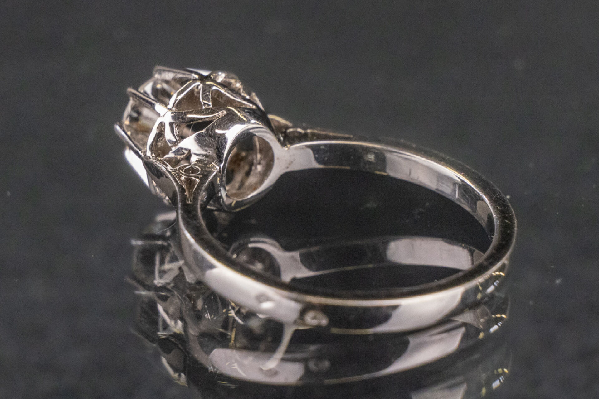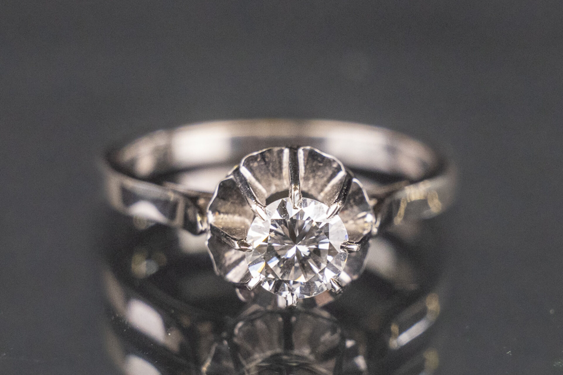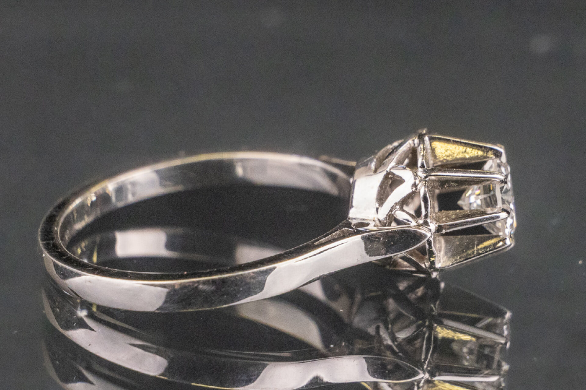 Bague solitaire en or blanc 18k (750 millièmes) sertie d'un diamant taille brillant d'environ 0.6 carat. Poids brut : 3.5 gr - Tour de doigt 52 Conditions de vente spécifiques : Les gemmes, pierres et perles peuvent avoir fait l'objet de pratiques d'embellissement (huilage pour les émeraudes, traitement thermique pour les saphirs ou les rubis, blanchiment pour les perles). Ces améliorations sont considérées comme traditionnelles et sont admises par le commerce international des pierres gemmes et des perles. Par conséquent, ces traitements ne sont pas mentionnés au catalogue. De plus, les pierres n'ayant pas été desserties pour fait l'objet d'un examen approfondi en laboratoire, elles peuvent être synthétiques. Leur poids en carats vous est fourni à titre indicatif et précédé de la mention « environ ».