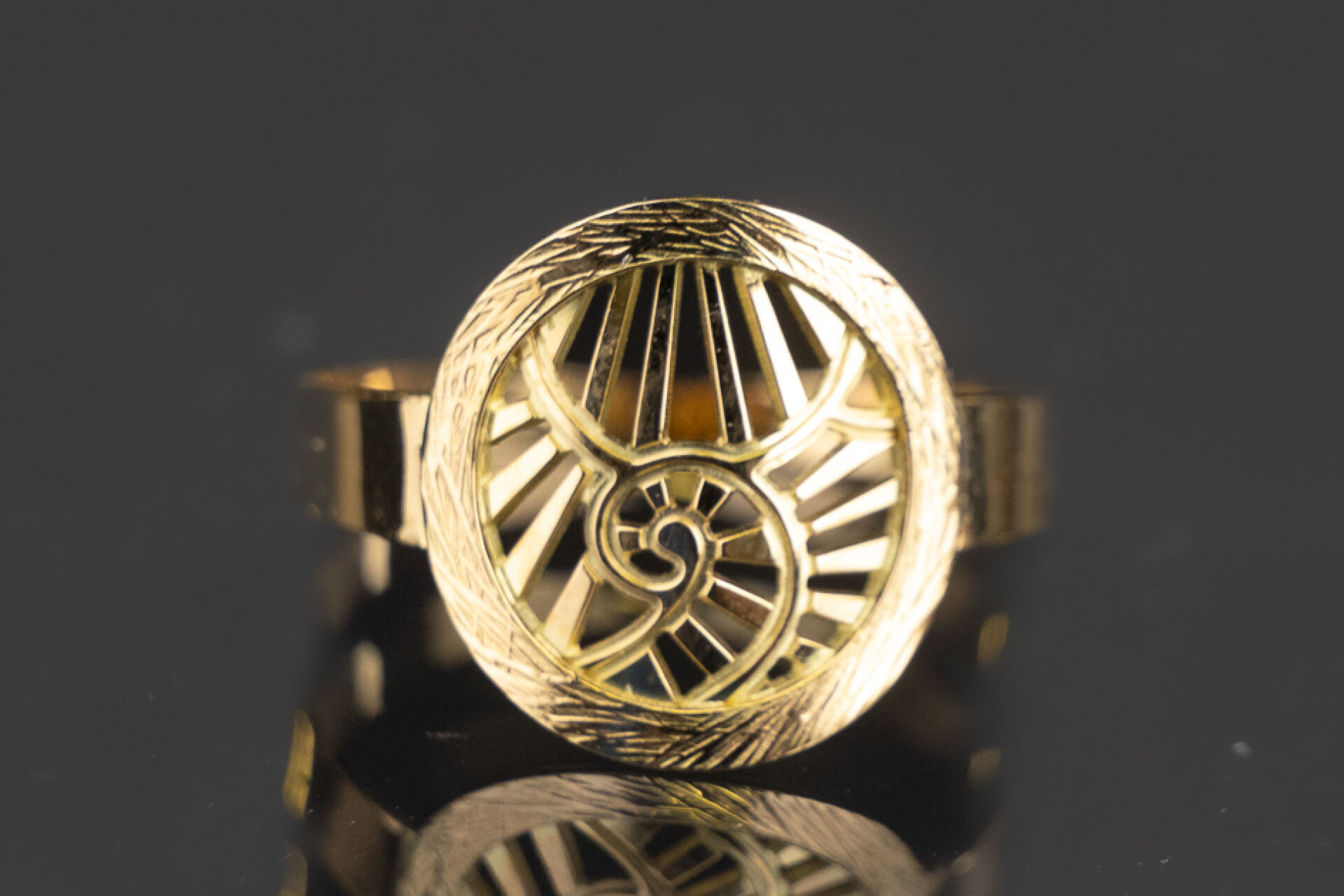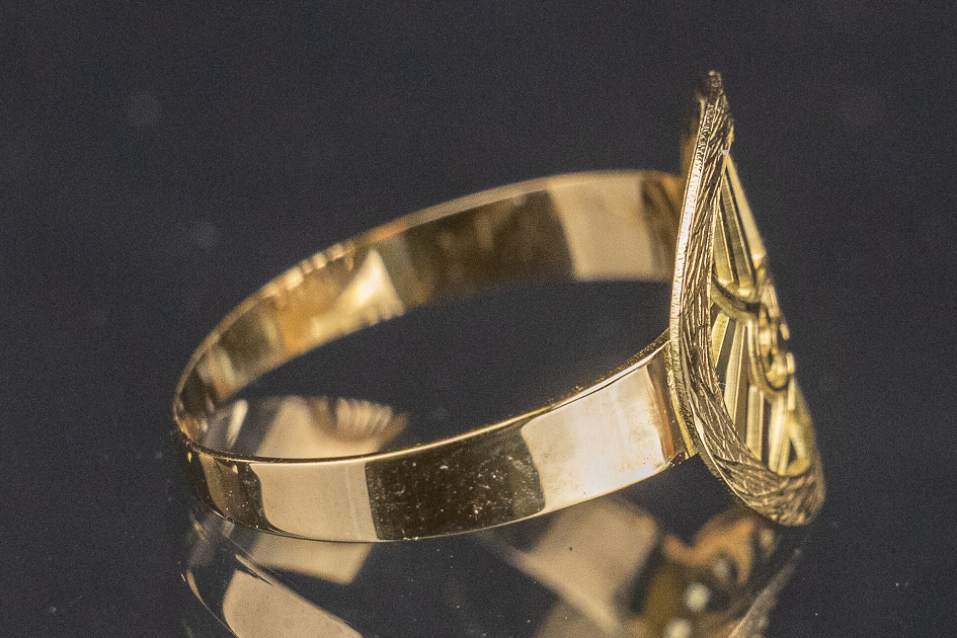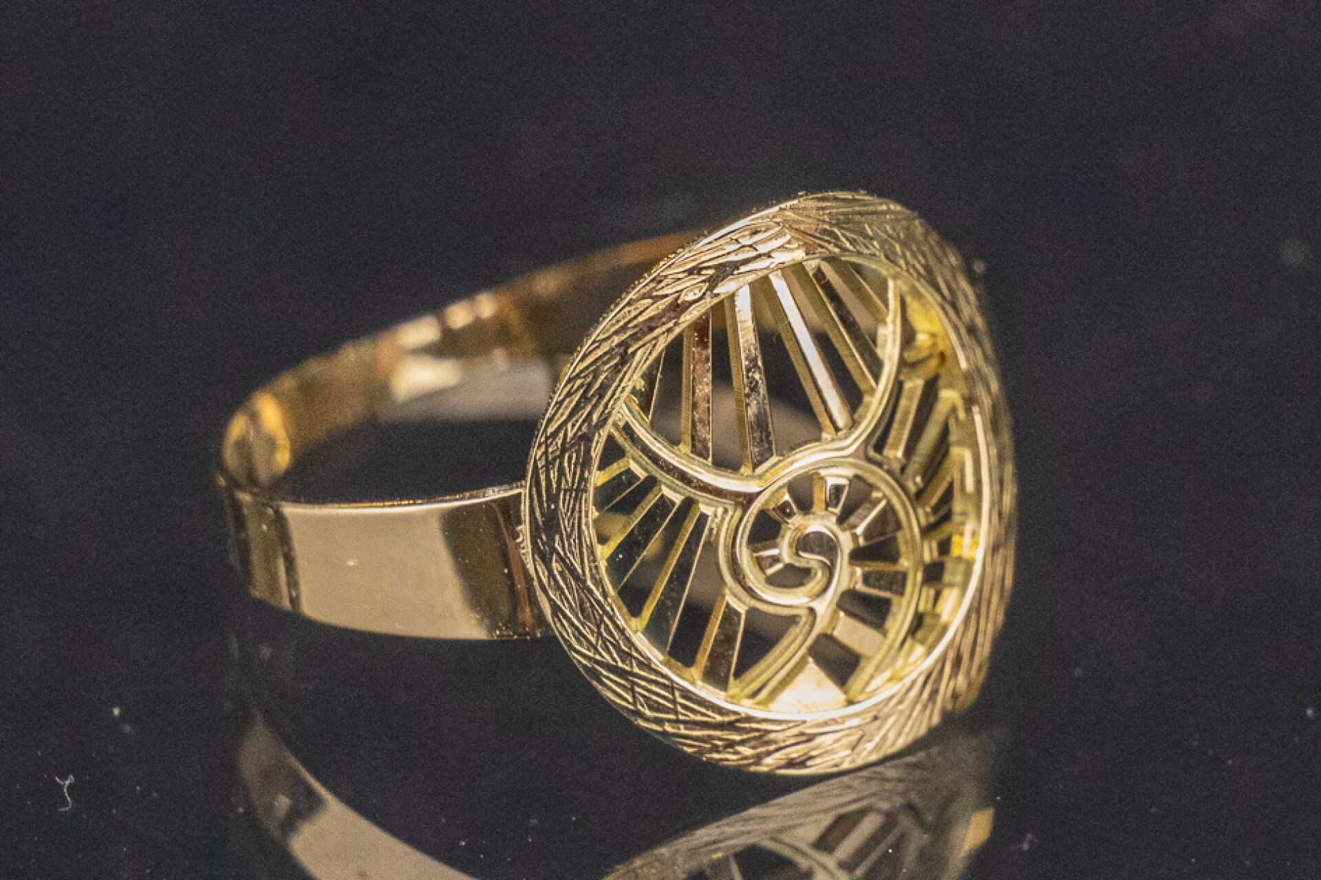 Bague en or jaune 18k (750 millièmes), chaton plat à décor filigrané. Poids : 1,28 gr - Tour de doigt 51