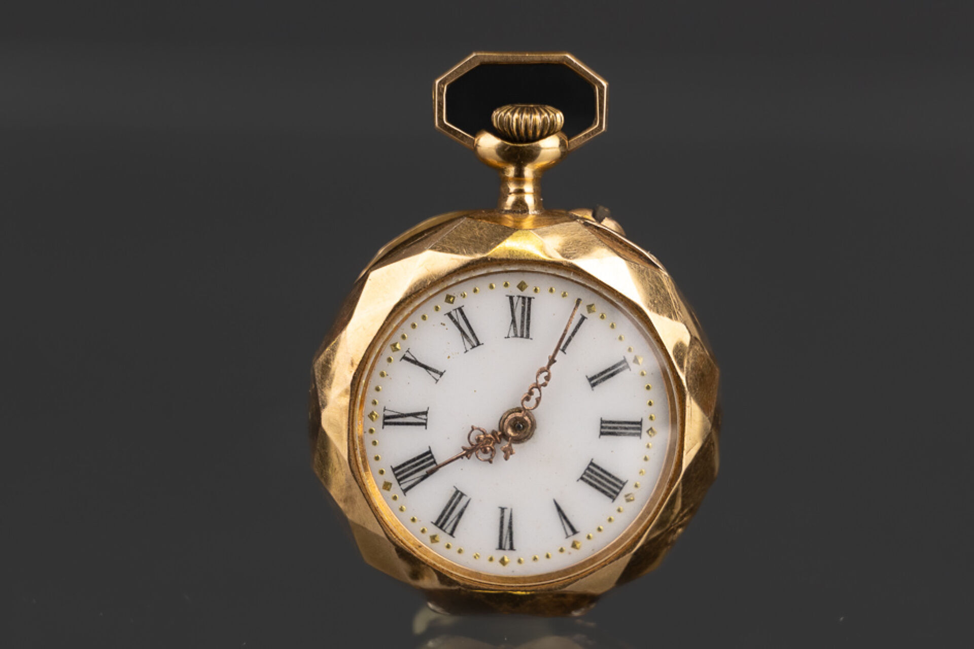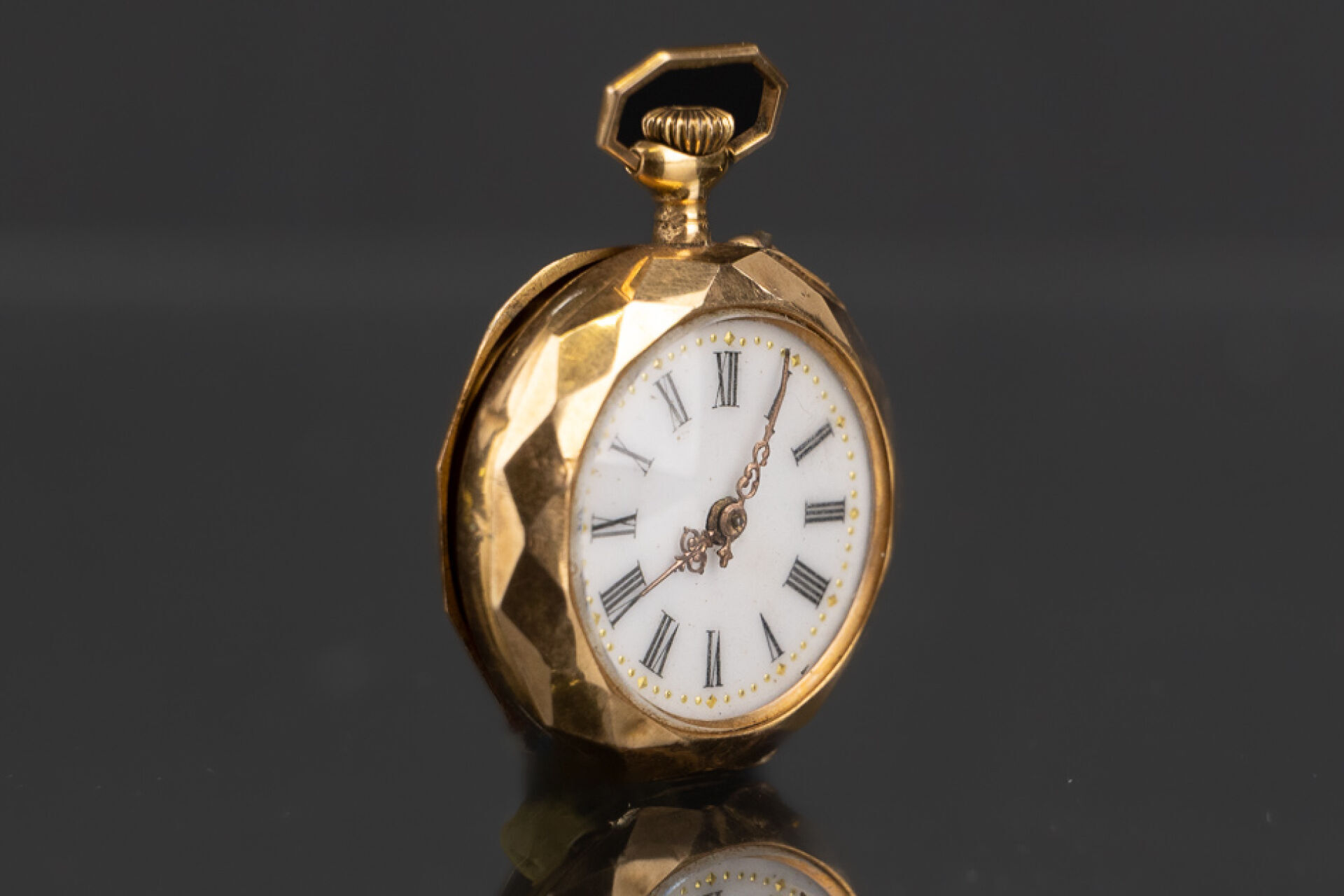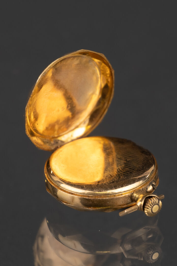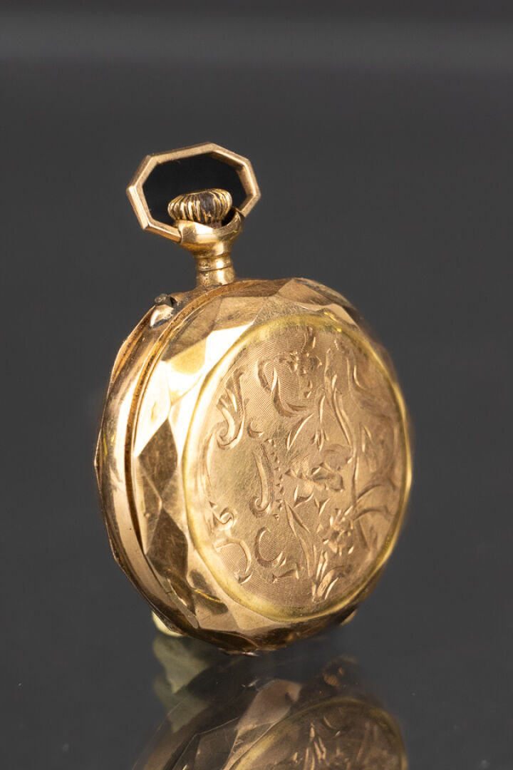 Montre à gousset en or jaune 18k (750 millièmes), décor facetté et ciselé au dos. Poids brut : 13.79 gr - Diam. : 2.5 cm Conditions de vente spécifiques : Veuillez noter que toutes les montres sont vendues en l'état. Aucune garantie n'est faite sur l'état de marche, une révision est donc conseillée. Certaines montres ont été ouvertes pour identifier le type et la qualité du mouvement, y compris les montres résistantes à l'eau, il est donc conseillé à l'acheteur de consulter un horloger pour revoir l'étanchéité de la montre.