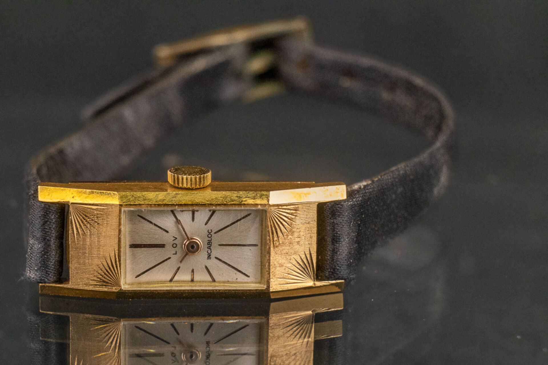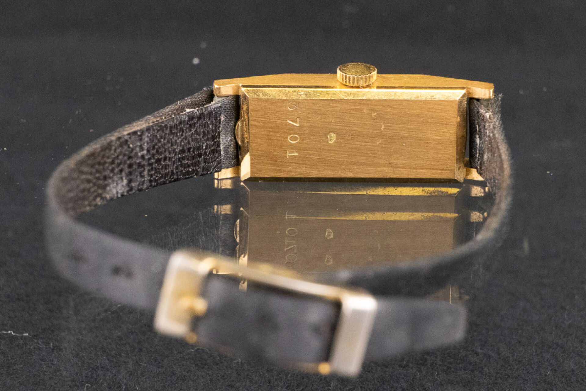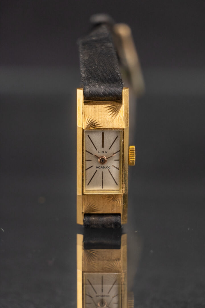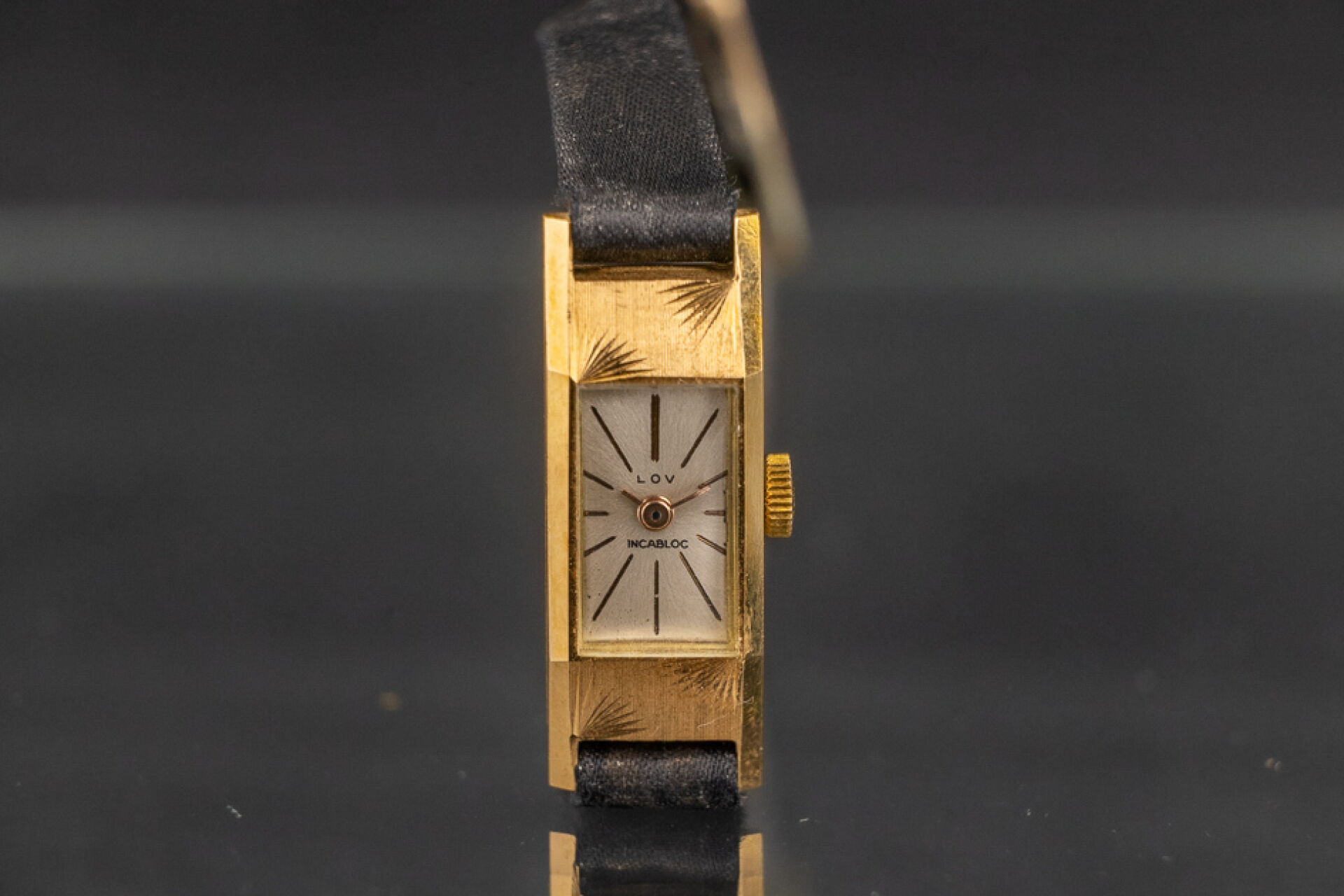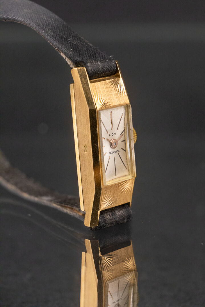 LOV INCABLOC - Montre bracelet de dame à cadran rectangulaire en or rose 18k (750 millièmes). Heures à index, bracelet cuir, ardillon métal. Mouvement mécanique. Numérotée 37010 Vers 1950 Poids brut : 9.8 gr - Dim. : 2.3 x 0.8 cm Conditions de vente spécifiques : Veuillez noter que toutes les montres sont vendues en l'état. Aucune garantie n'est faite sur l'état de marche, une révision est donc conseillée. Certaines montres ont été ouvertes pour identifier le type et la qualité du mouvement, y compris les montres résistantes à l'eau, il est donc conseillé à l'acheteur de consulter un horloger pour revoir l'étanchéité de la montre.