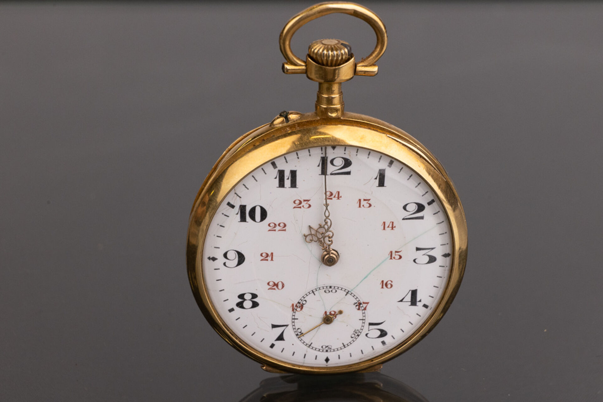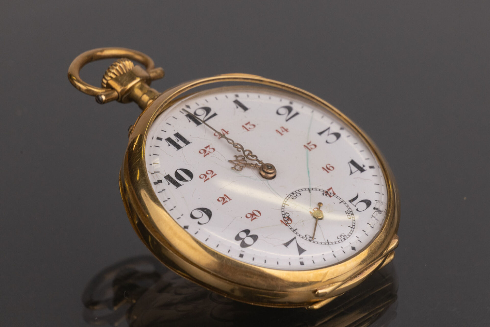 Montre à gousset à remontoir au pendant en or jaune 18k (750 millièmes). Poids brut : 70 gr - Diam. : 4,5 cm Accidents Montre de fonctionnant pas lors de l'expertise Conditions de vente spécifiques : Veuillez noter que toutes les montres sont vendues en l'état. Aucune garantie n'est faite sur l'état de marche, une révision est donc conseillée. Certaines montres ont été ouvertes pour identifier le type et la qualité du mouvement, y compris les montres résistantes à l'eau, il est donc conseillé à l'acheteur de consulter un horloger pour revoir l'étanchéité de la montre.