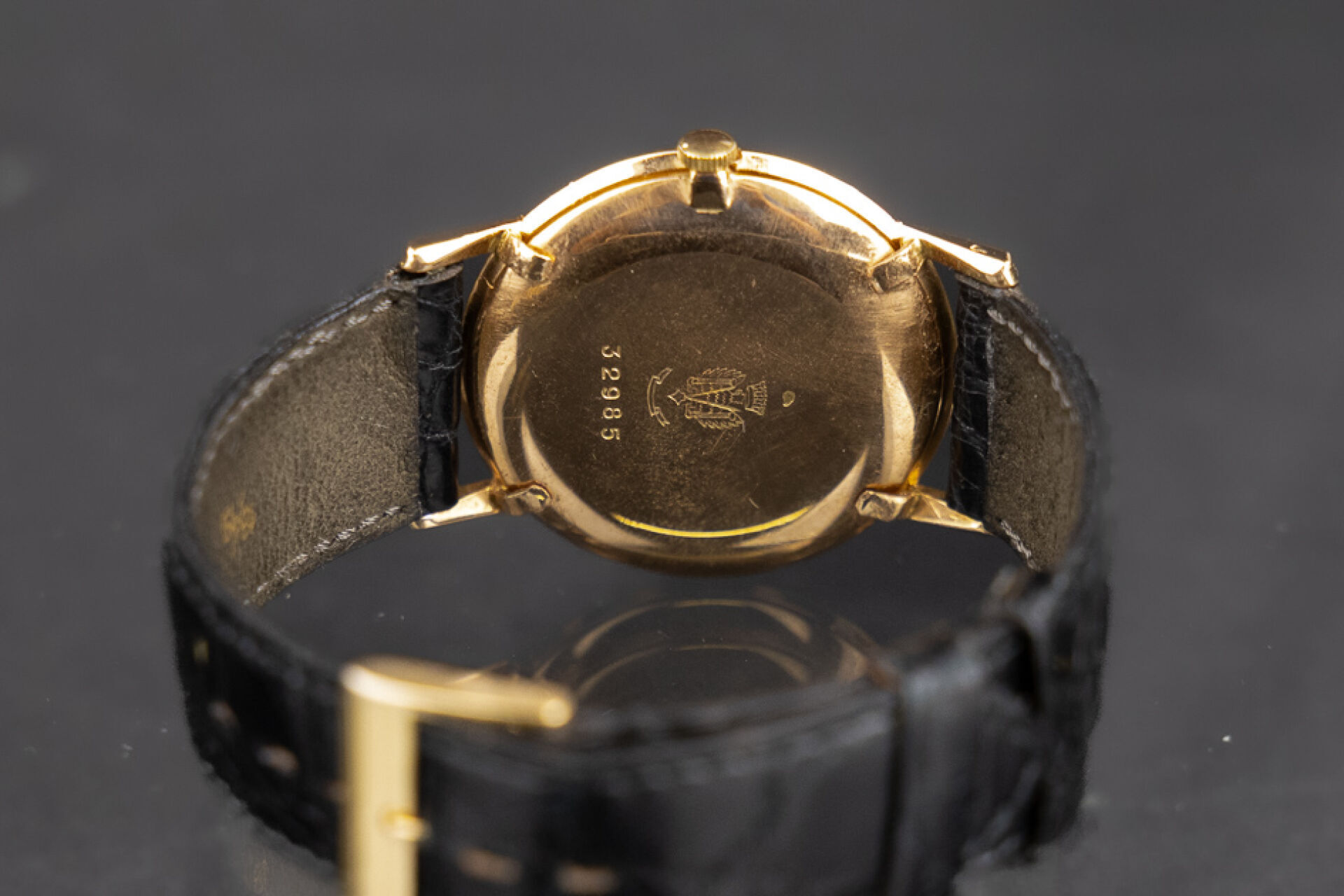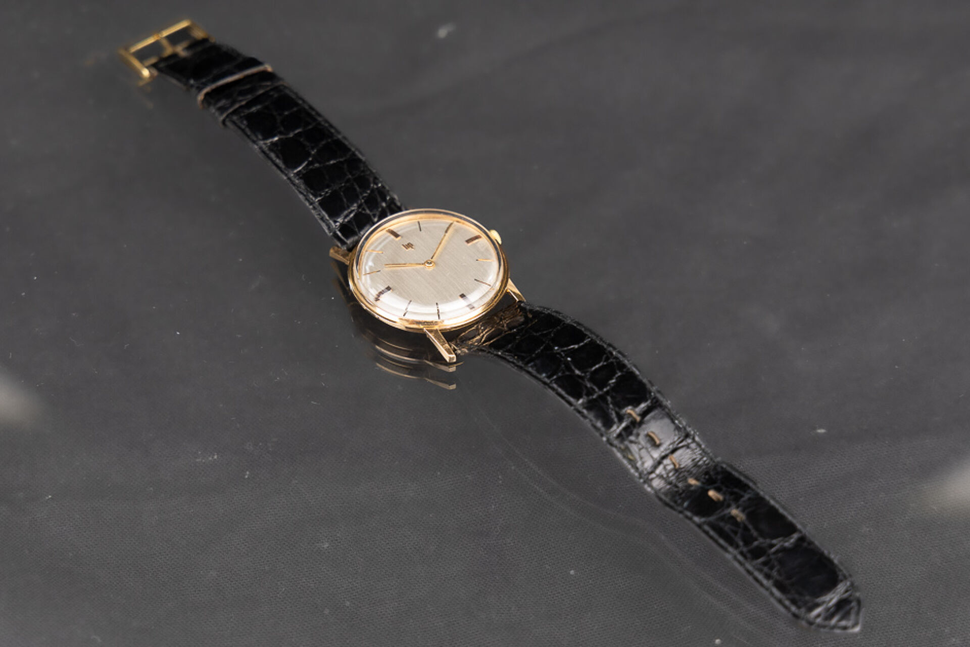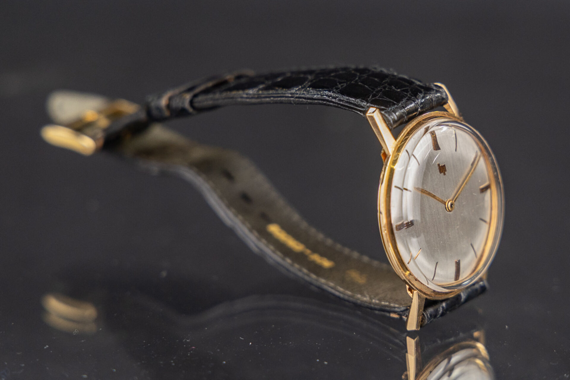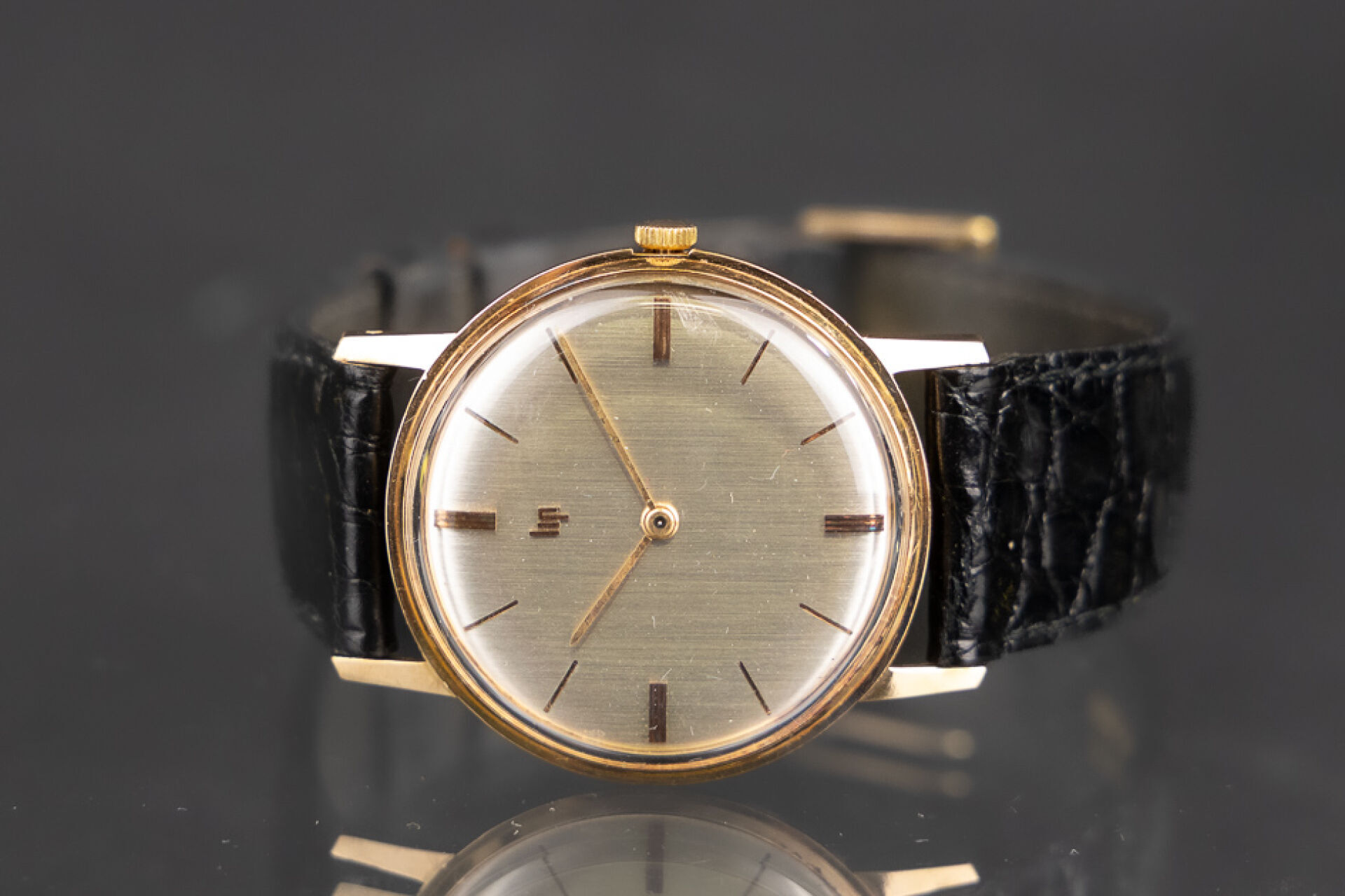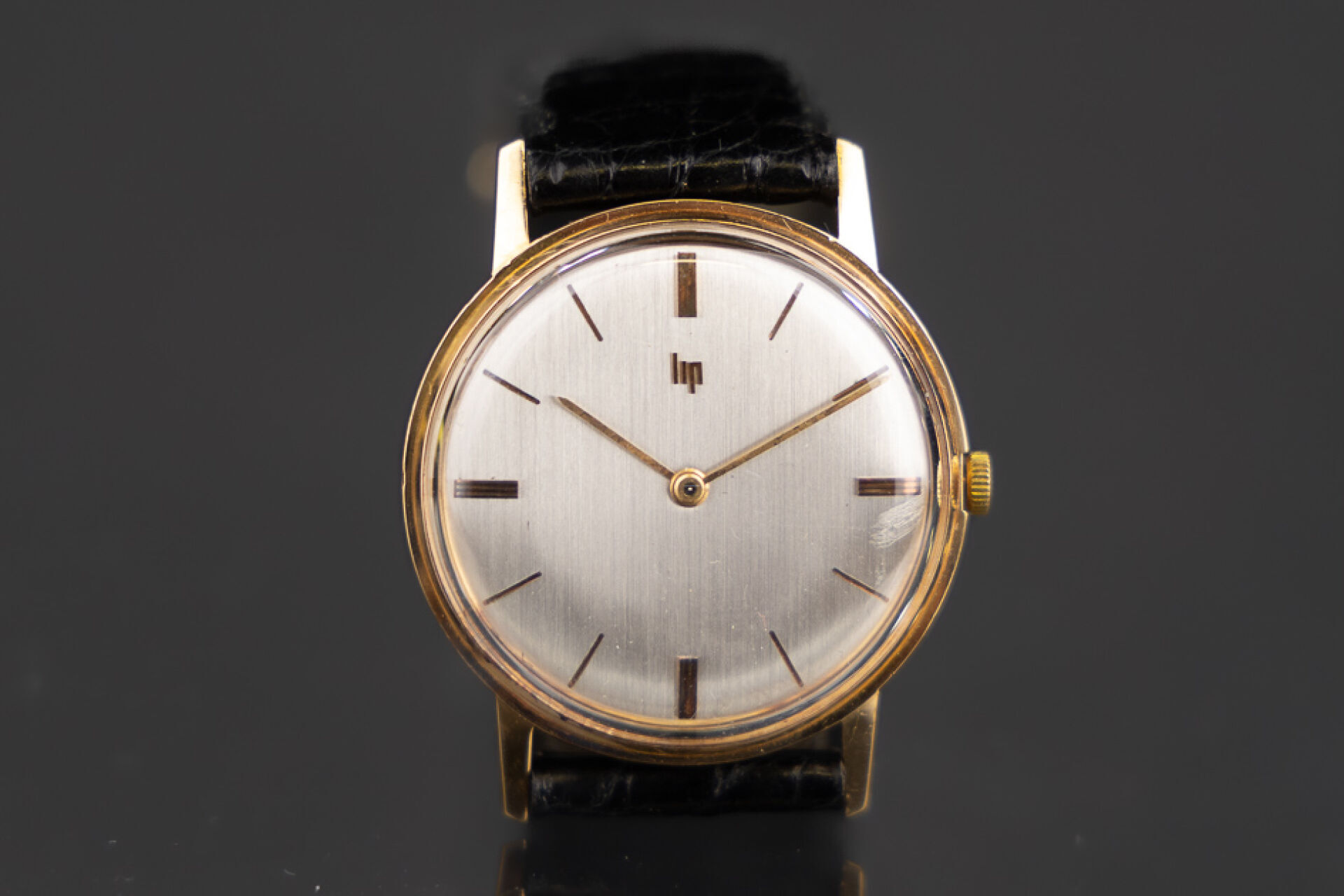 LIP - Montre bracelet homme à cadran circulaire en or jaune 18k (750 millièmes) le fond nacré à index bâton. Mouvement mécanique à remontage manuel. Numérotée 32985. Bracelet cuir et ardillon en métal doré (rapporté). Ecrin Poids total : 29.52 gr Montre déclarée révisée en 2015. Conditions de vente spécifiques : Veuillez noter que toutes les montres sont vendues en l'état. Aucune garantie n'est faite sur l'état de marche, une révision est donc conseillée. Certaines montres ont été ouvertes pour identifier le type et la qualité du mouvement, y compris les montres résistantes à l'eau, il est donc conseillé à l'acheteur de consulter un horloger pour revoir l'étanchéité de la montre.
