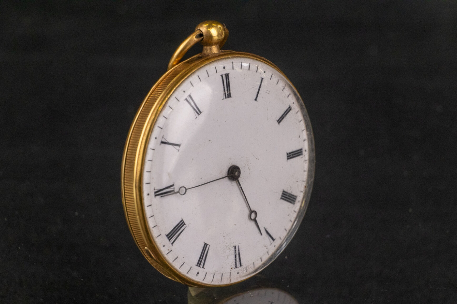 Montre de gousset en or jaune 18k (750 millièmes) le cadran émaillé blanc aux heures à chiffres romains, la partie arrière à décor de fleurettes sur fond guilloché. Poids brut : 48.78 gr Conditions de vente spécifiques : Veuillez noter que toutes les montres sont vendues en l'état. Aucune garantie n'est faite sur l'état de marche, une révision est donc conseillée. Certaines montres ont été ouvertes pour identifier le type et la qualité du mouvement, y compris les montres résistantes à l'eau, il est donc conseillé à l'acheteur de consulter un horloger pour revoir l'étanchéité de la montre.