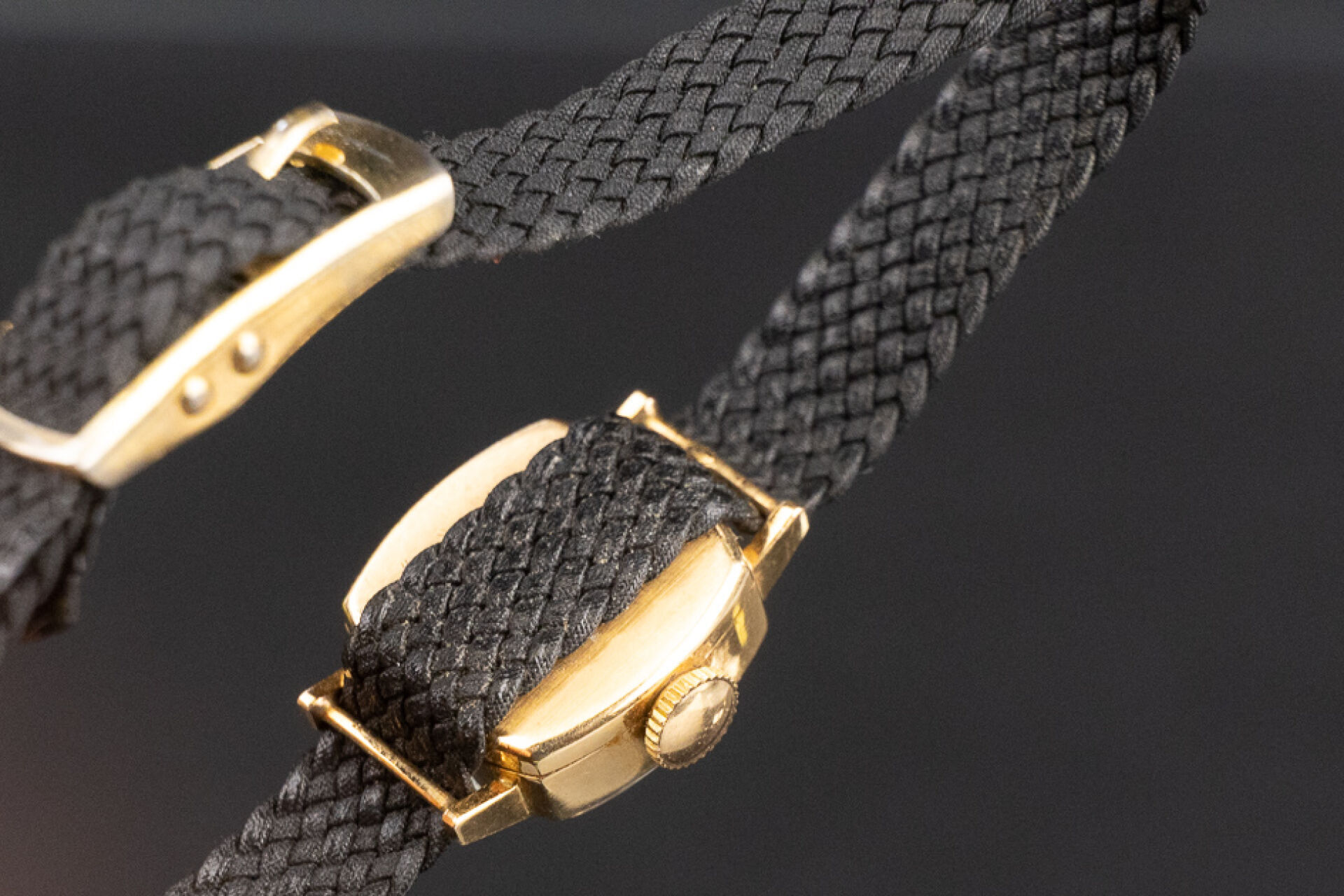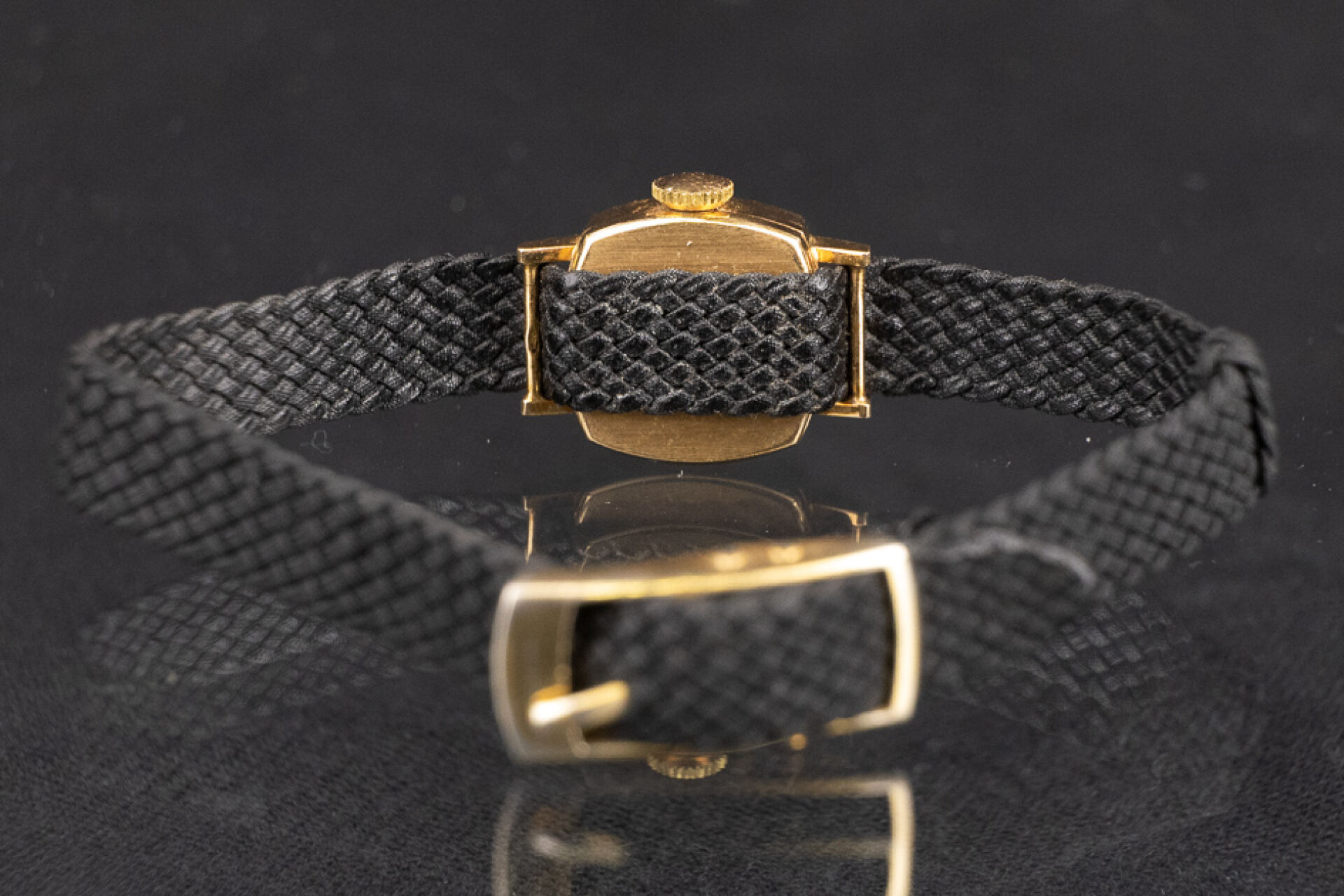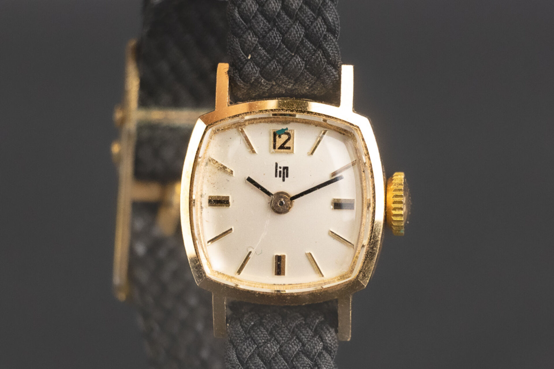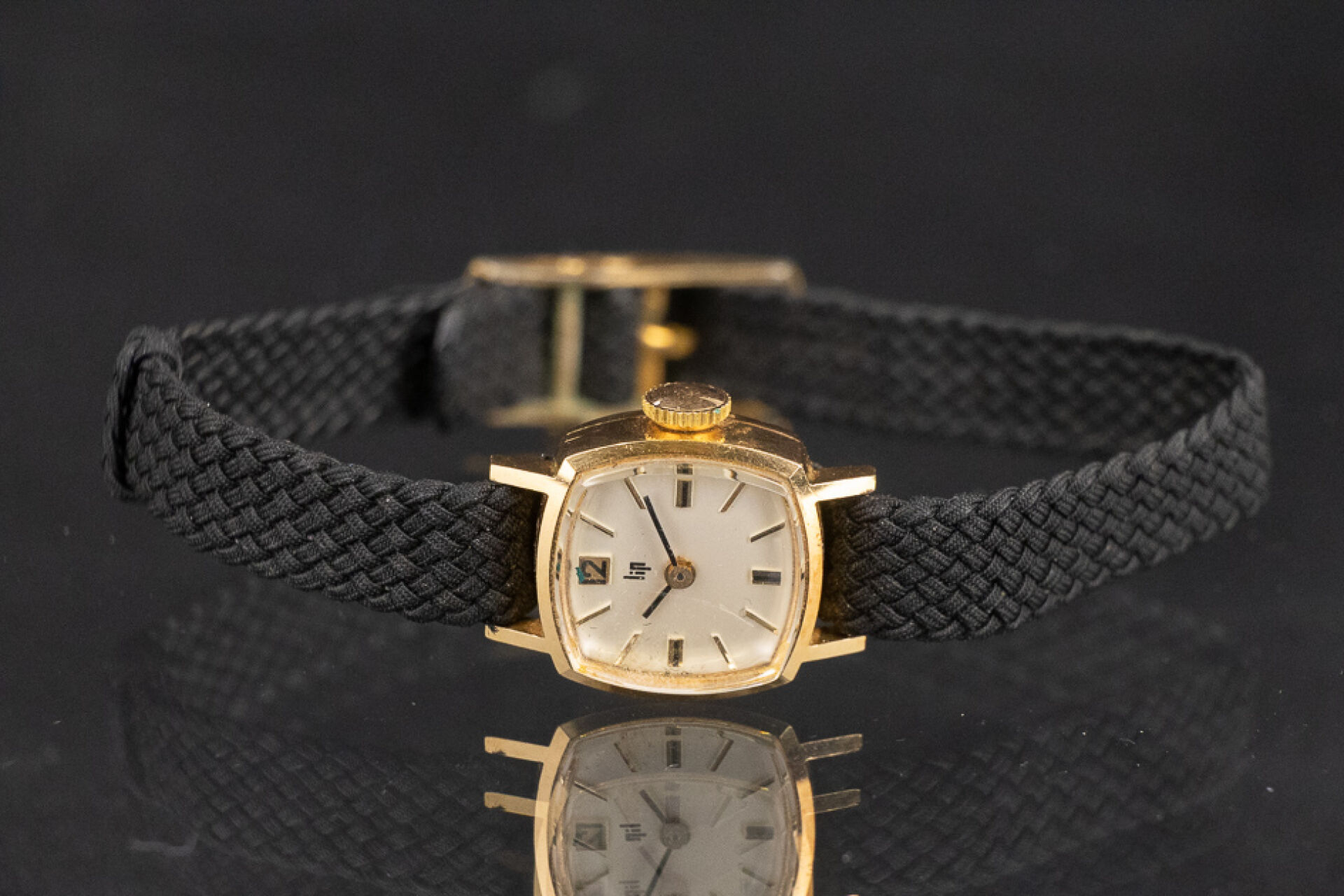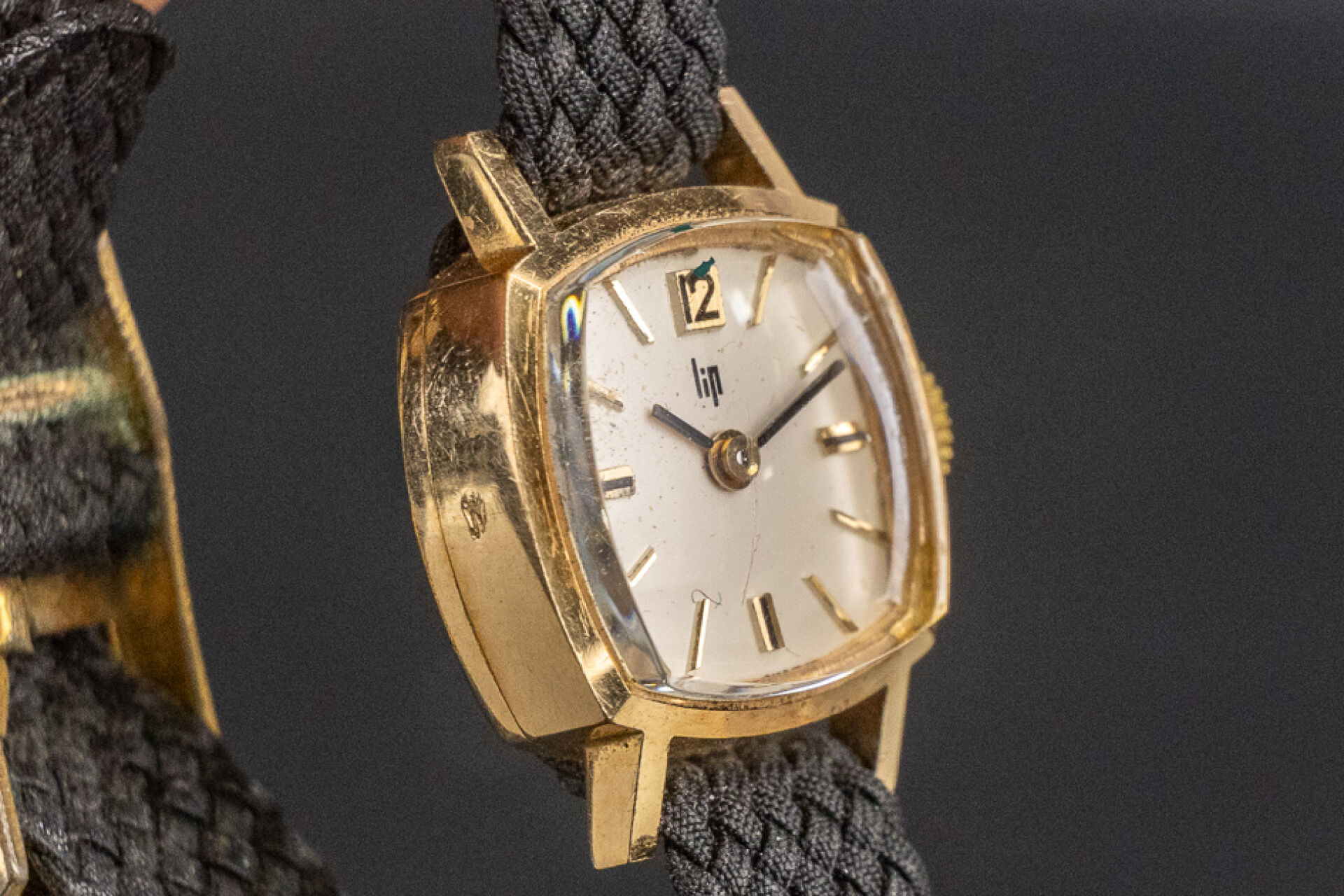 LIP - Petite montre bracelet de dame, à boitier en or jaune 18k (750 millièmes), les heures en index bâtons. Numérotée au revers 39592. Bracelet en tissu noir, ardillons en métal doré. Poids brut : 8.43 gr Conditions de vente spécifiques : Veuillez noter que toutes les montres sont vendues en l'état. Aucune garantie n'est faite sur l'état de marche, une révision est donc conseillée. Certaines montres ont été ouvertes pour identifier le type et la qualité du mouvement, y compris les montres résistantes à l'eau, il est donc conseillé à l'acheteur de consulter un horloger pour revoir l'étanchéité de la montre.
