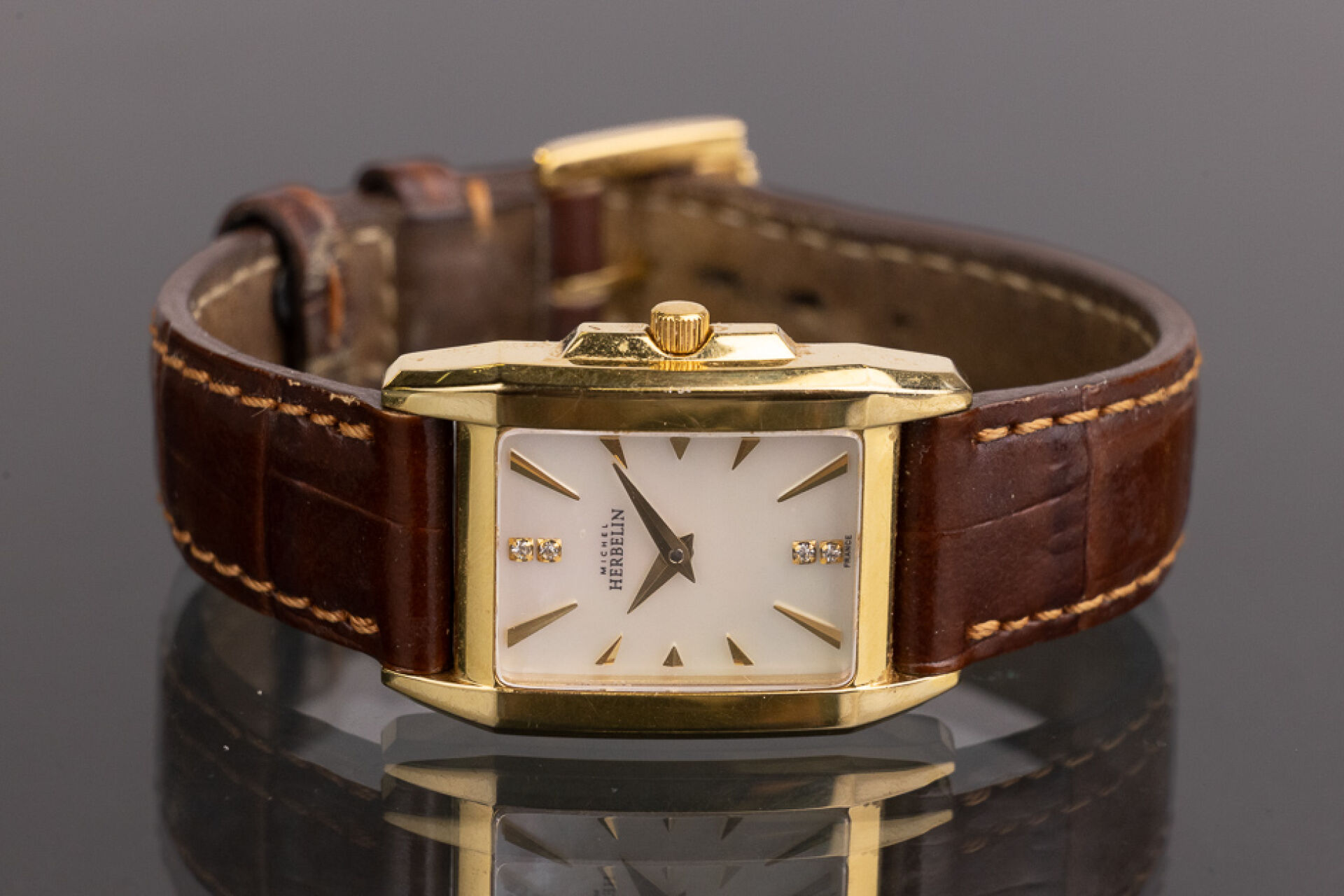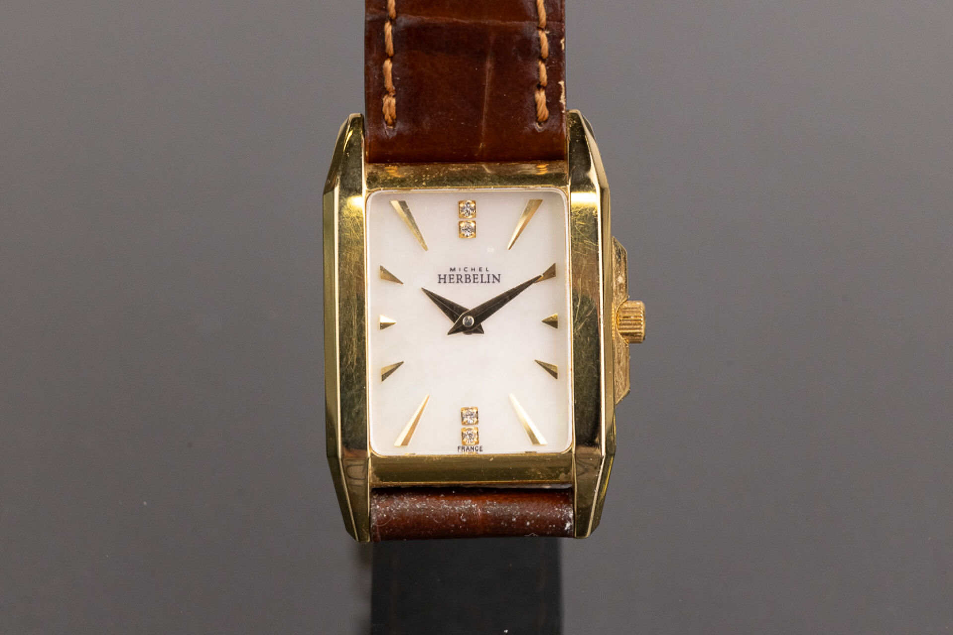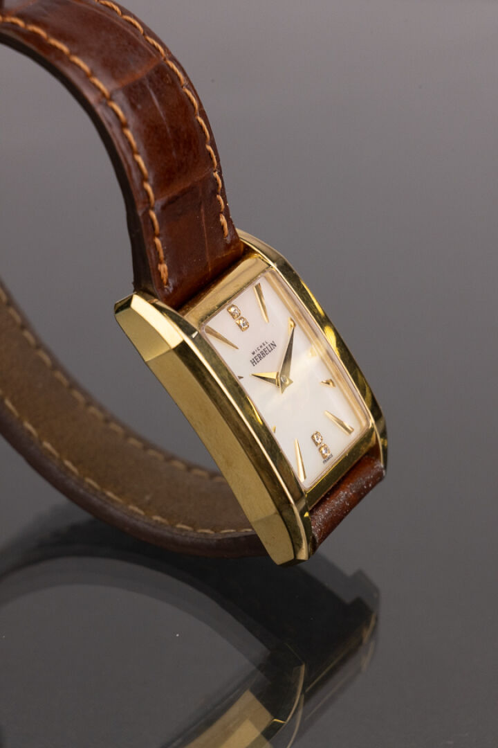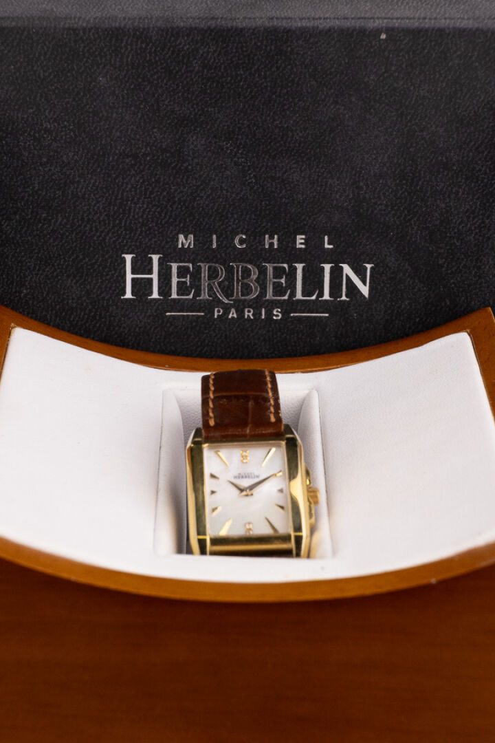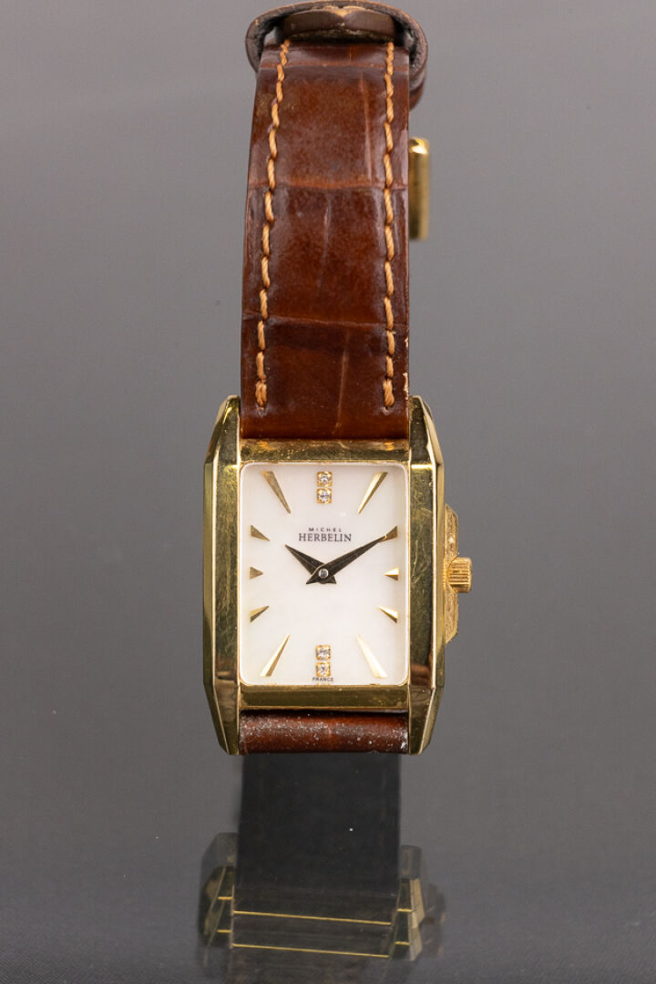 HERBELIN - Montre de dame, cadran rectangulaire en métal doré, fond du cadran nacré, index bâtons et strass, bracelet cuir marron imitation crocodile, mouvement à quartz. Dim du cadran : 2.2 x 1.9 cm Montre ne fonctionnant pas lors de l'expertise. Conditions de vente spécifiques : Veuillez noter que toutes les montres sont vendues en l'état. Aucune garantie n'est faite sur l'état de marche, une révision est donc conseillée. Certaines montres ont été ouvertes pour identifier le type et la qualité du mouvement, y compris les montres résistantes à l'eau, il est donc conseillé à l'acheteur de consulter un horloger pour revoir l'étanchéité de la montre.