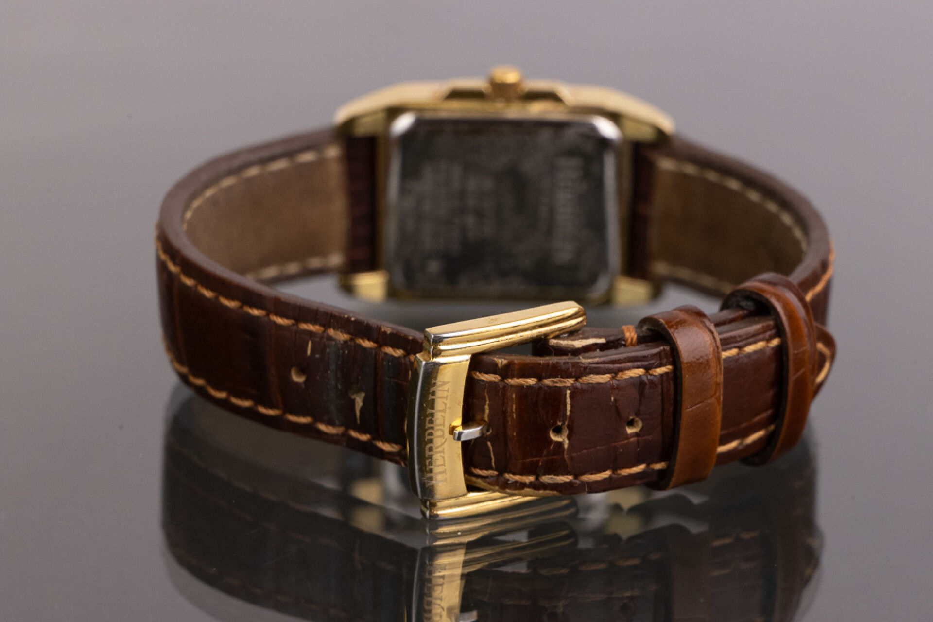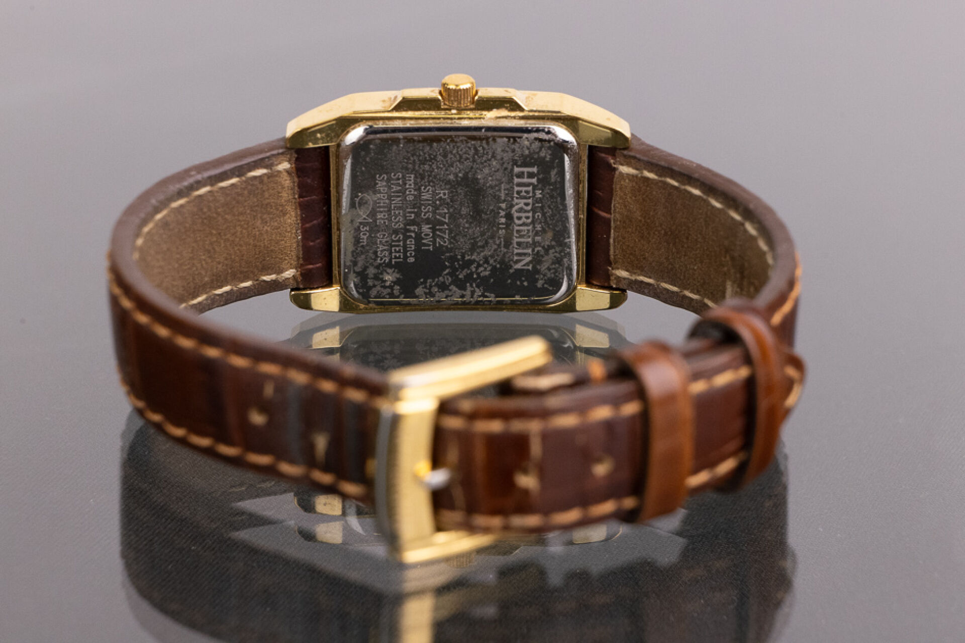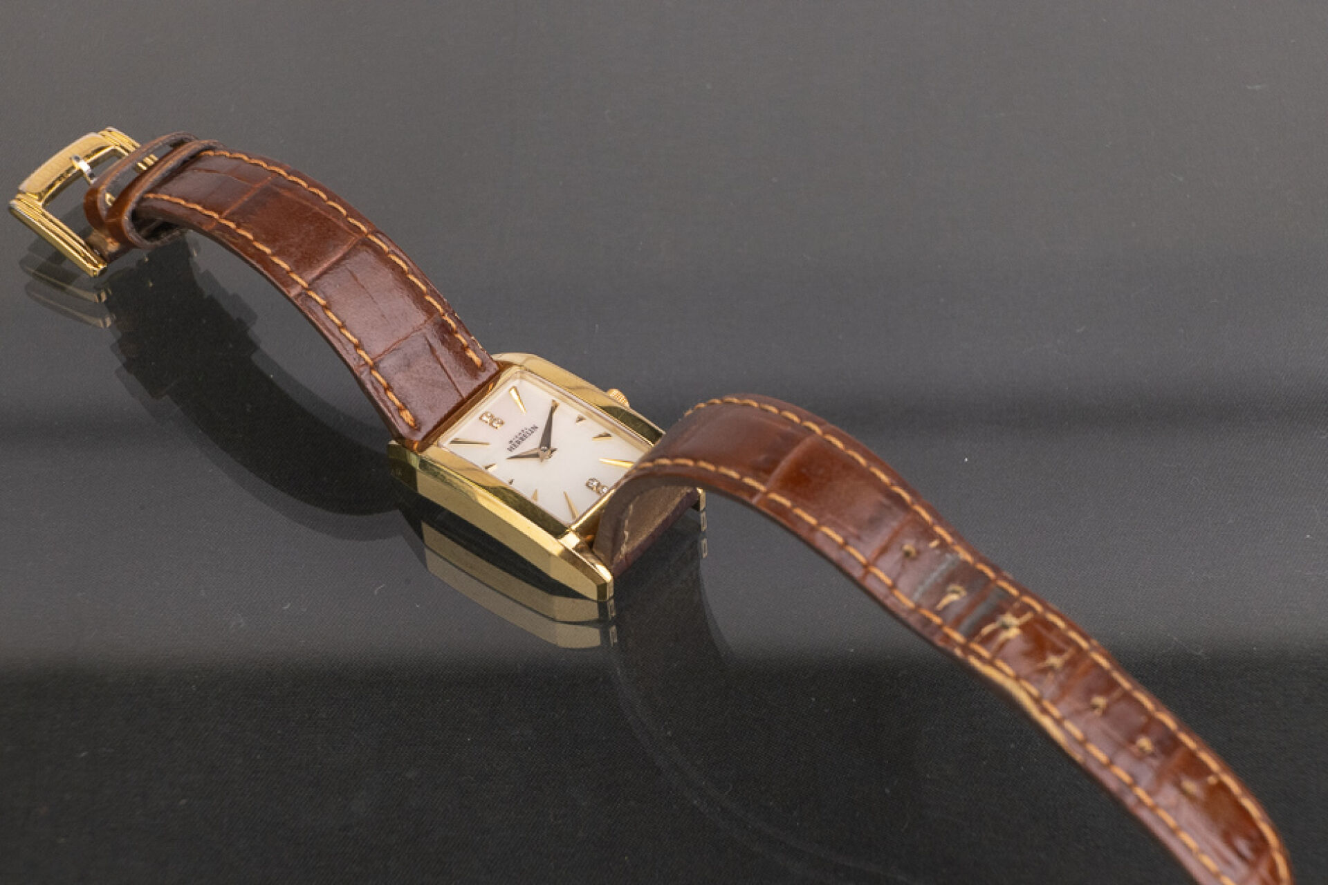 HERBELIN - Montre de dame, cadran rectangulaire en métal doré, fond du cadran nacré, index bâtons et strass, bracelet cuir marron imitation crocodile, mouvement à quartz. Dim du cadran : 2.2 x 1.9 cm Montre ne fonctionnant pas lors de l'expertise. Conditions de vente spécifiques : Veuillez noter que toutes les montres sont vendues en l'état. Aucune garantie n'est faite sur l'état de marche, une révision est donc conseillée. Certaines montres ont été ouvertes pour identifier le type et la qualité du mouvement, y compris les montres résistantes à l'eau, il est donc conseillé à l'acheteur de consulter un horloger pour revoir l'étanchéité de la montre.