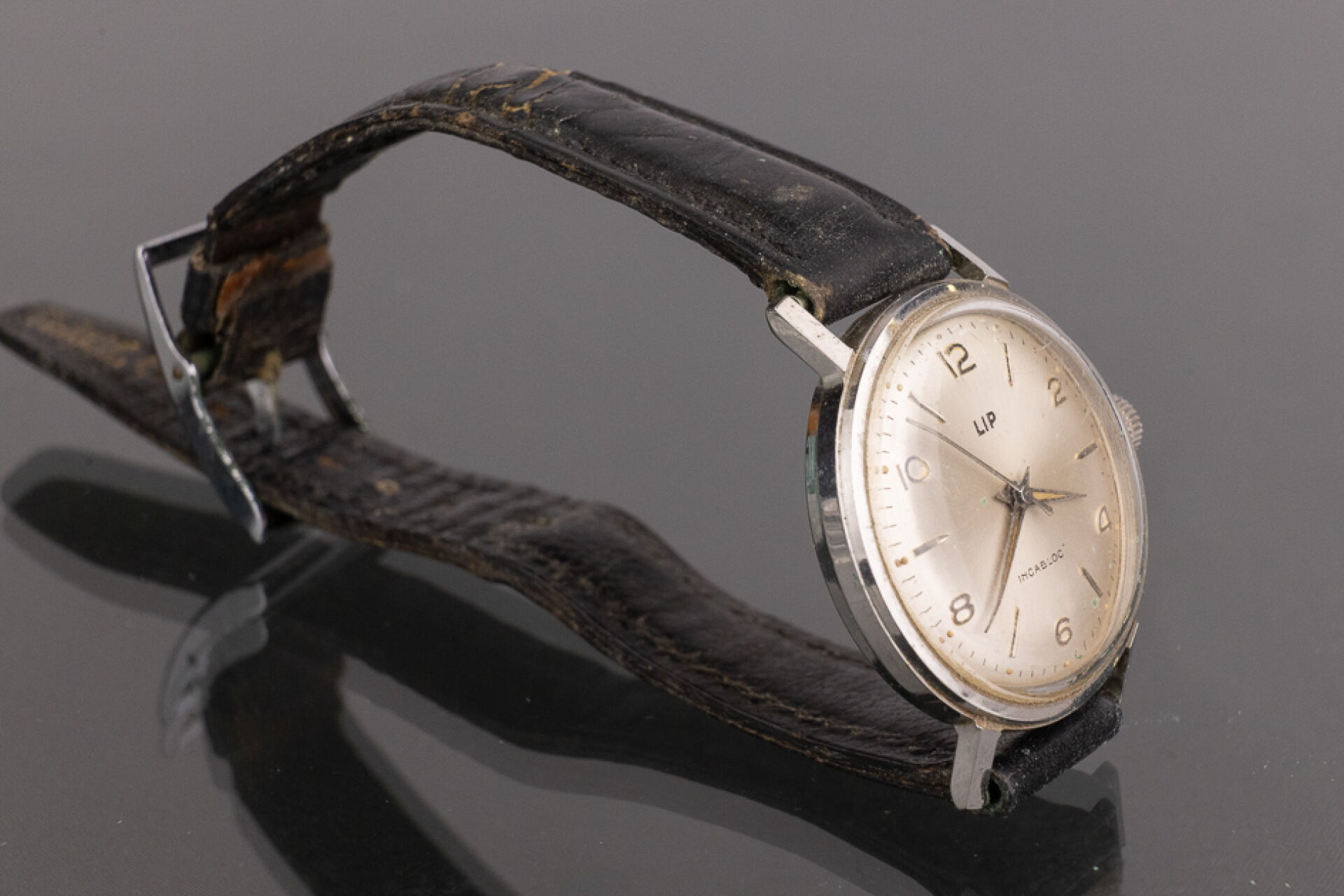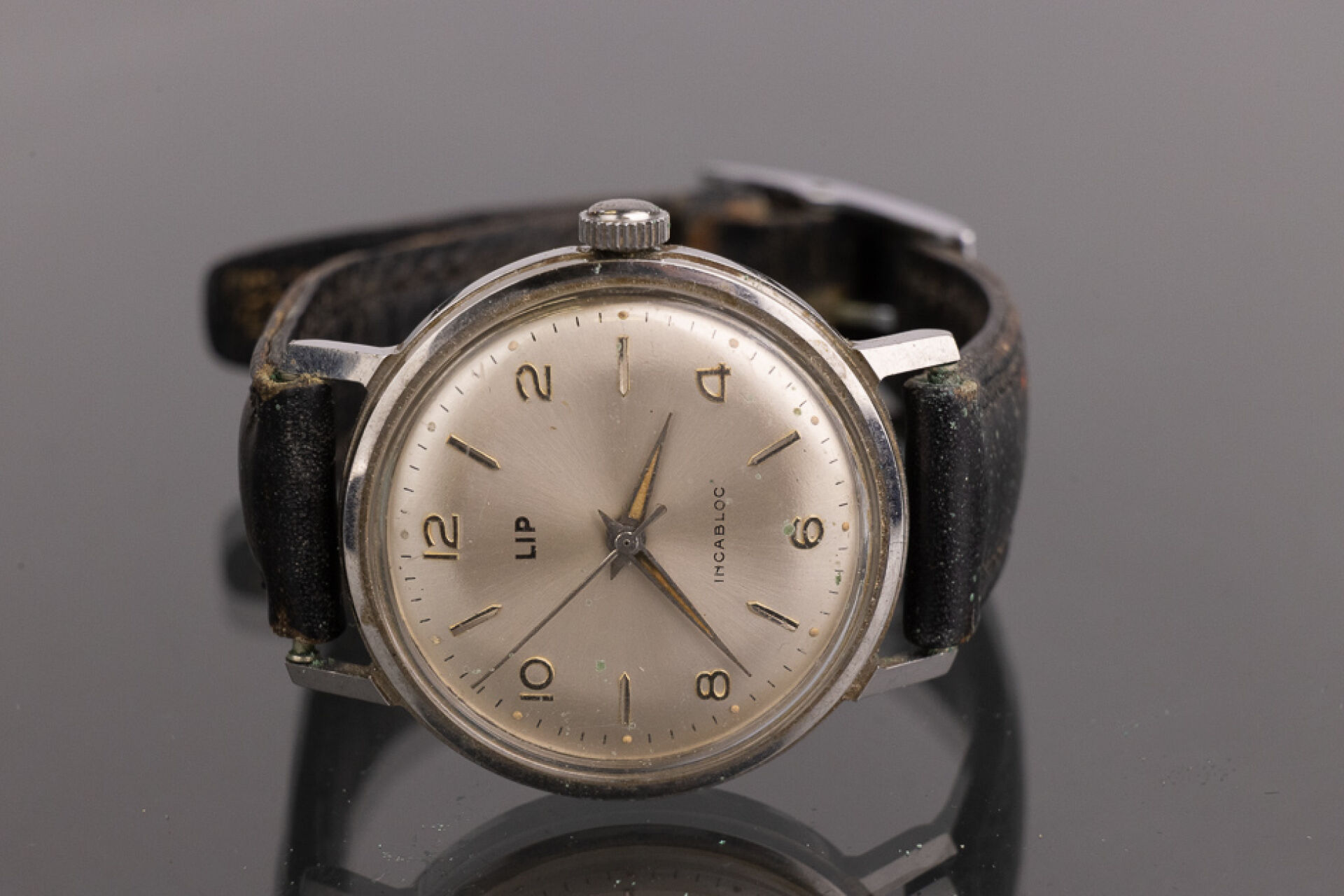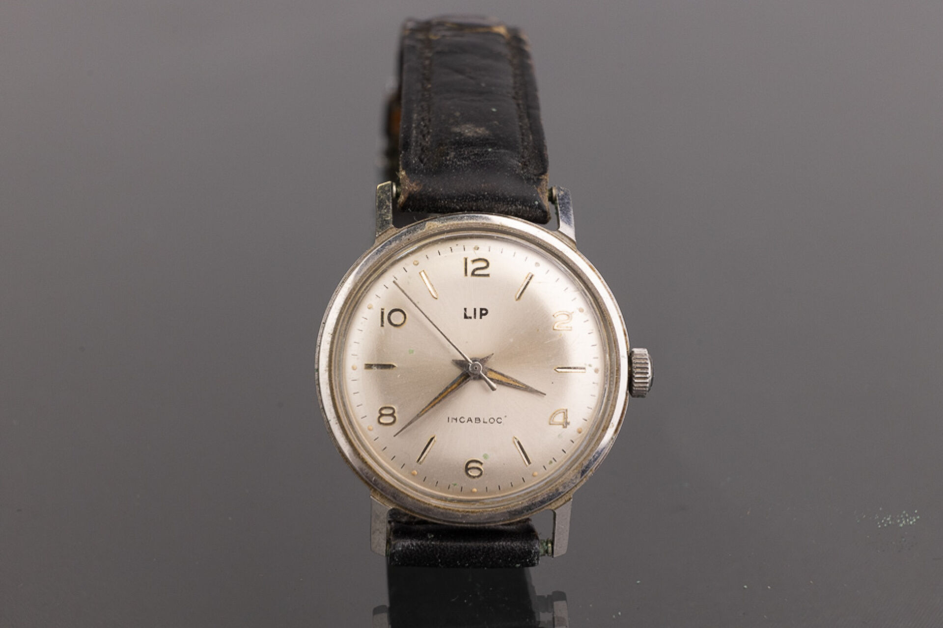 LIP - Montre en acier, cadran à fond métallisé, index bâtons et chiffres arabes, mouvement à quartz, bracelet en cuir noir, boucle ardillon. Diam. : 3.2 cm - N° 9111056 Usures au bracelet, rayures Montre ne fonctionnant pas lors de l'expertise Conditions de vente spécifiques : Veuillez noter que toutes les montres sont vendues en l'état. Aucune garantie n'est faite sur l'état de marche, une révision est donc conseillée. Certaines montres ont été ouvertes pour identifier le type et la qualité du mouvement, y compris les montres résistantes à l'eau, il est donc conseillé à l'acheteur de consulter un horloger pour revoir l'étanchéité de la montre.