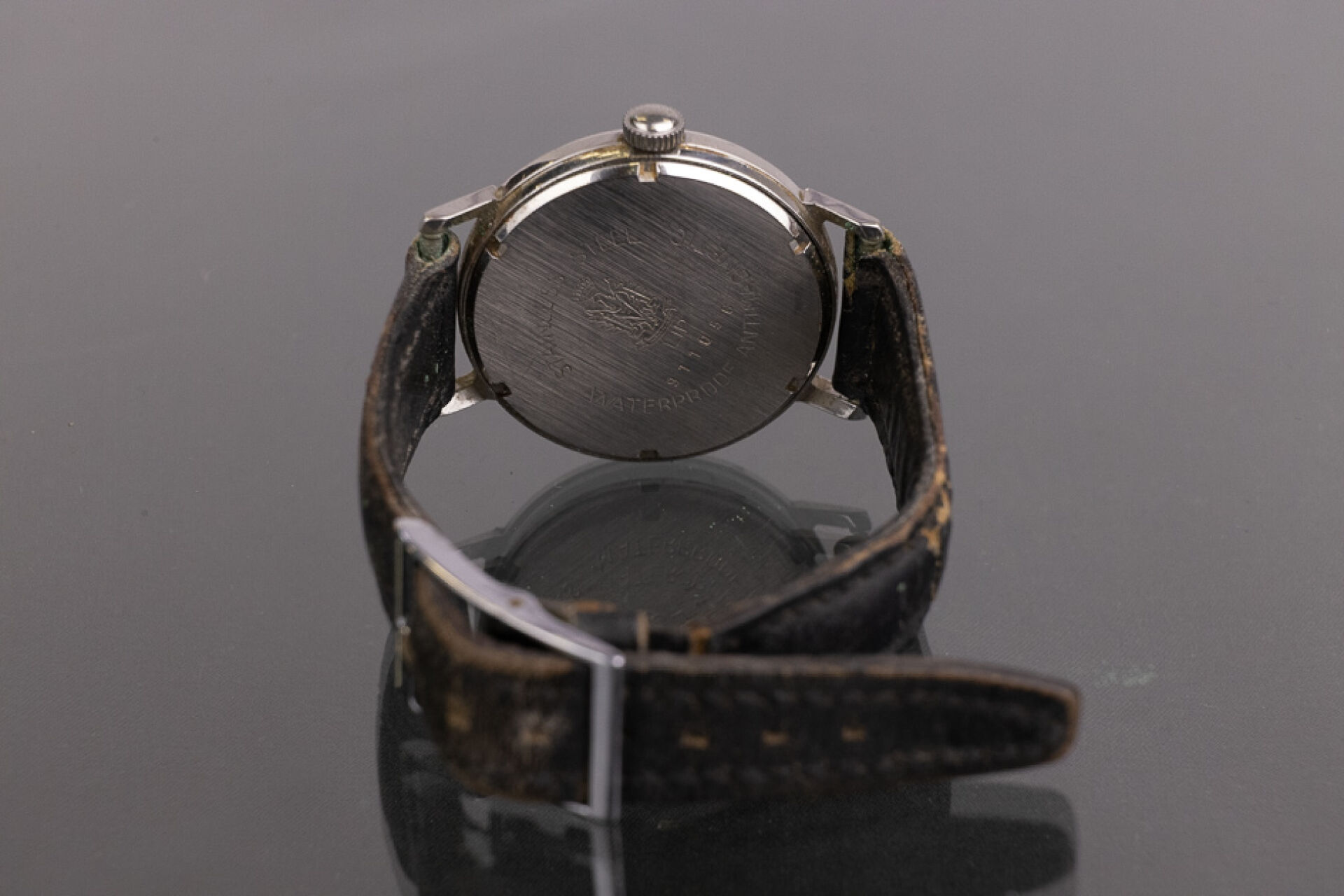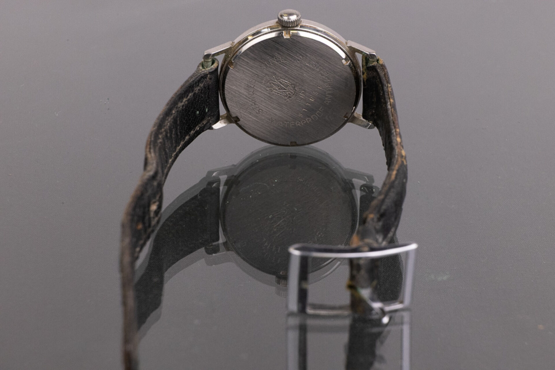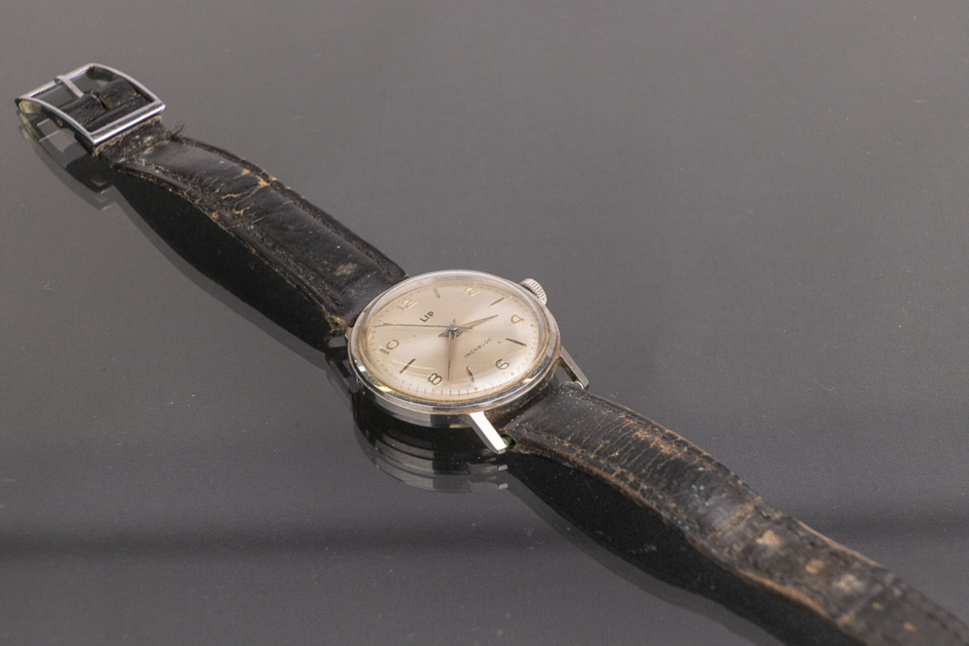 LIP - Montre en acier, cadran à fond métallisé, index bâtons et chiffres arabes, mouvement à quartz, bracelet en cuir noir, boucle ardillon. Diam. : 3.2 cm - N° 9111056 Usures au bracelet, rayures Montre ne fonctionnant pas lors de l'expertise Conditions de vente spécifiques : Veuillez noter que toutes les montres sont vendues en l'état. Aucune garantie n'est faite sur l'état de marche, une révision est donc conseillée. Certaines montres ont été ouvertes pour identifier le type et la qualité du mouvement, y compris les montres résistantes à l'eau, il est donc conseillé à l'acheteur de consulter un horloger pour revoir l'étanchéité de la montre.